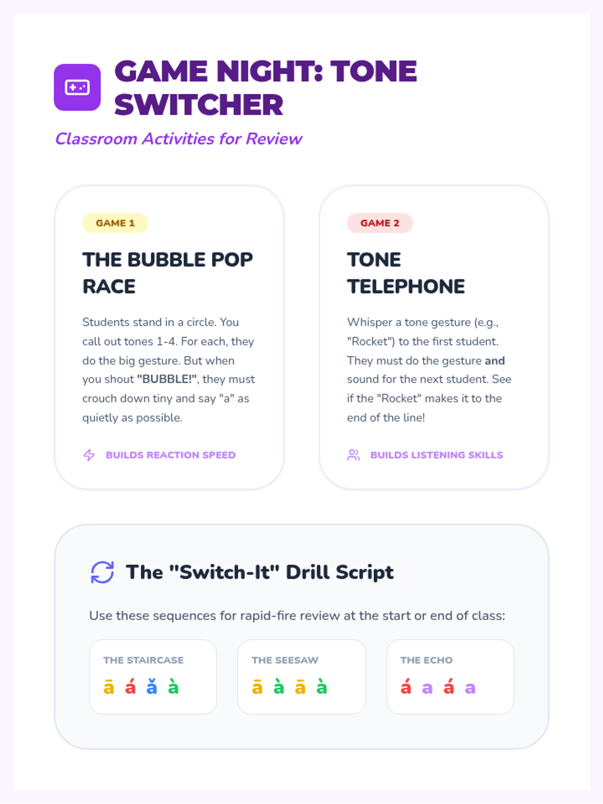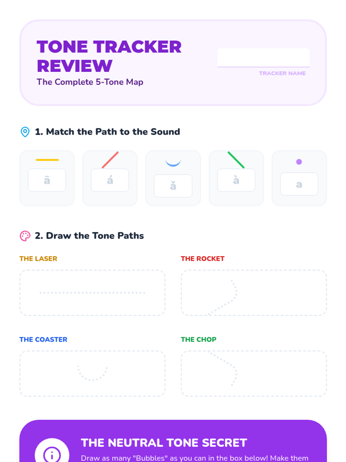 Students are introduced to the neutral tone as a short 'bubble pop' and review all five sounds through rapid switching and combination exercises.