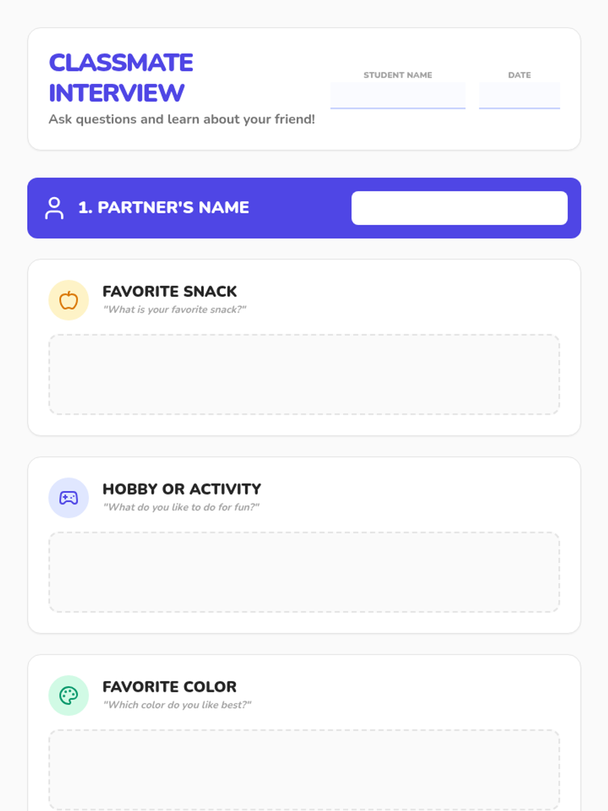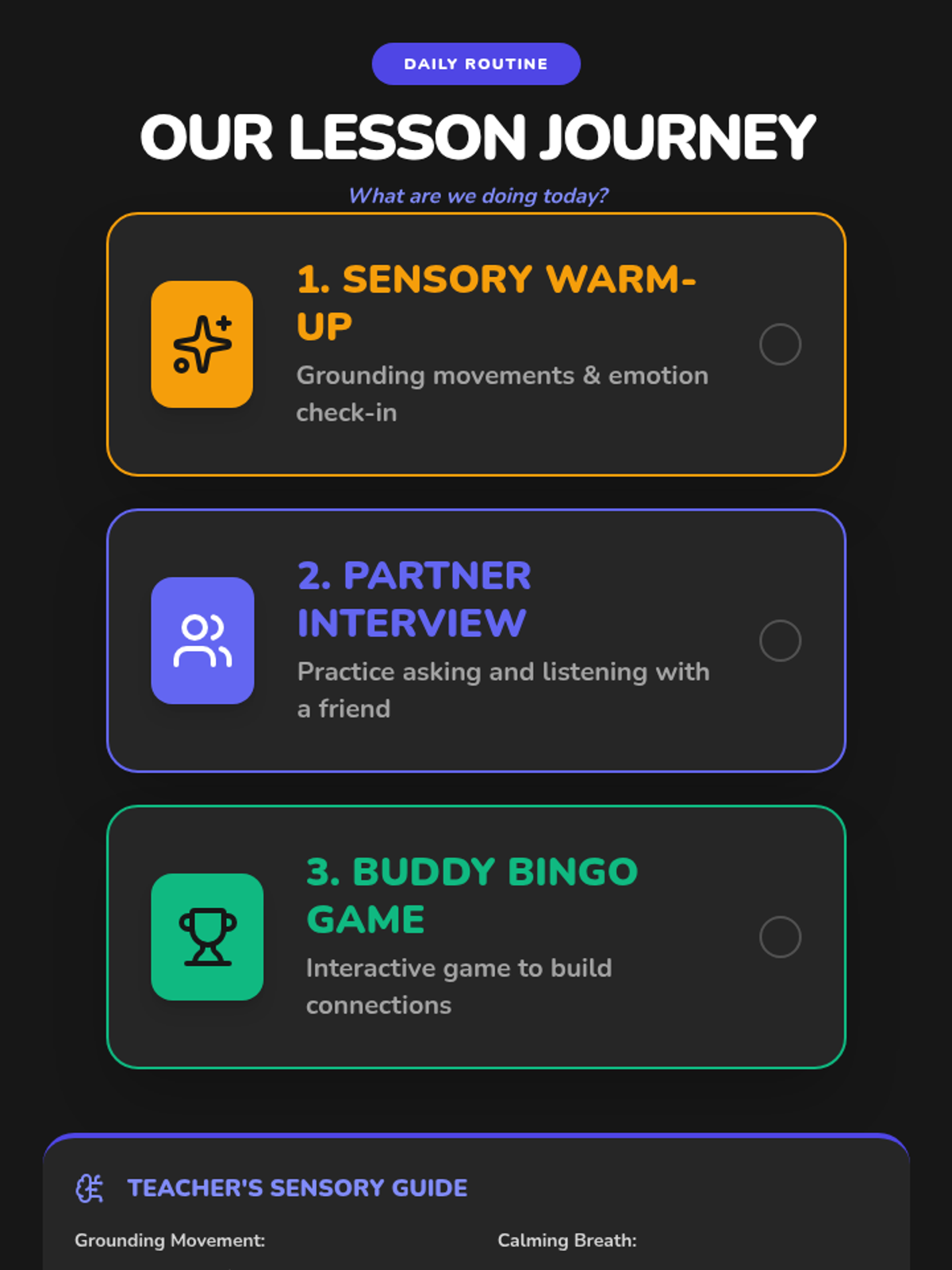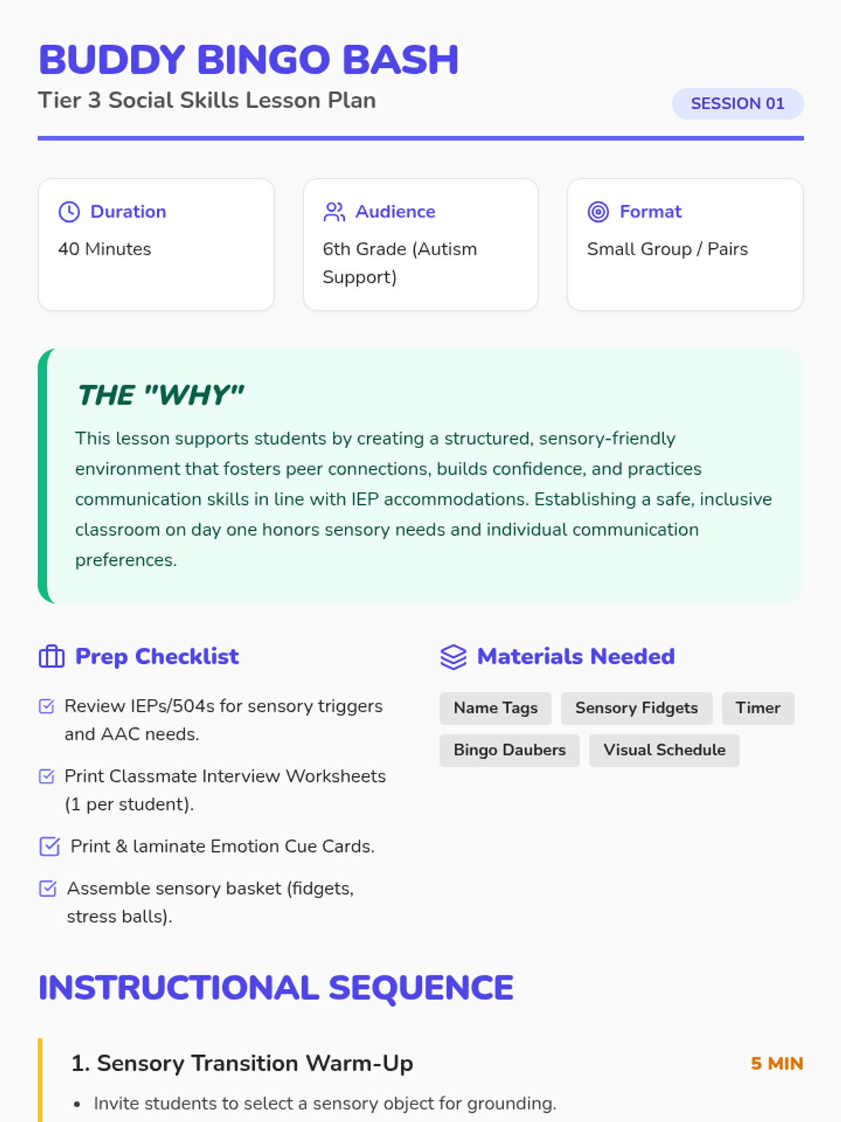 A 40-minute introductory session for 6th-grade students with autism, focusing on building social connections through sensory-friendly activities, structured interviews, and a bingo game.