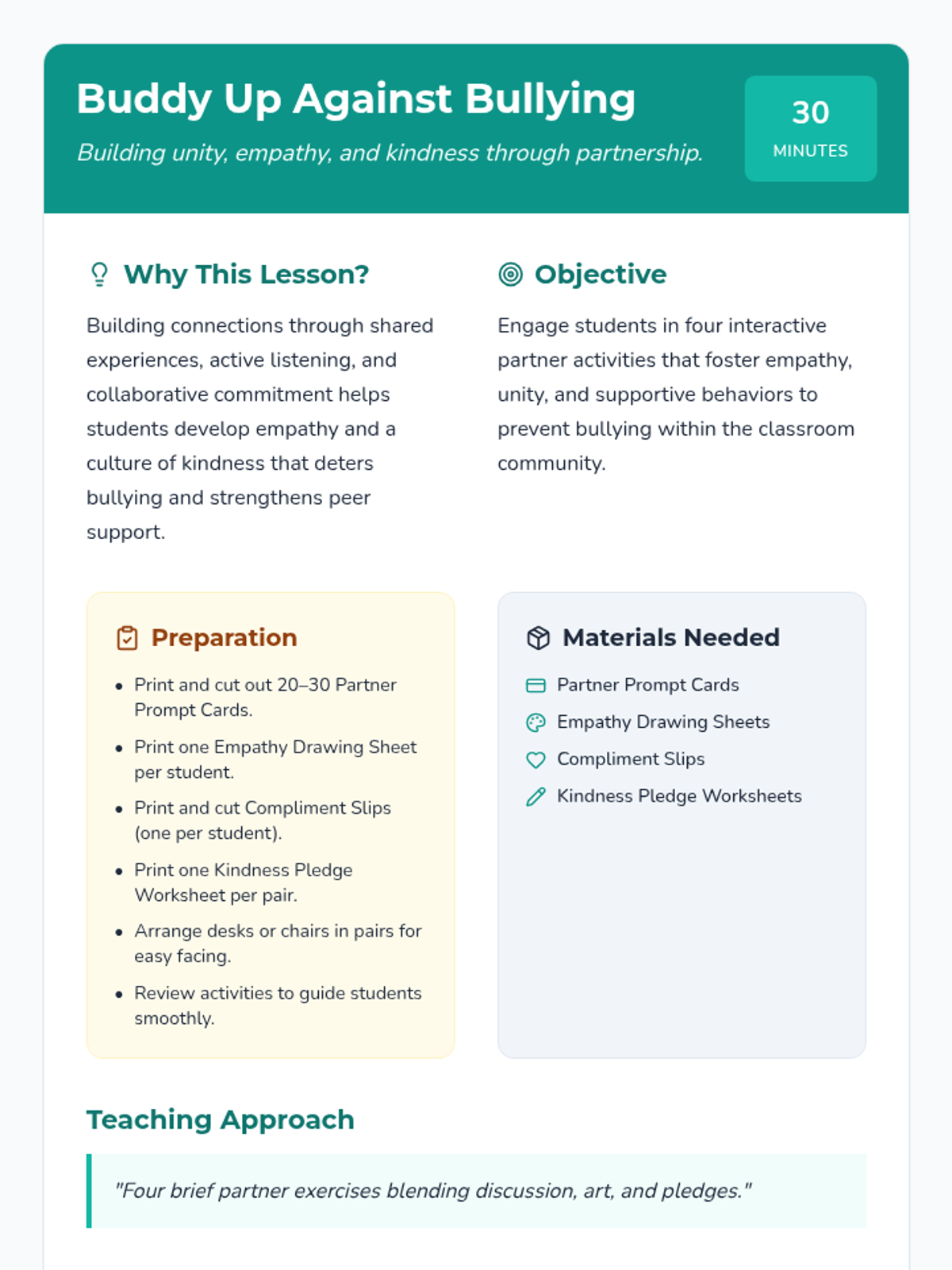A 30-minute Tier 1 lesson focused on building classroom unity and empathy through four collaborative partner activities to prevent bullying.
