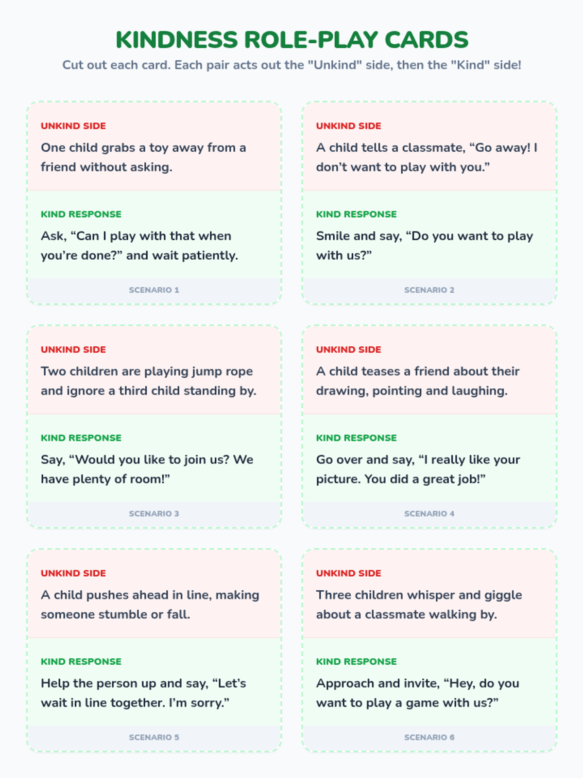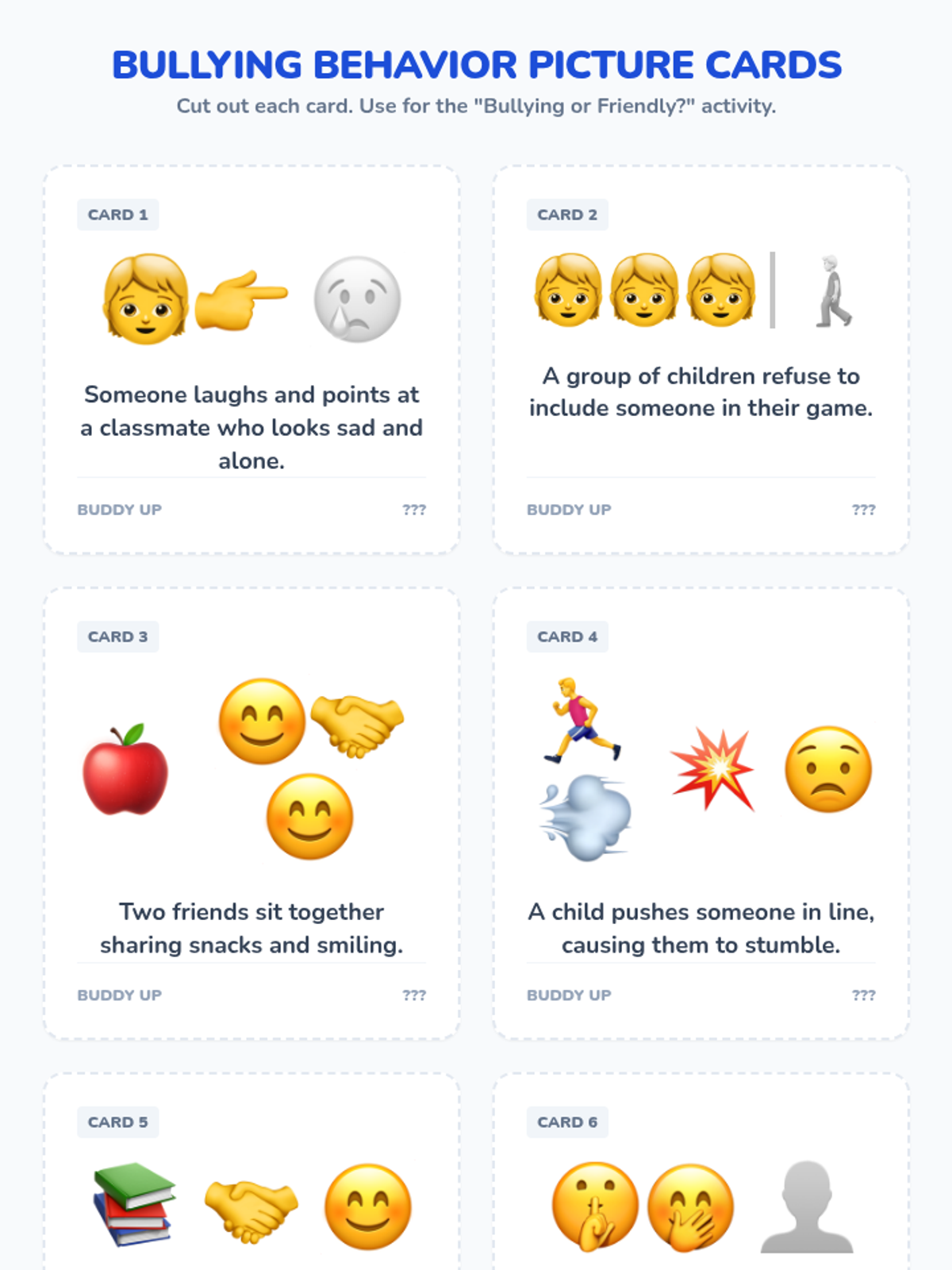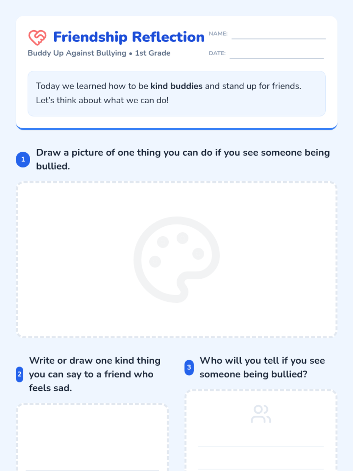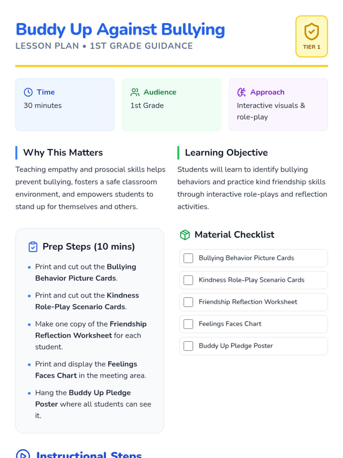A 30-minute Tier 1 guidance lesson for 1st graders to recognize bullying behaviors and practice friendship skills through interactive role-plays and reflection.