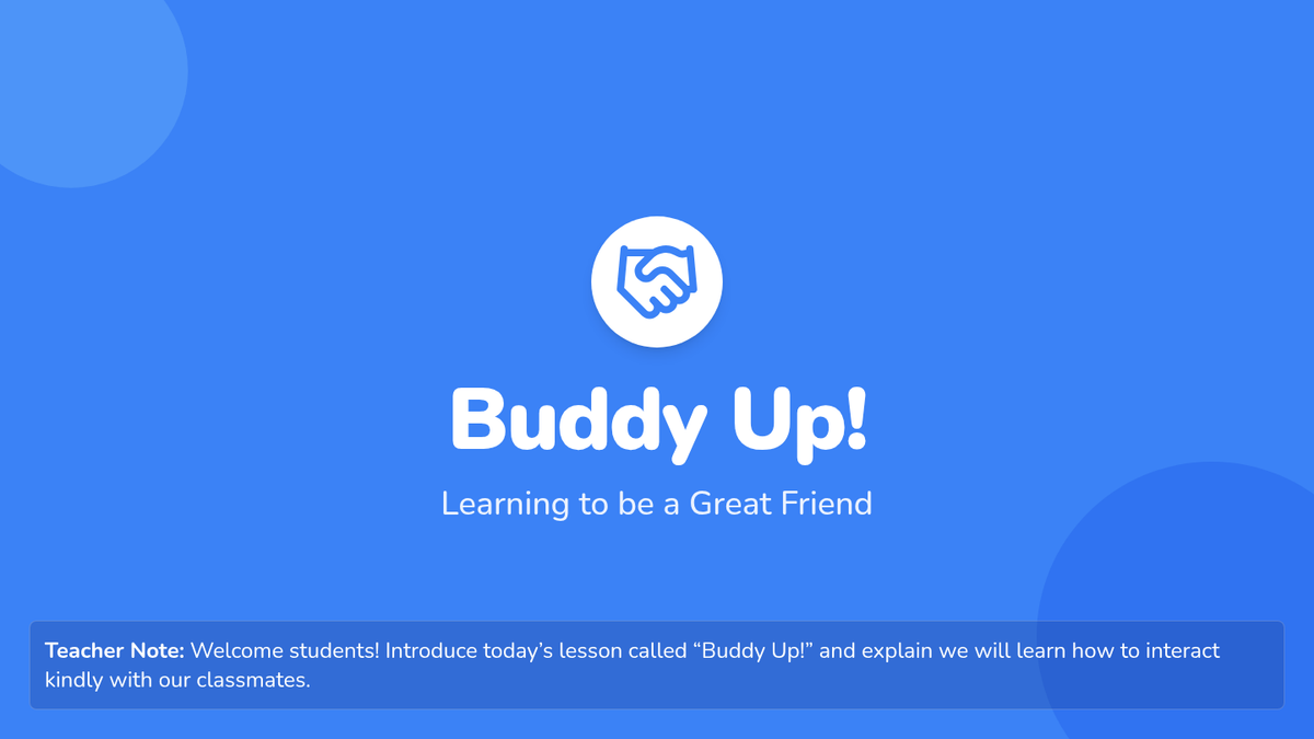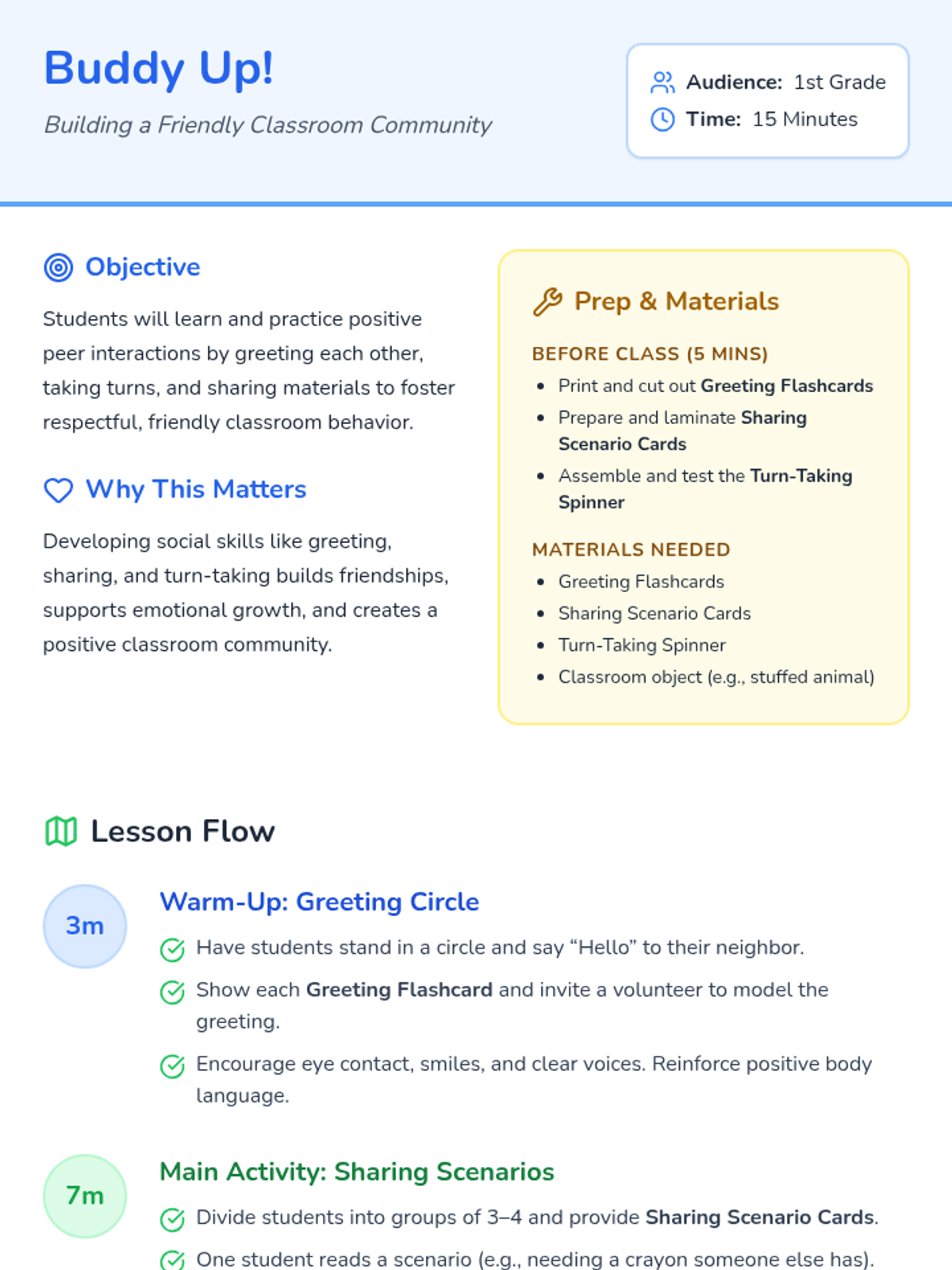 A 15-minute 1st grade lesson on positive peer interactions, focusing on greetings, sharing, and taking turns to build a friendly classroom community.