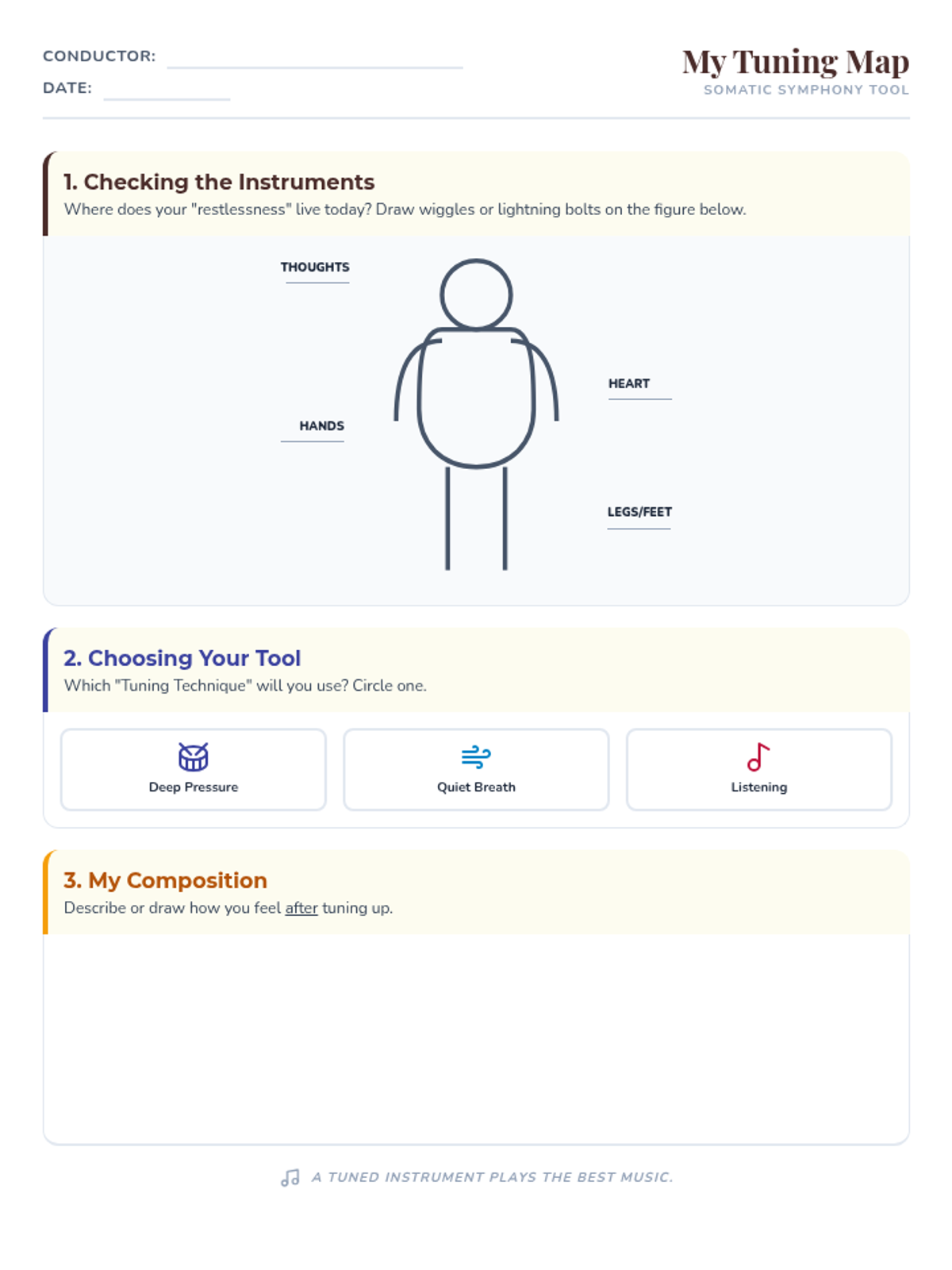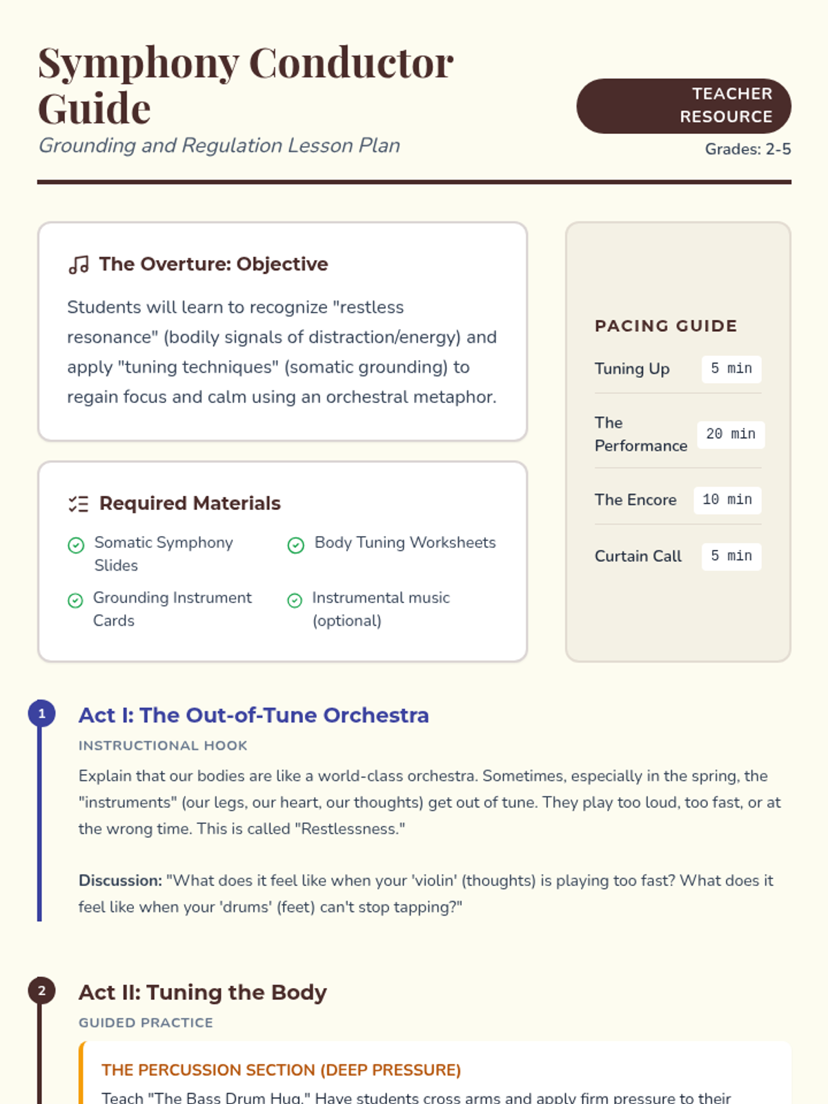 A grounding and regulation lesson for elementary students using an orchestra metaphor to manage spring restlessness through deep pressure, rhythmic movement, and auditory grounding.
