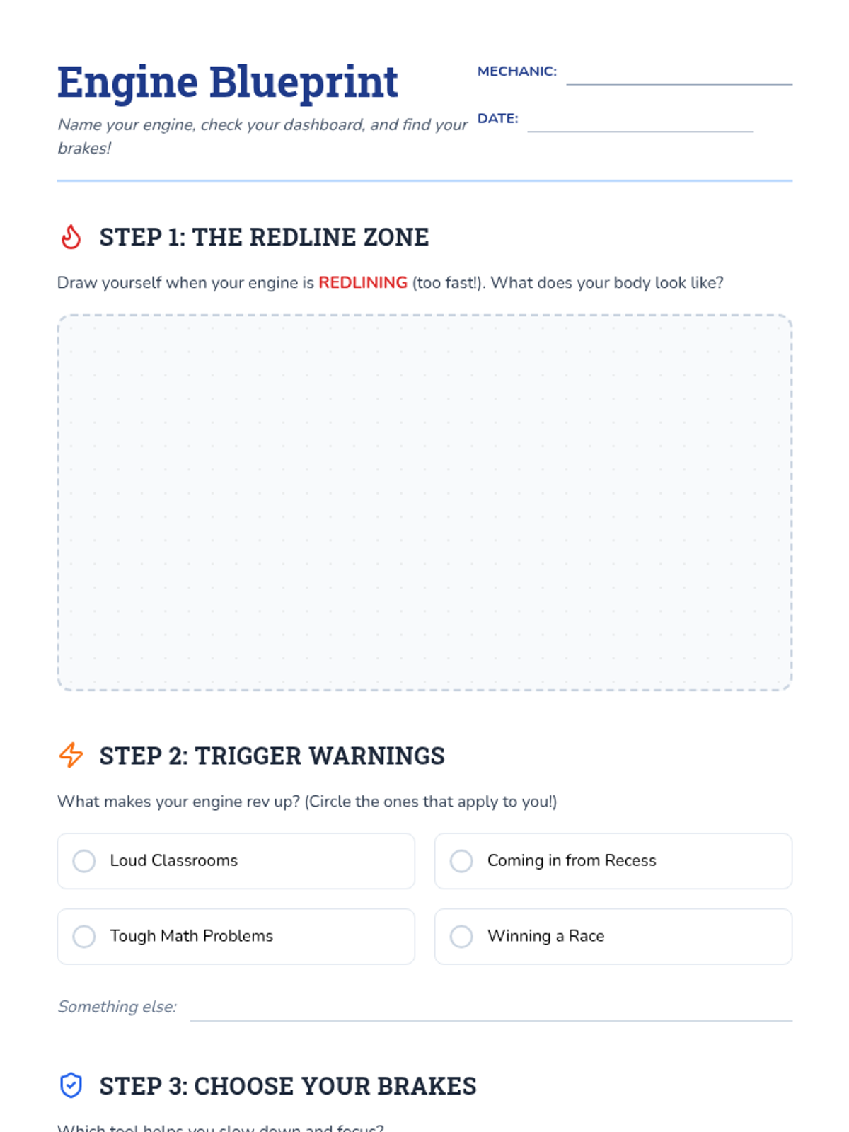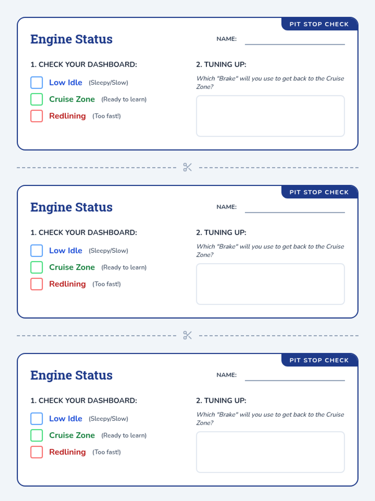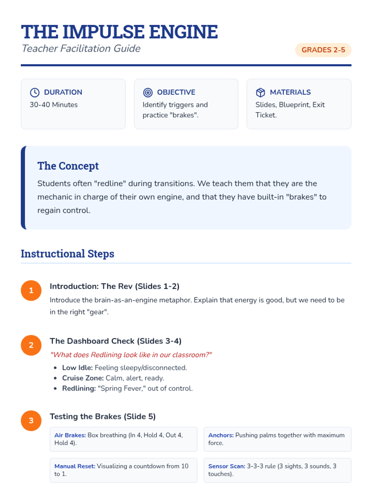 A self-regulation lesson for elementary students using a mechanical metaphor to help them identify high-energy states and apply 'braking' techniques to regain focus during transitions.