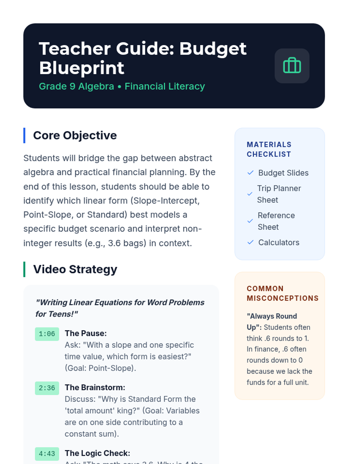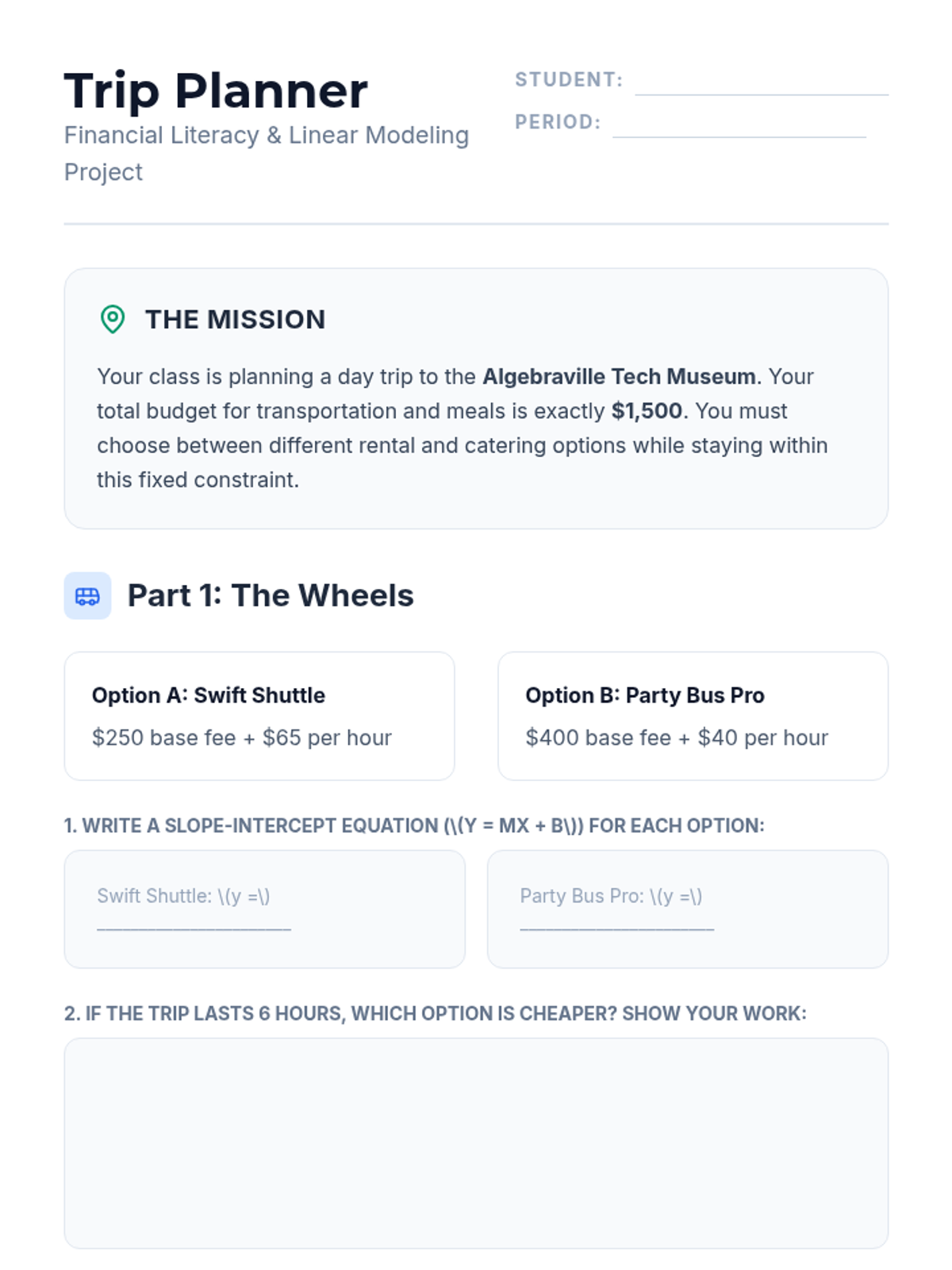 Students apply linear equation forms (Slope-Intercept, Point-Slope, and Standard) to real-world financial scenarios, focusing on budgeting for a class trip and interpreting mathematical results within practical constraints.