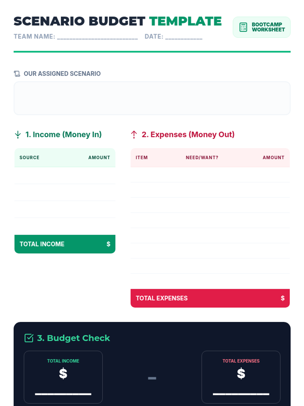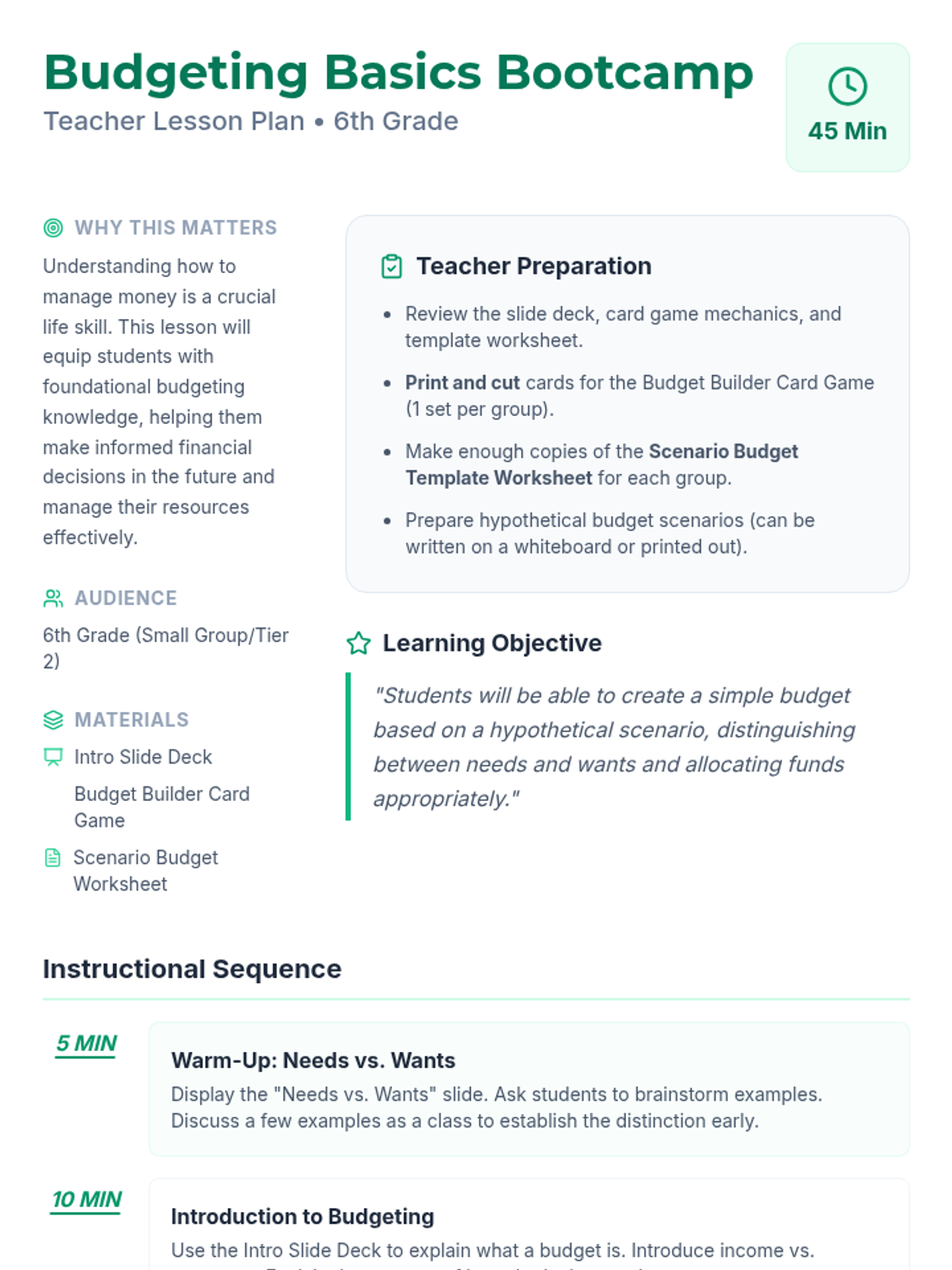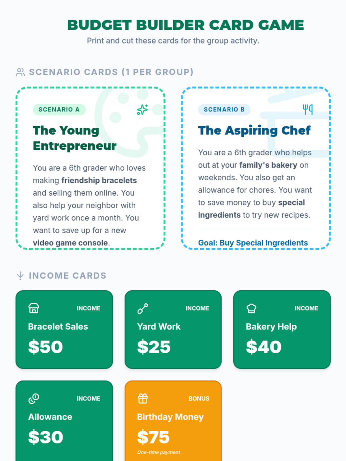 A 45-minute hands-on budgeting workshop where 6th-grade students collaborate in small groups to manage hypothetical income and expenses. Students practice distinguishing between needs and wants while navigating real-world financial scenarios.