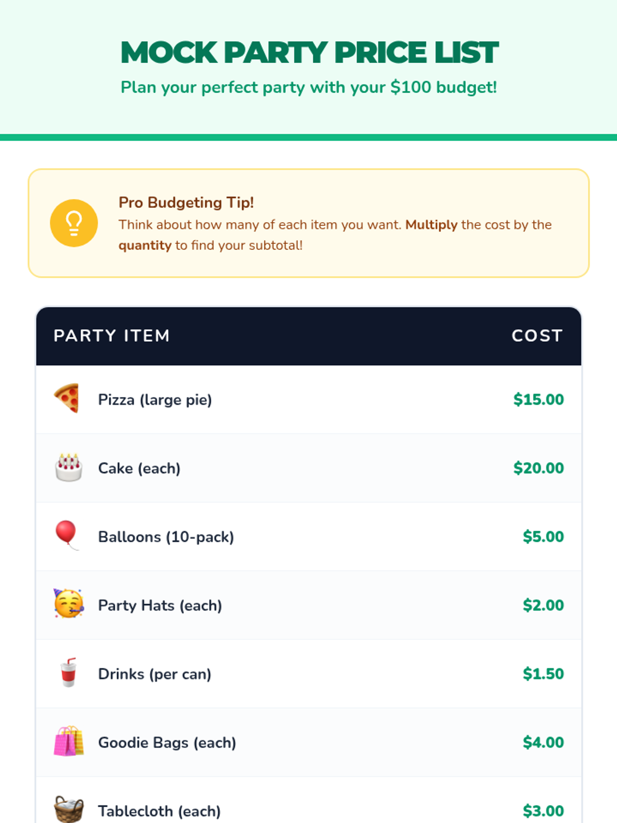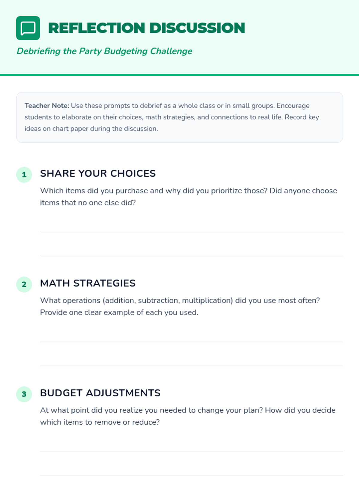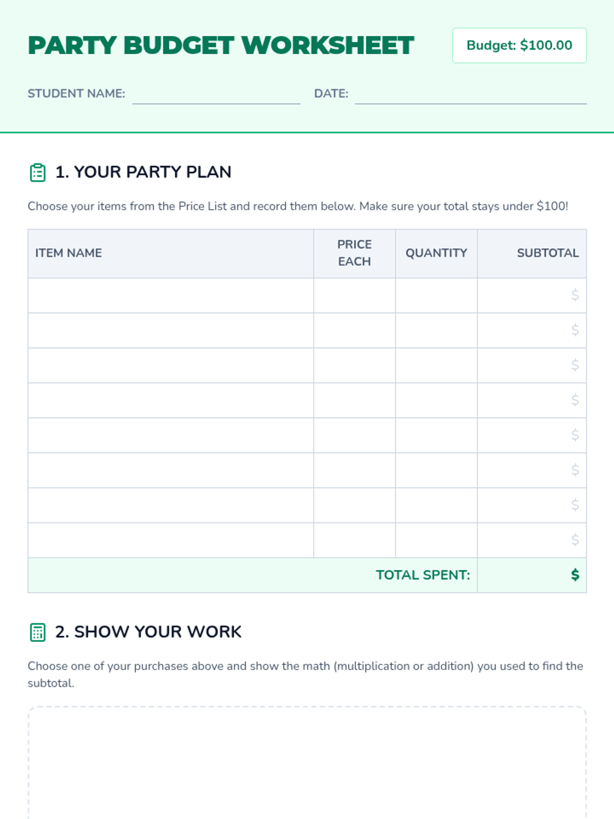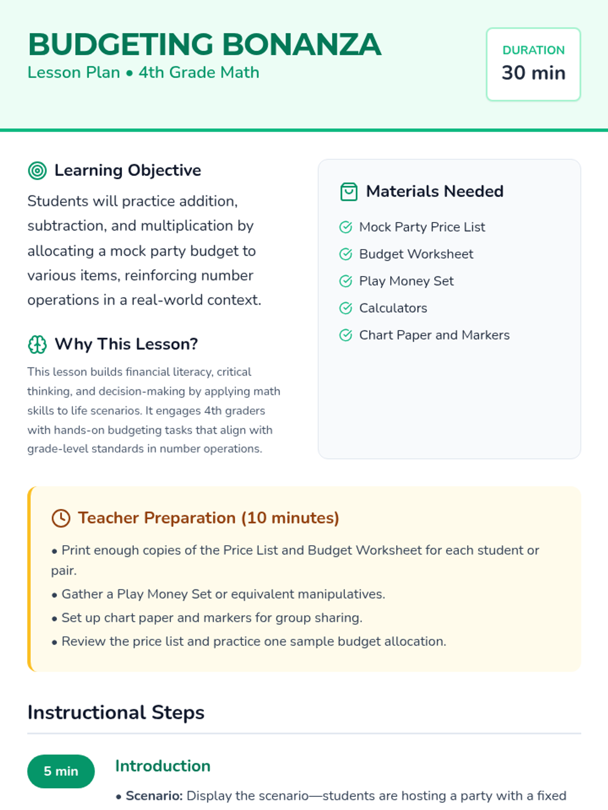 A 30-minute 4th grade math lesson where students practice addition, subtraction, and multiplication by planning a mock party with a $100 budget.