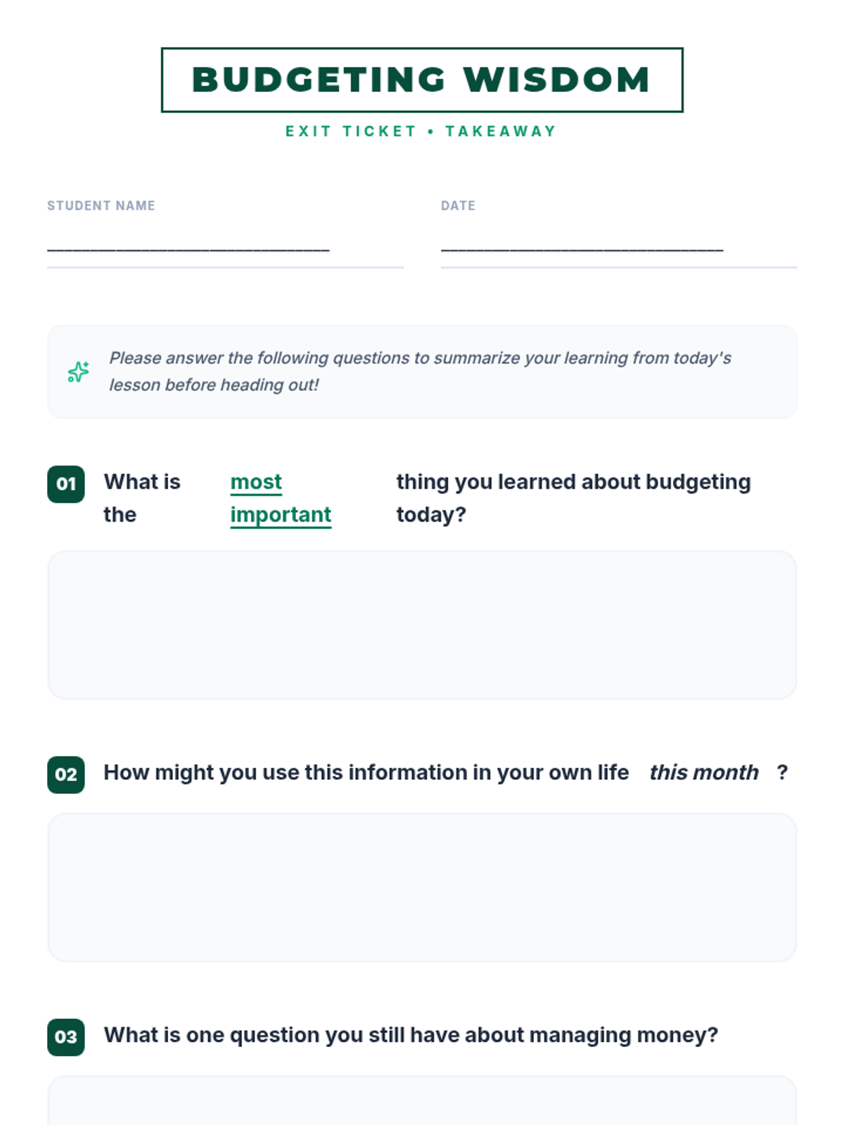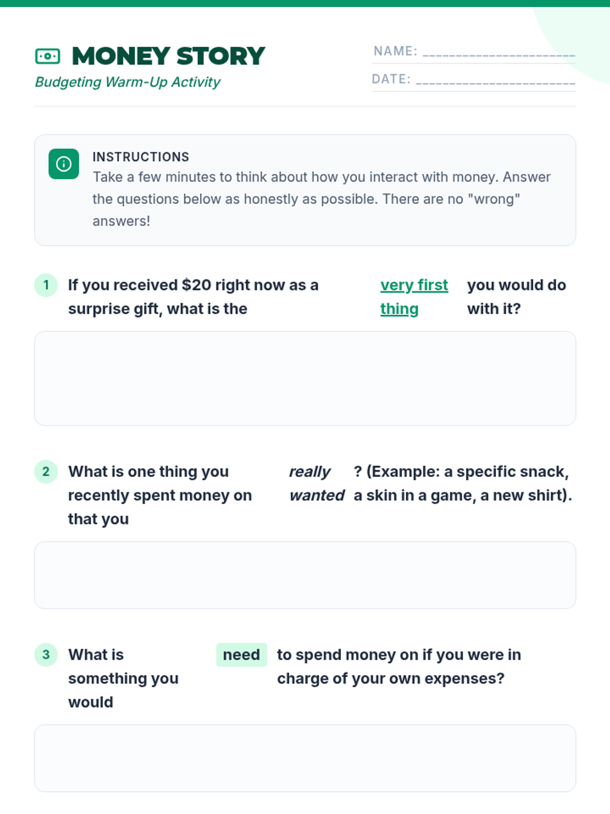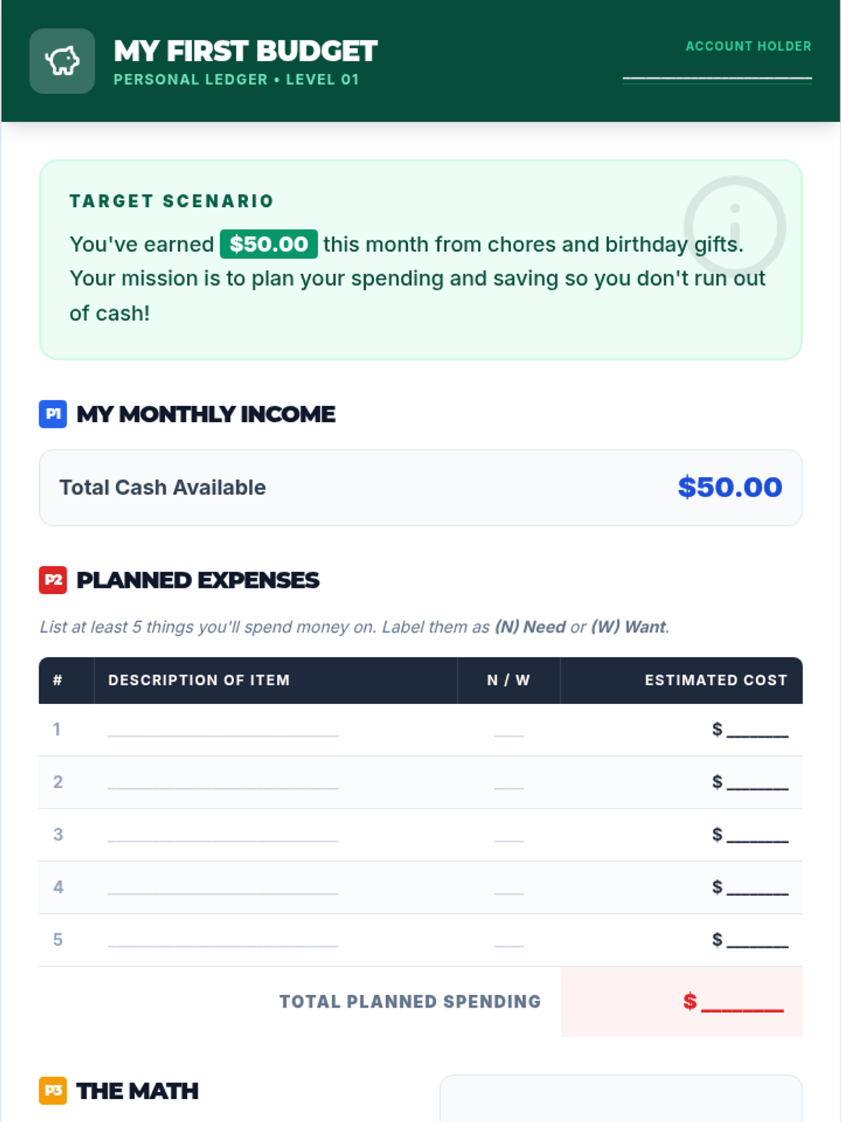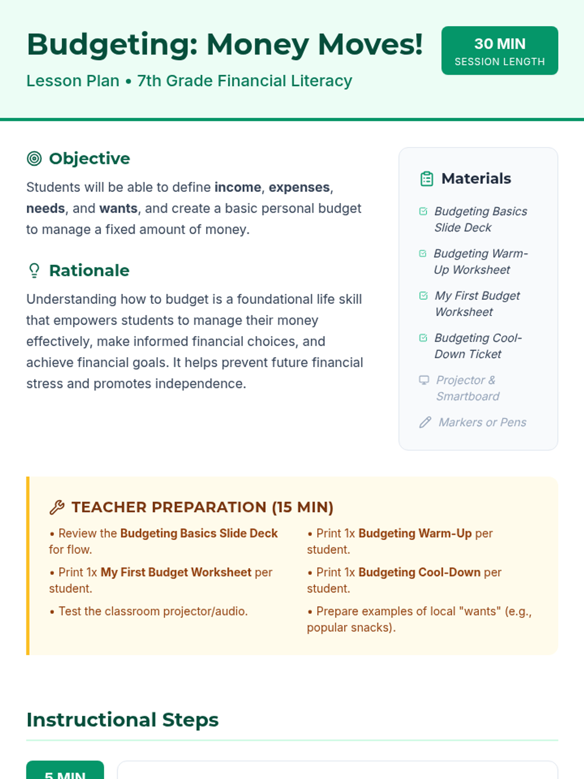 A 30-minute introductory lesson on personal budgeting for 7th graders, covering income, expenses, and the difference between needs and wants.