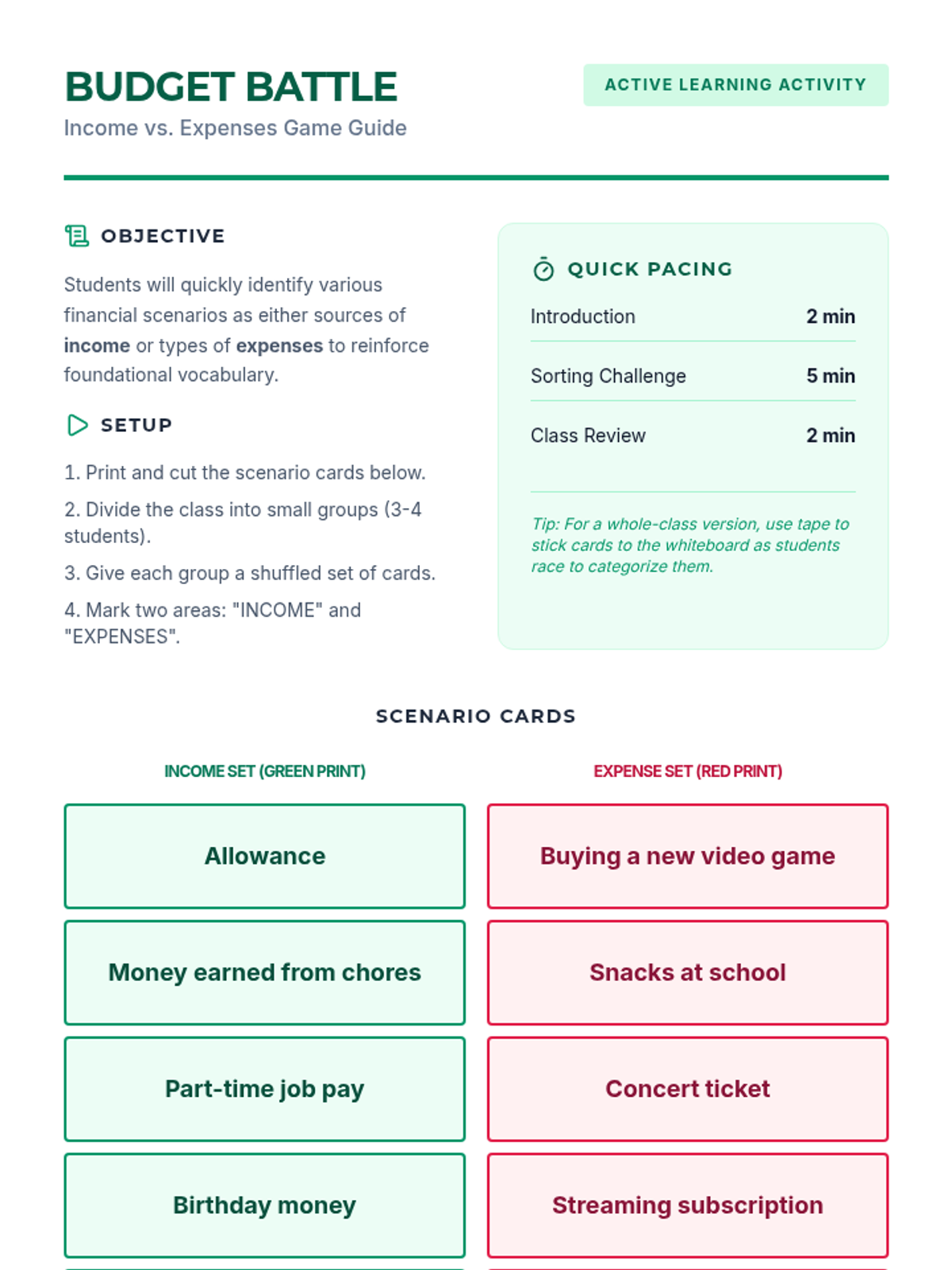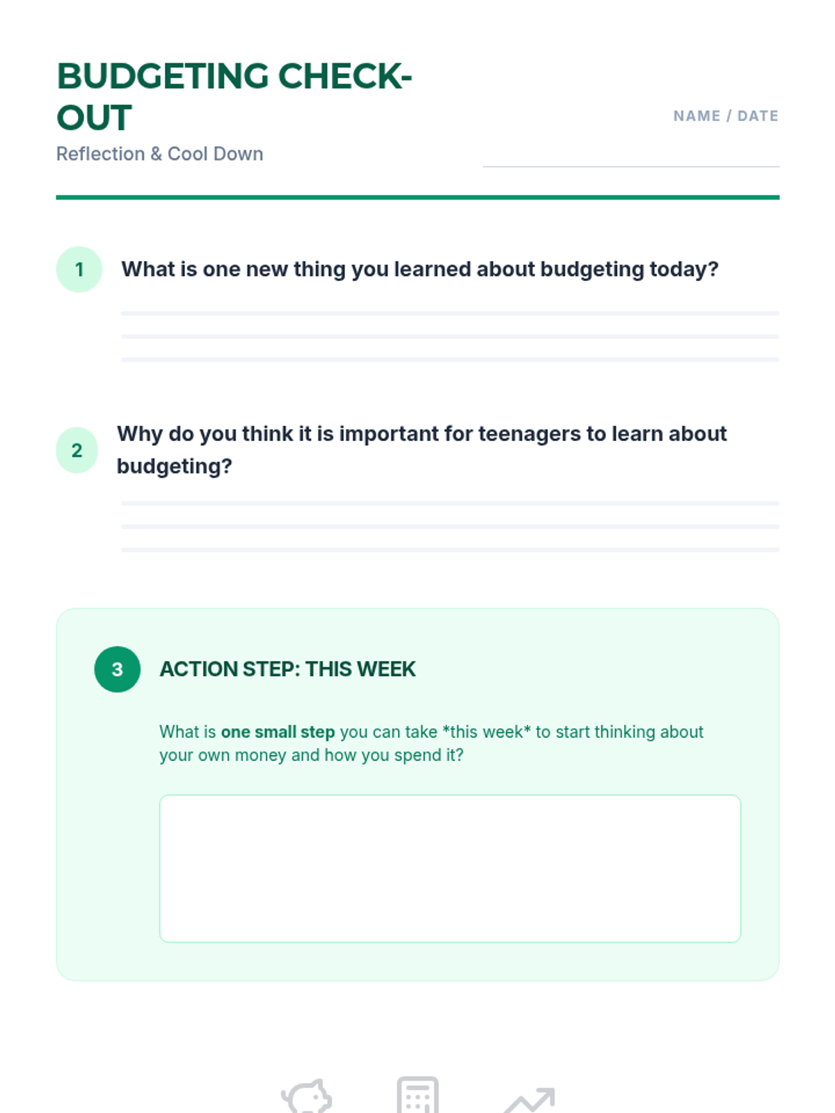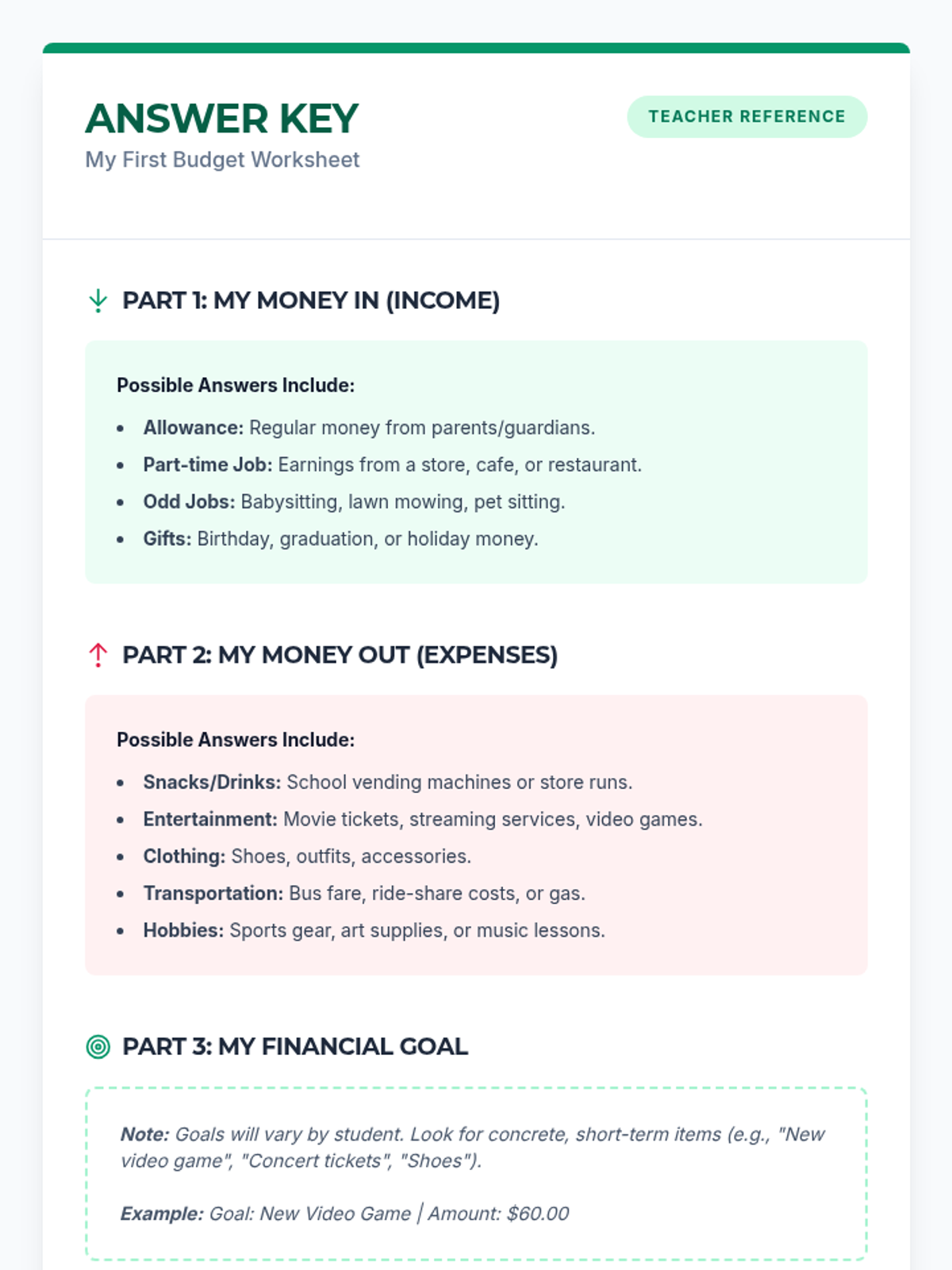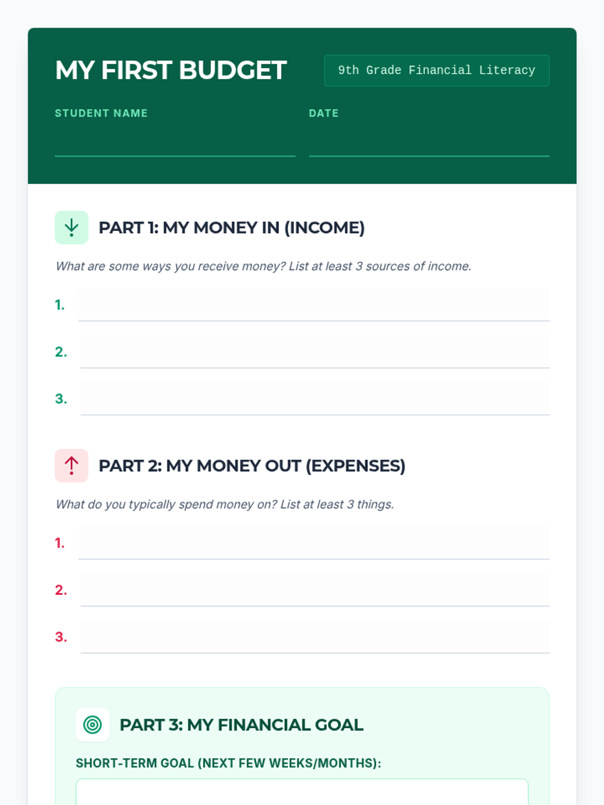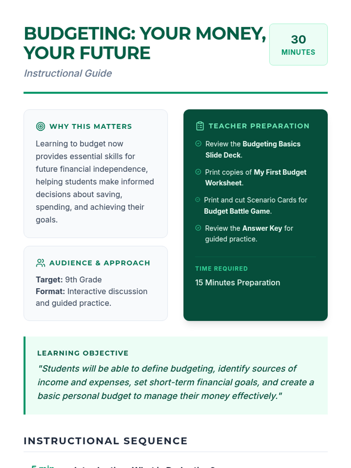 A 30-minute introductory lesson on personal budgeting for 9th-grade students, covering income, expenses, and financial goal-setting.