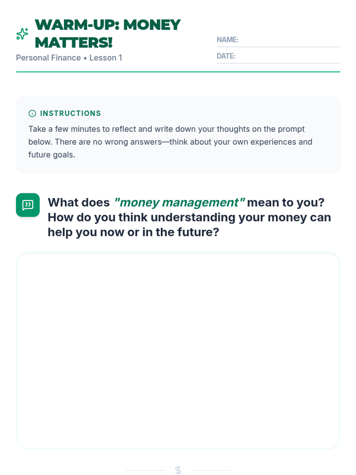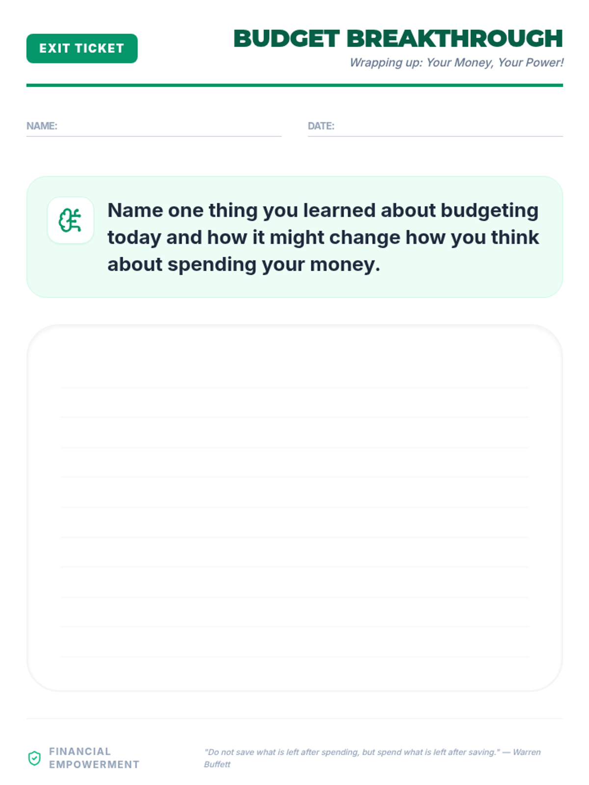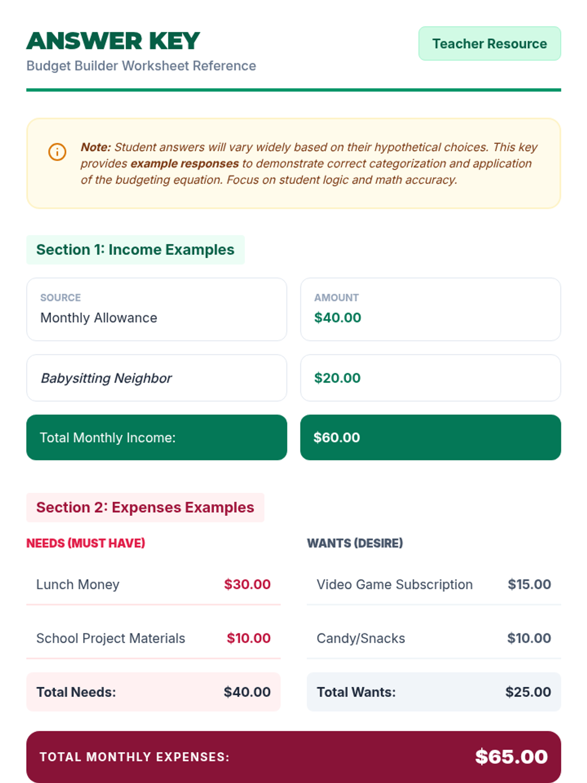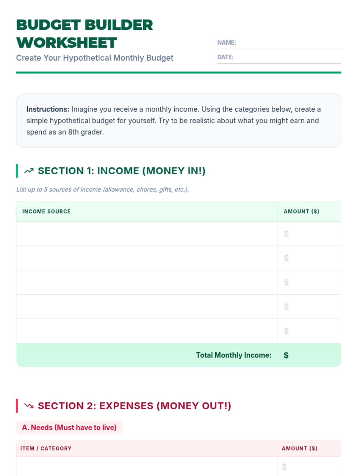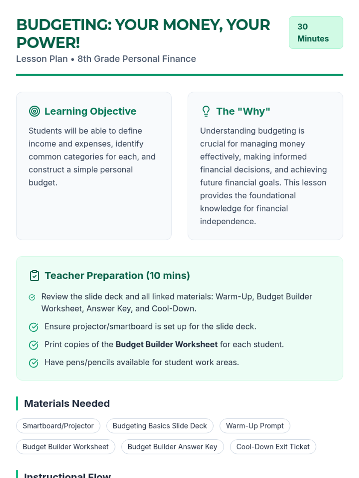 An introductory lesson on personal budgeting for 8th graders, covering income, expenses (needs vs. wants), and the basic budgeting equation.