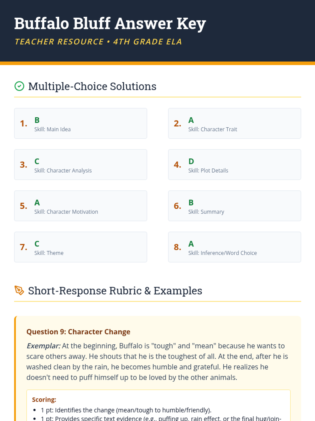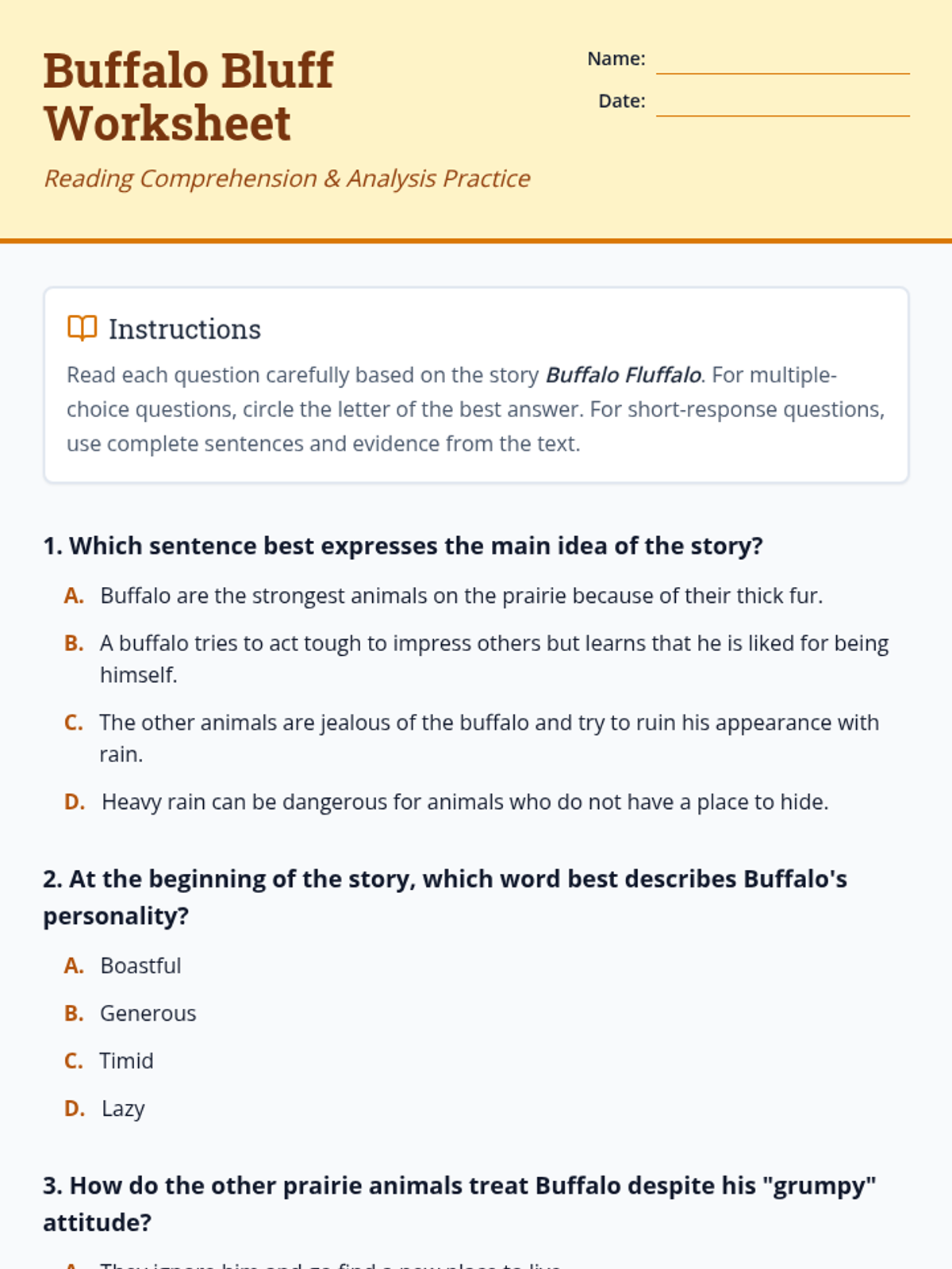 A comprehensive reading analysis lesson centered on "Buffalo Fluffalo," focusing on identifying character traits, determining theme, and summarizing the main idea through state-assessment style practice.