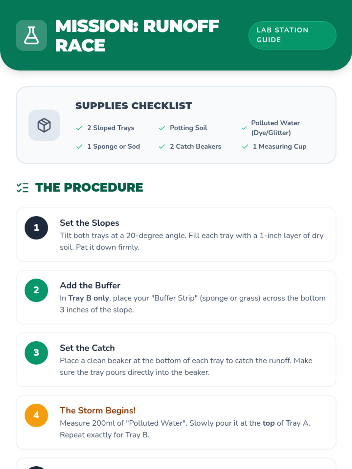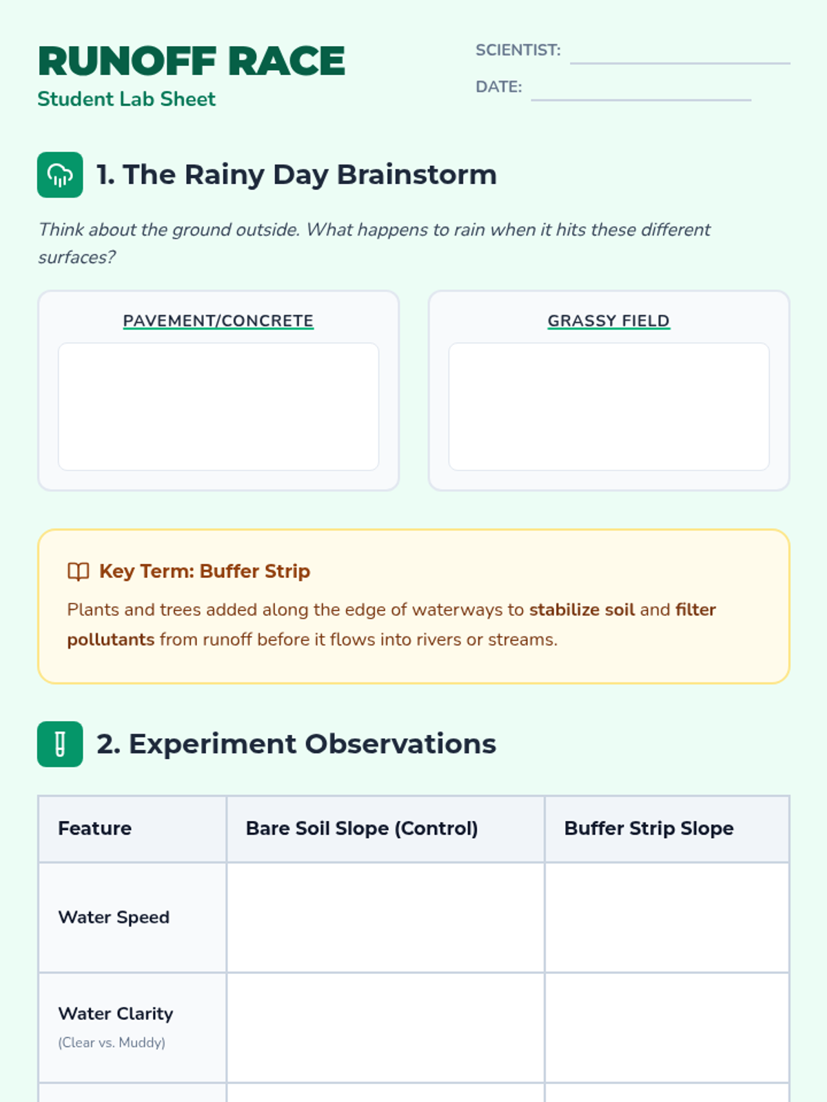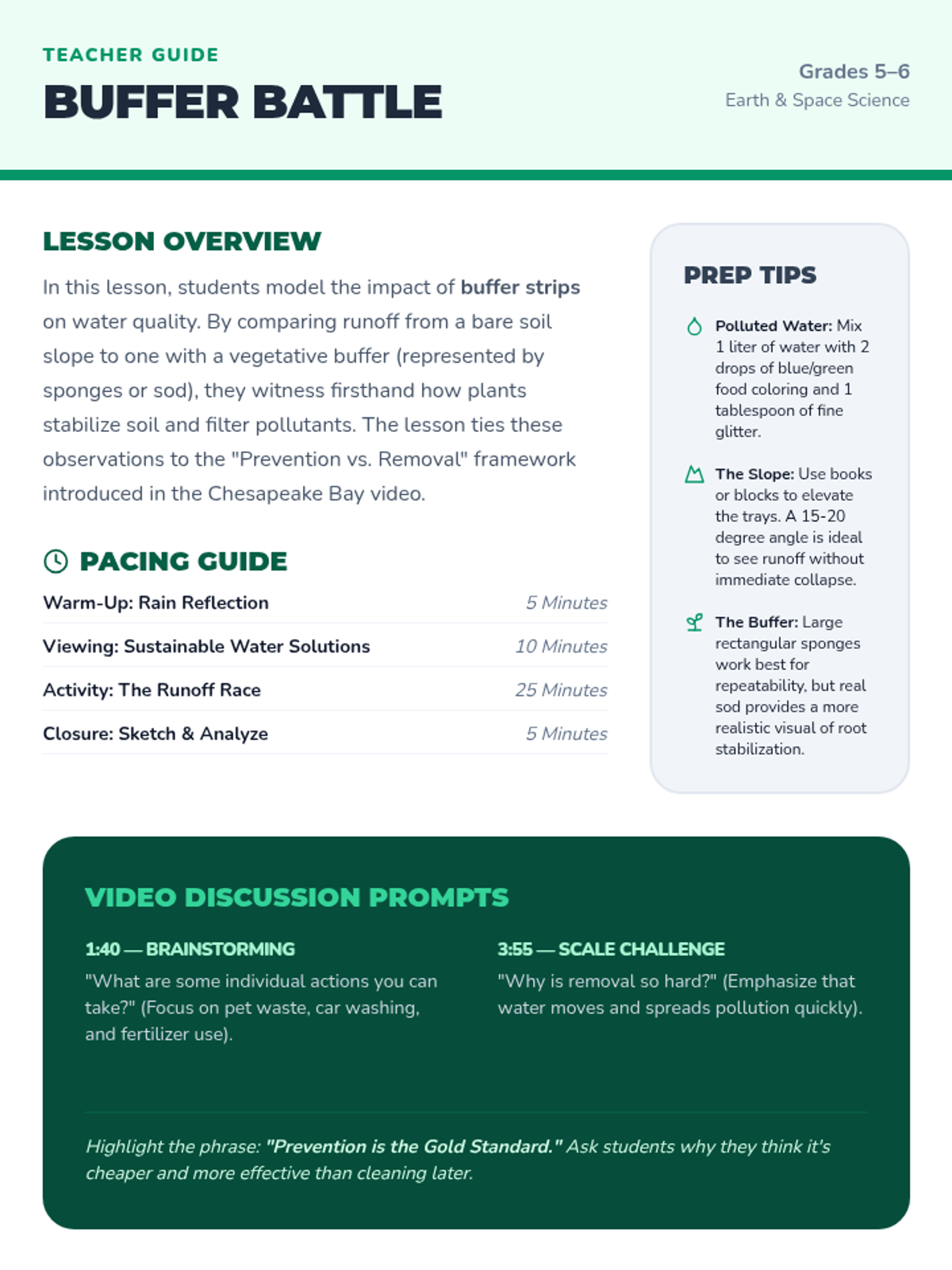 Students explore how buffer strips prevent water pollution by building models of sloped terrain with and without vegetation. They will use a provided video to understand the context of the Chesapeake Bay and the importance of prevention as the 'gold standard' for water protection.