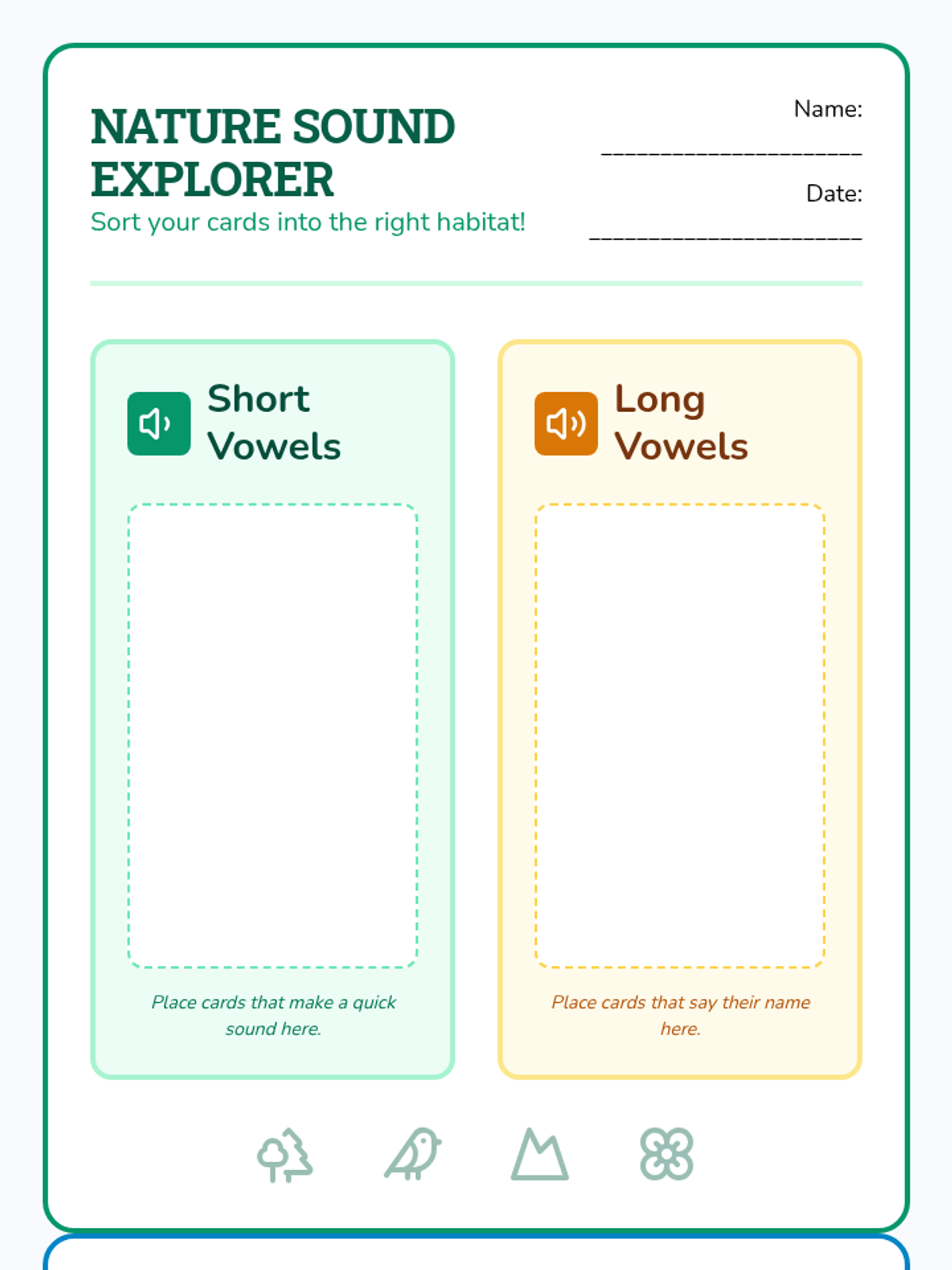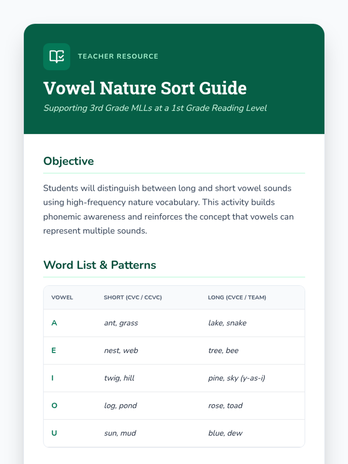 A phonics-focused lesson for multilingual learners to identify and sort long and short vowel sounds using nature-themed vocabulary and imagery.