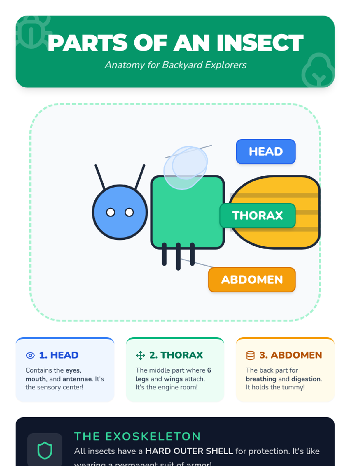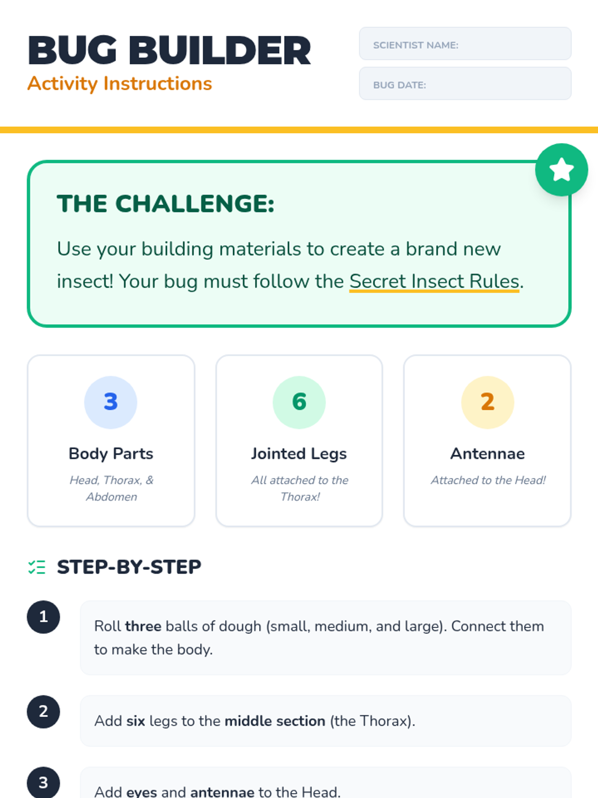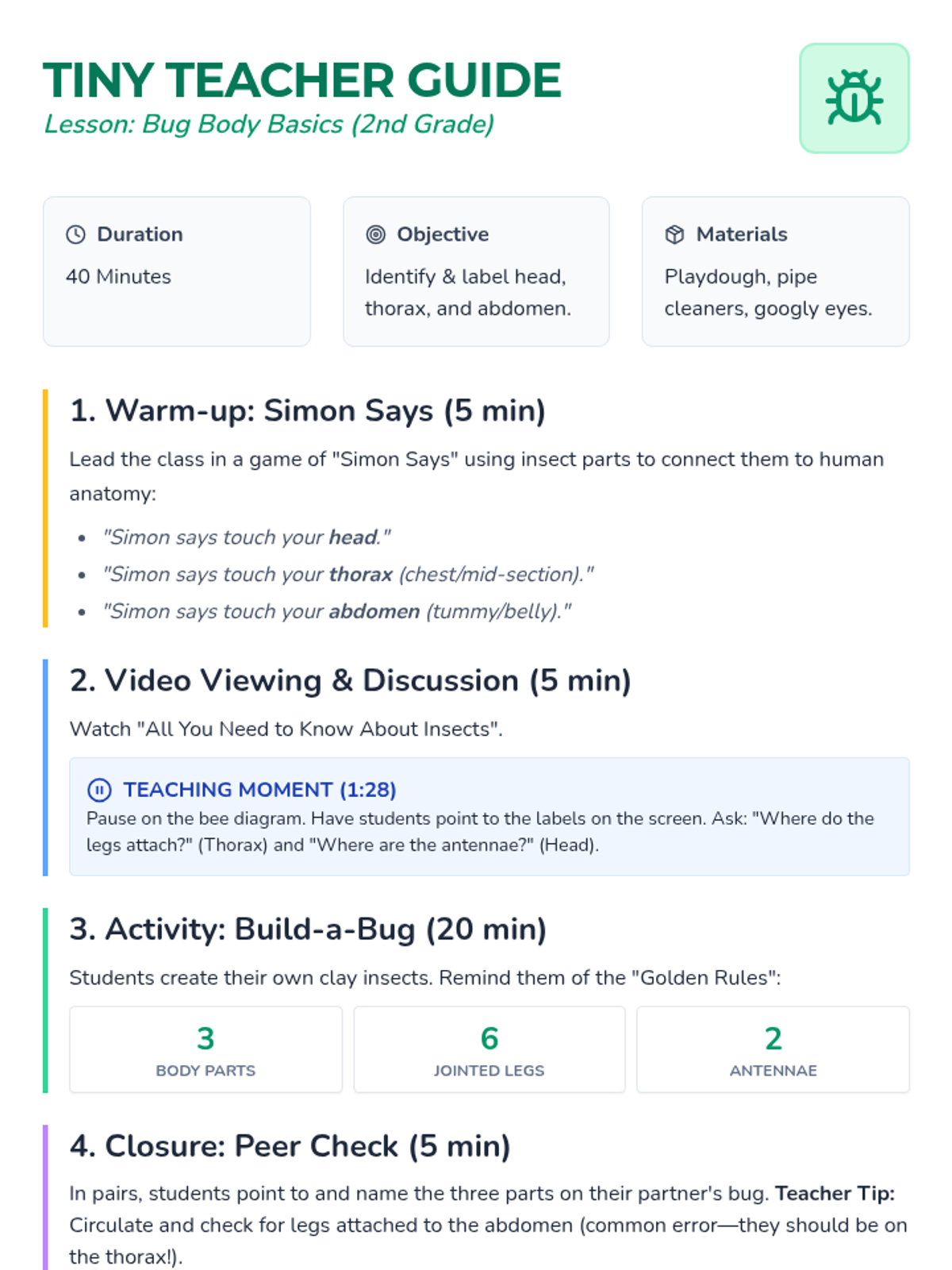 A hands-on science lesson for 2nd graders to identify and label the three main body parts of an insect (head, thorax, and abdomen) using a video and a playdough building activity.