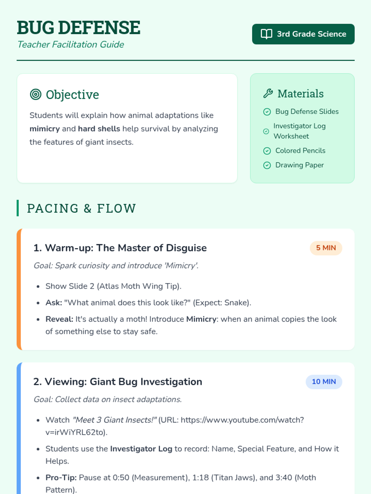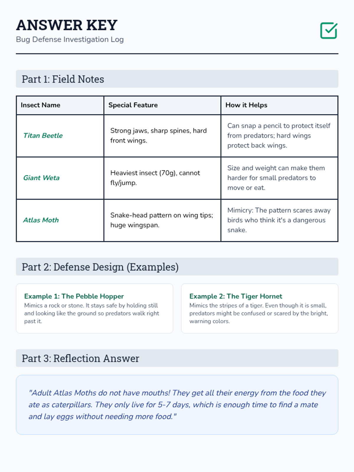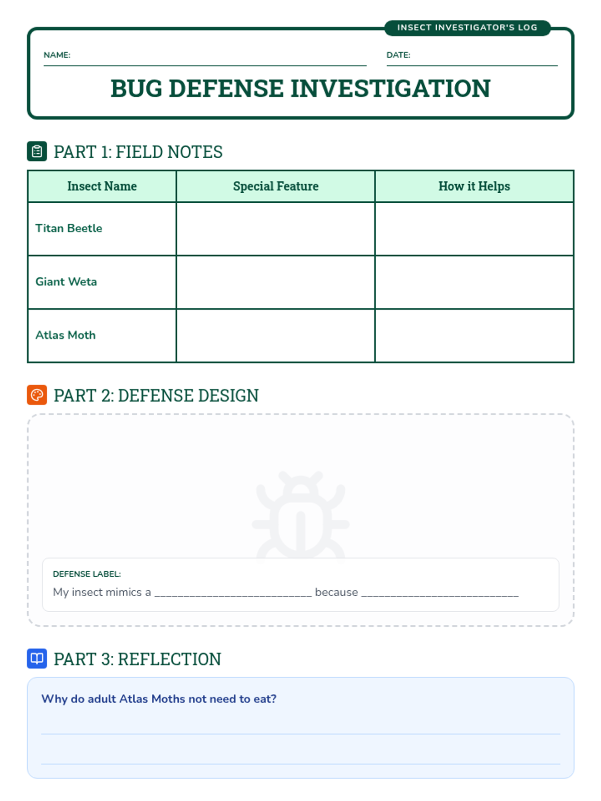 Students explore animal adaptations by studying giant insects like the Titan Beetle and Atlas Moth, focusing on how mimicry and physical structures help survival.