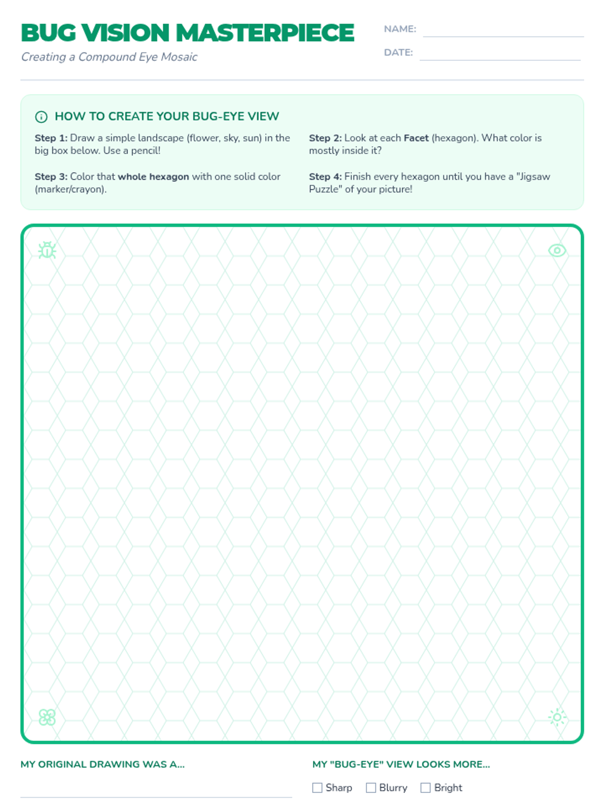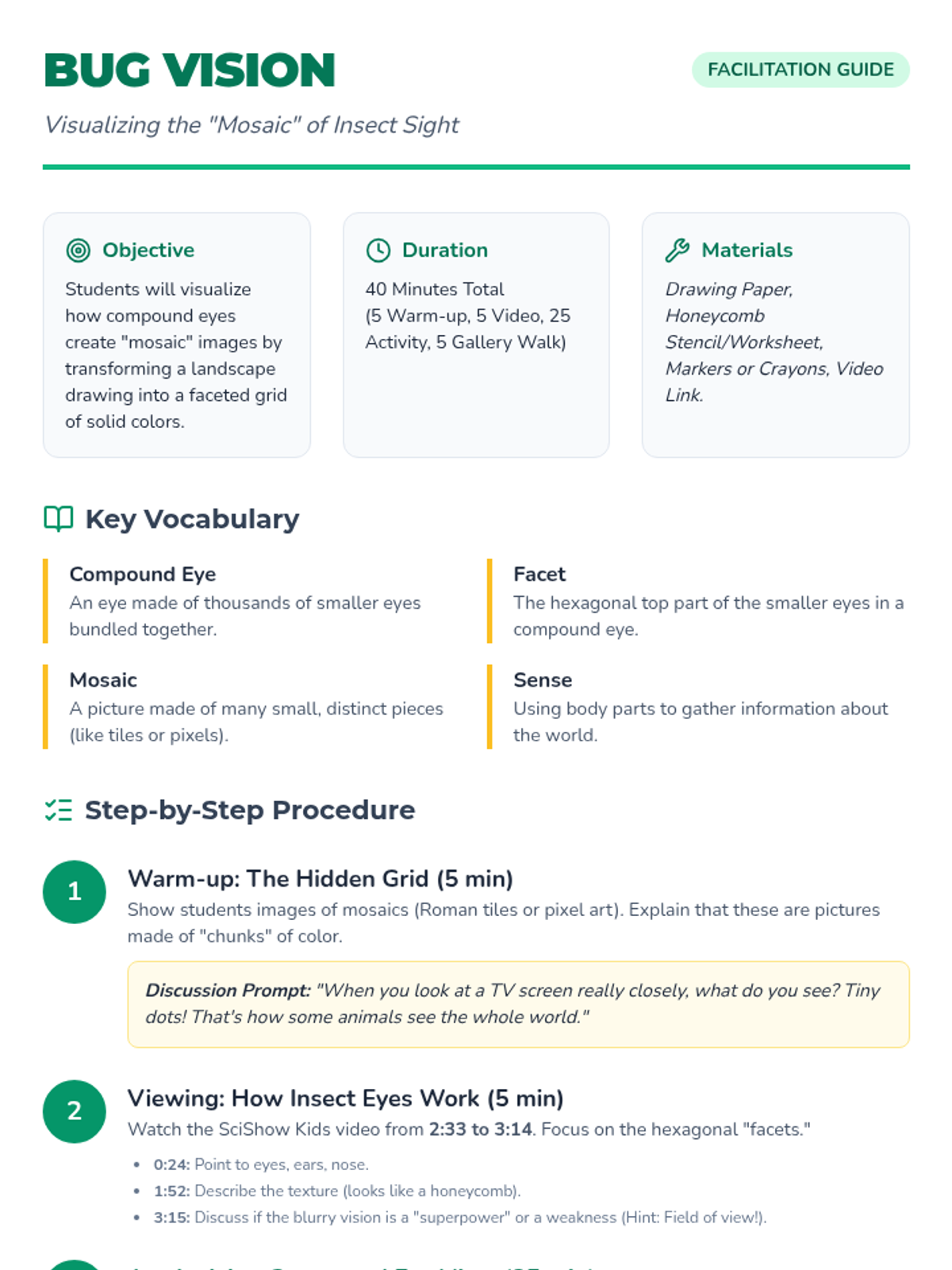 Students explore how compound eyes work by visualizing the 'jigsaw puzzle' of insect vision through a mosaic art project. The lesson integrates biology and art to explain facets and pixelation.