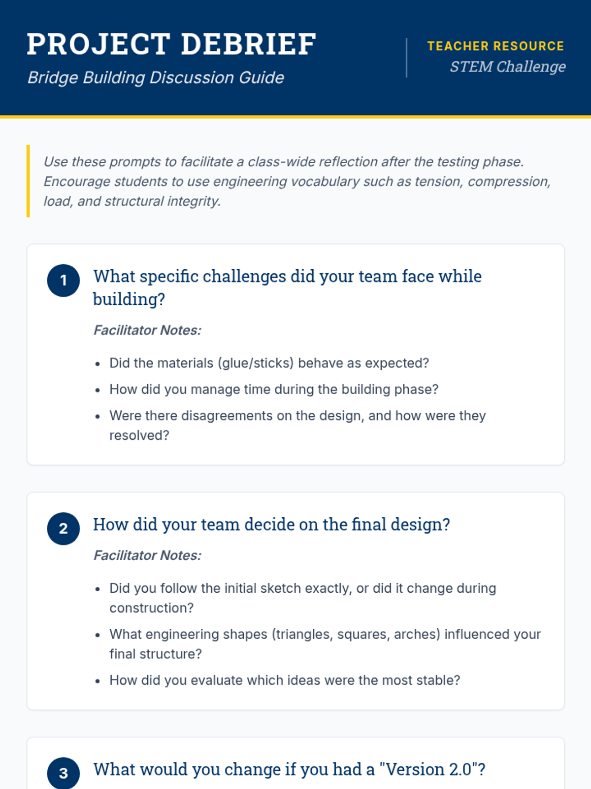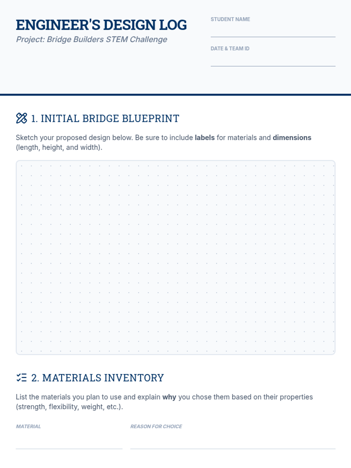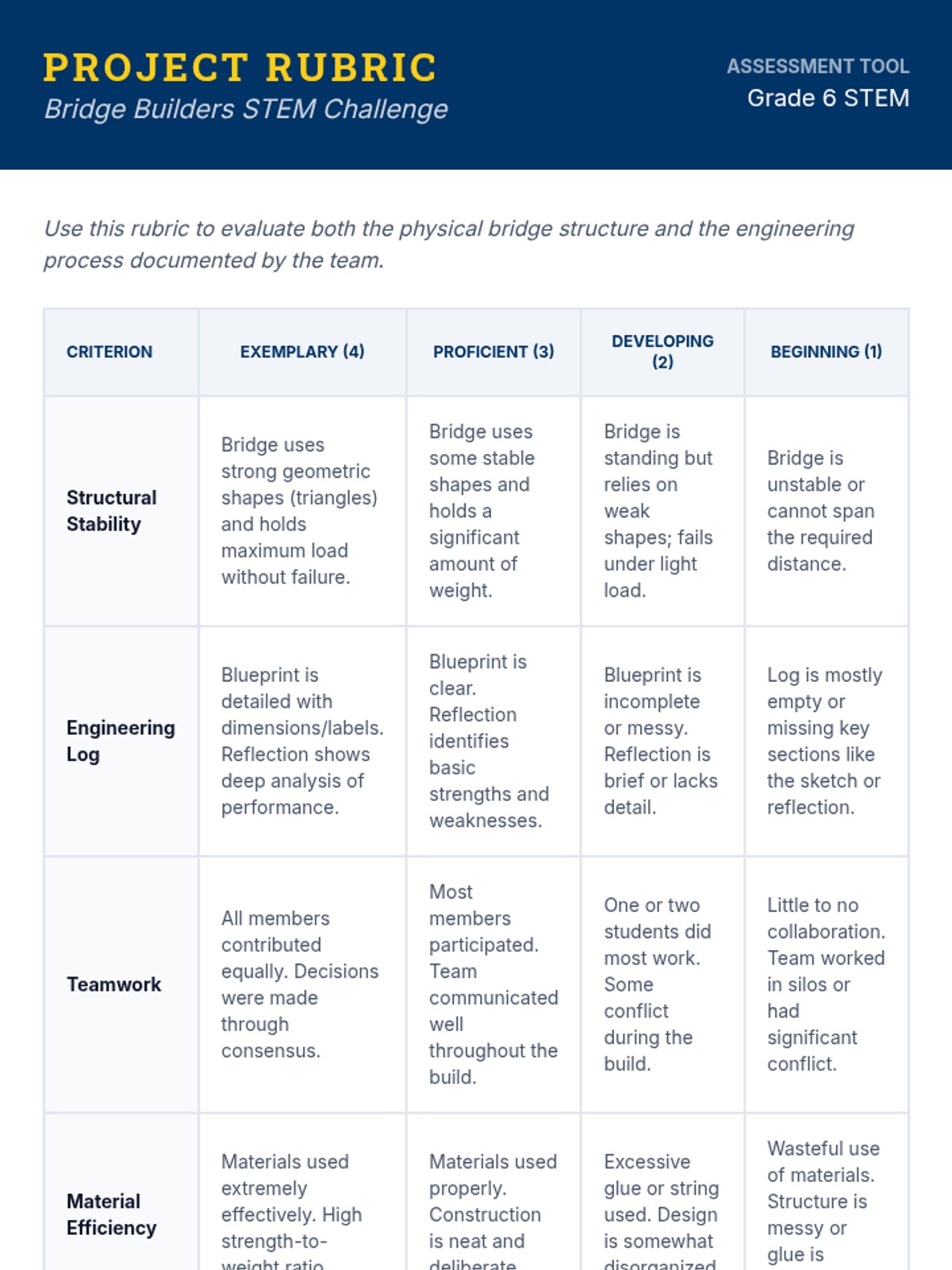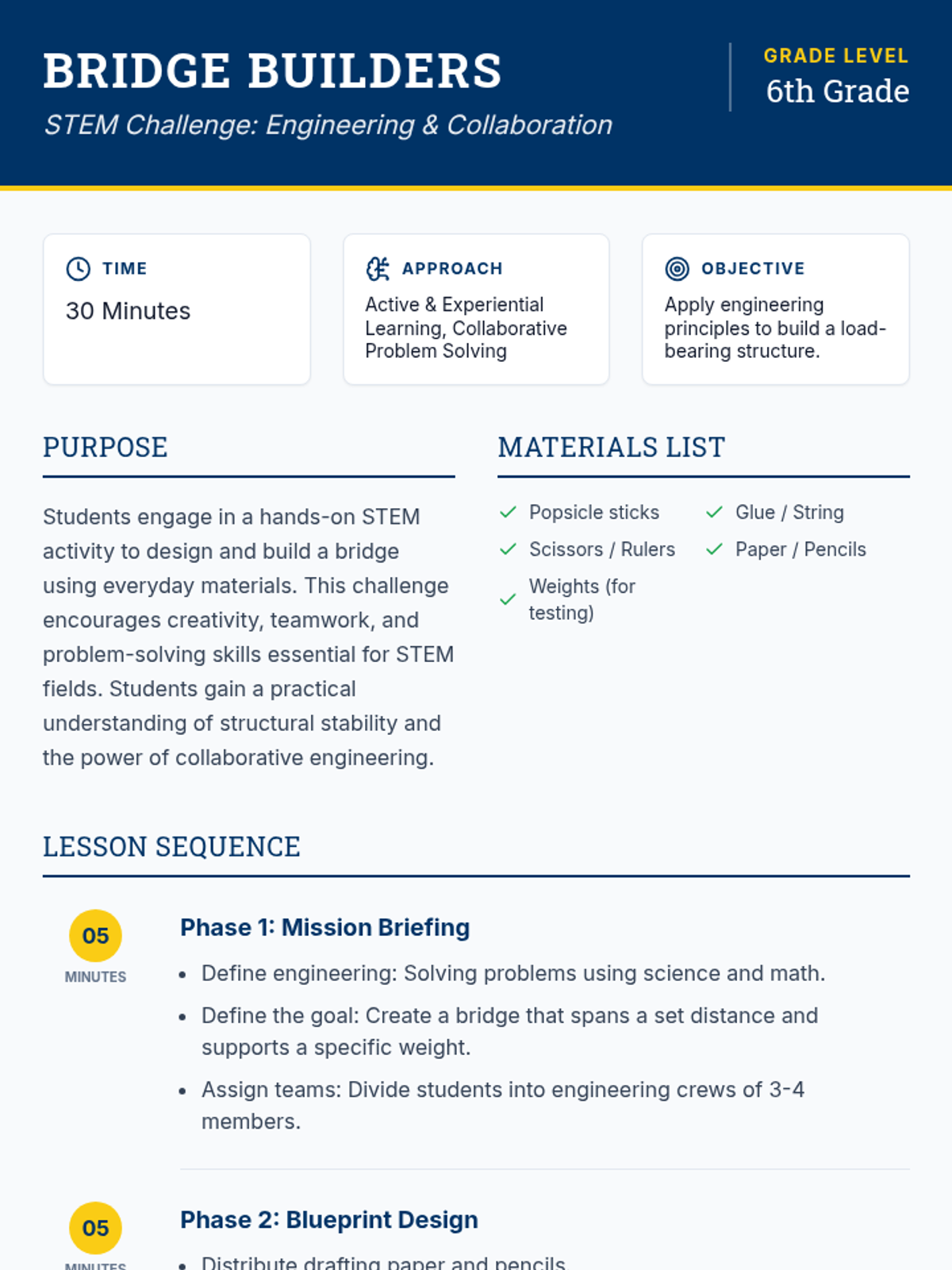 A hands-on engineering challenge where 6th-grade students design, build, and test a bridge using popsicle sticks and glue, focusing on structural stability and teamwork.