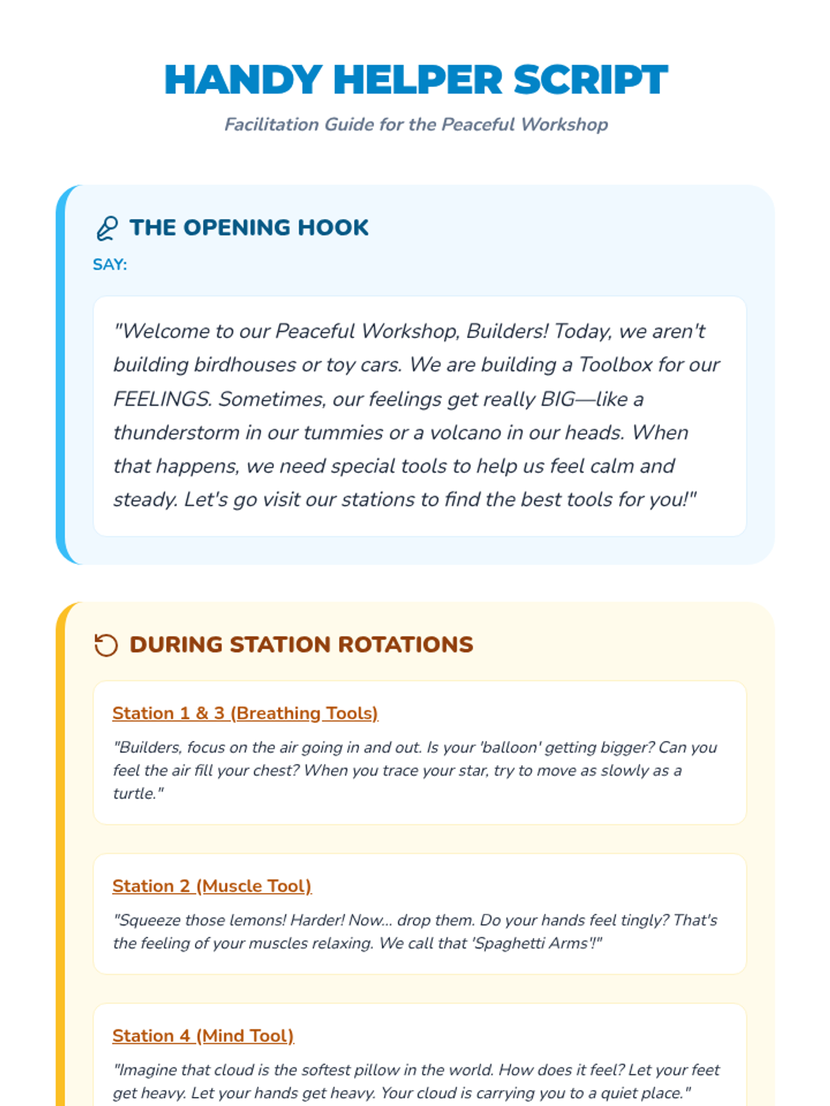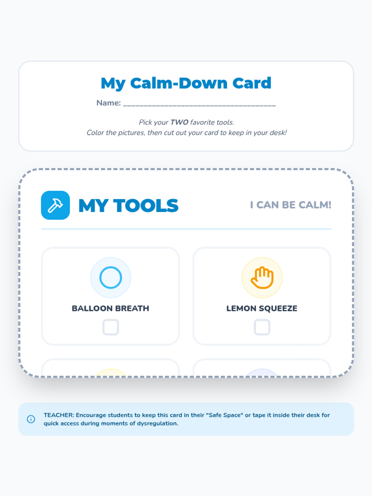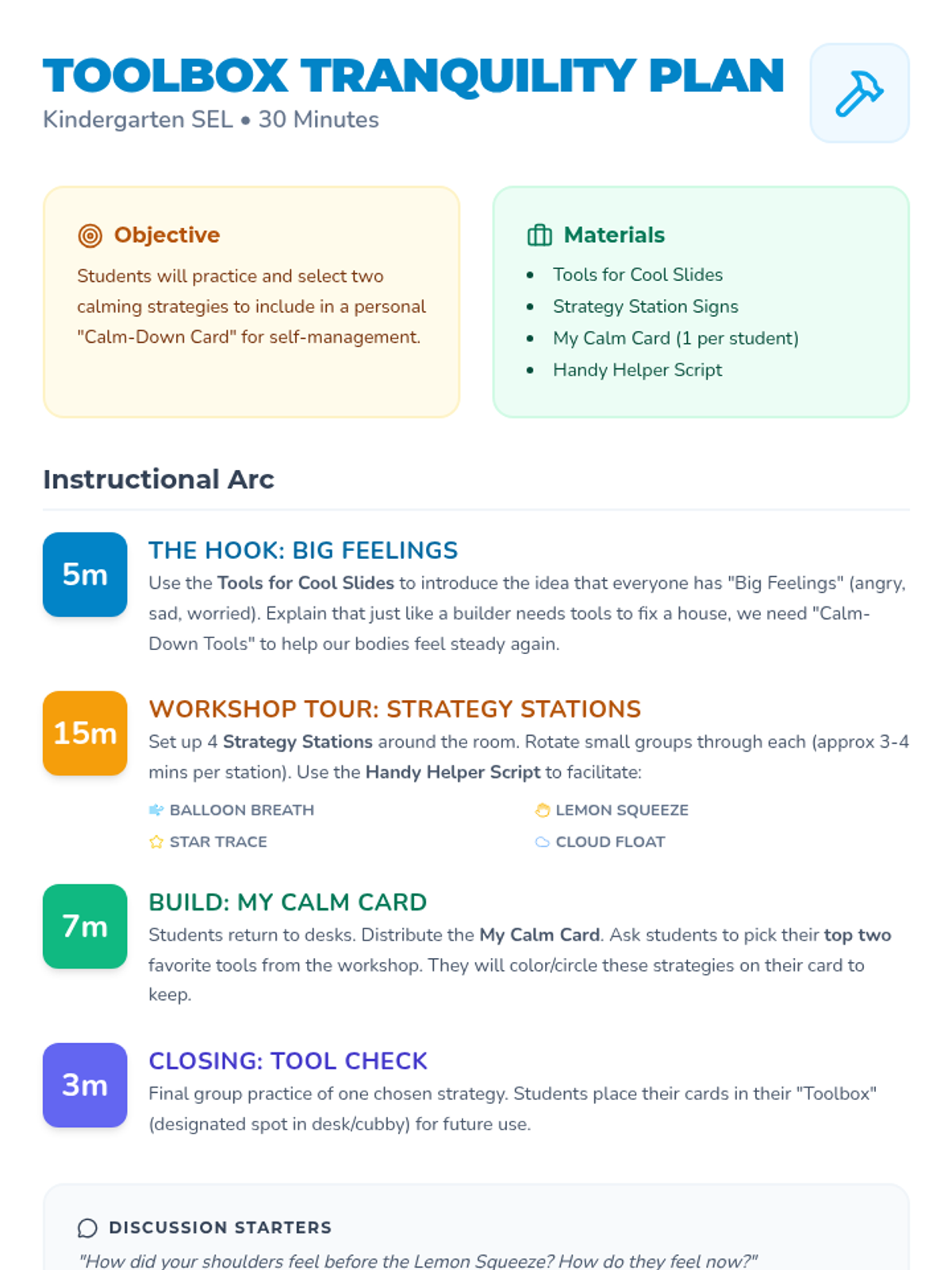 A social-emotional learning lesson for Kindergarteners to identify and practice self-regulation strategies through a "toolbox" metaphor. Students explore different calming techniques and create a personalized reference card.
