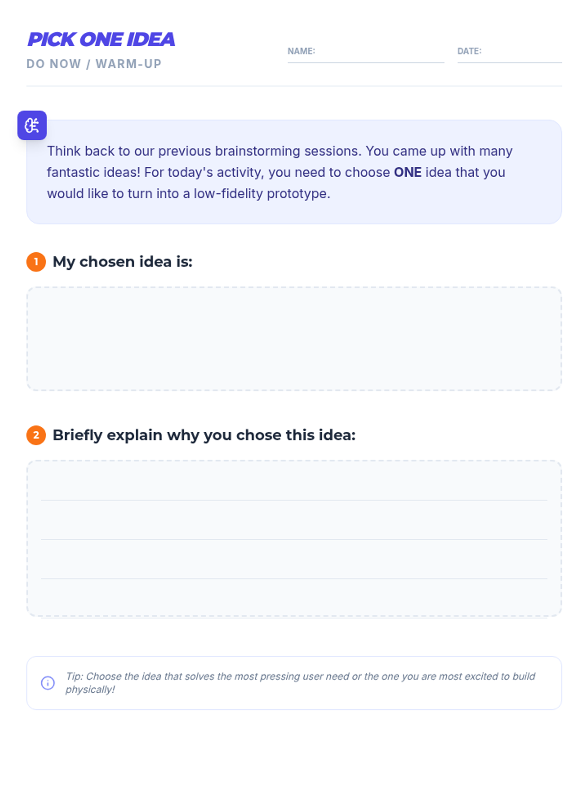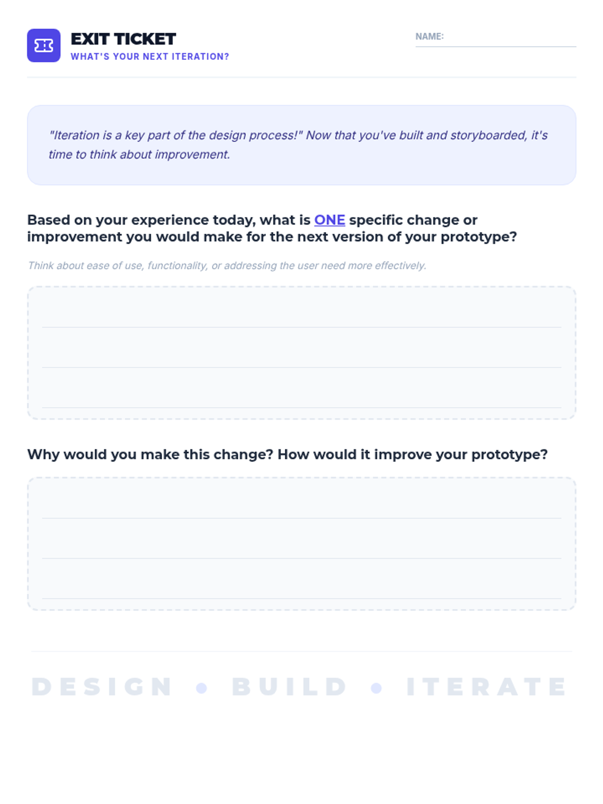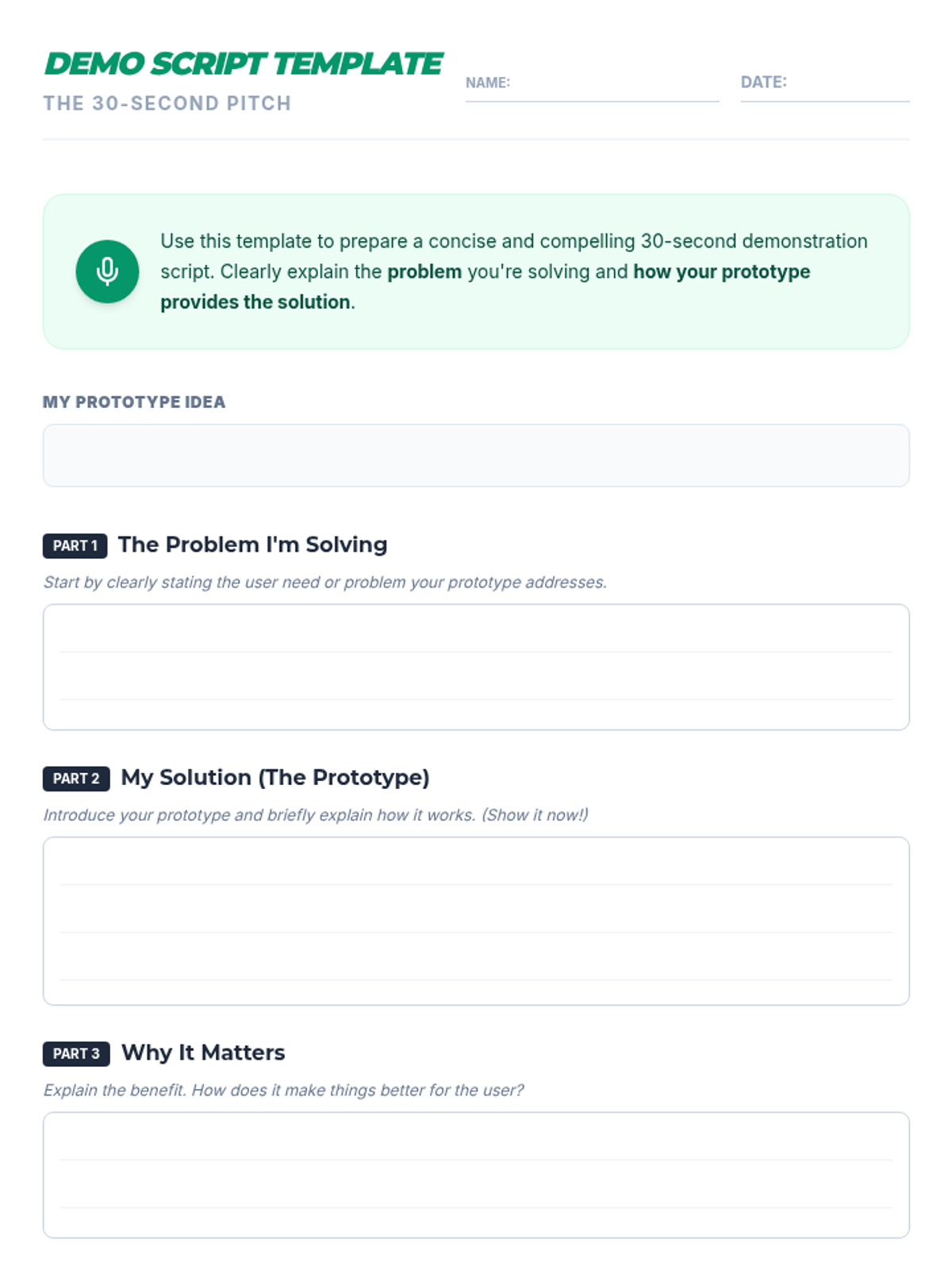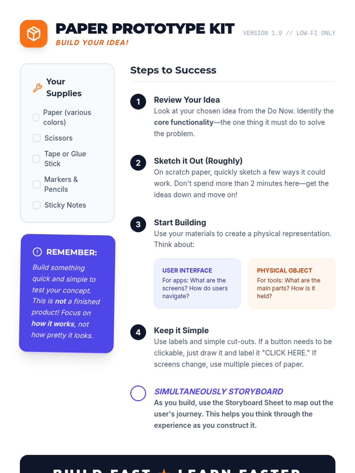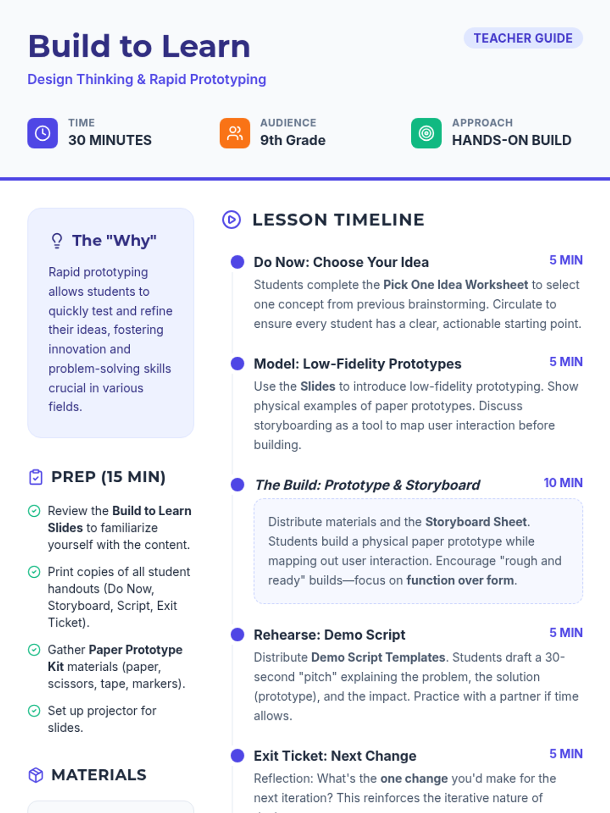In this hands-on lesson, 9th-grade students learn the fundamentals of rapid prototyping by building low-fidelity models and drafting a 30-second demo script to communicate their solutions effectively.
