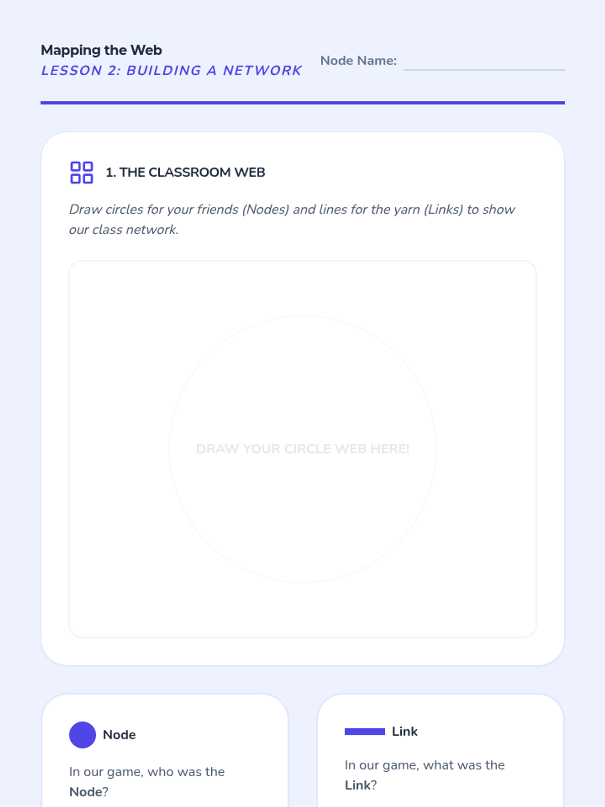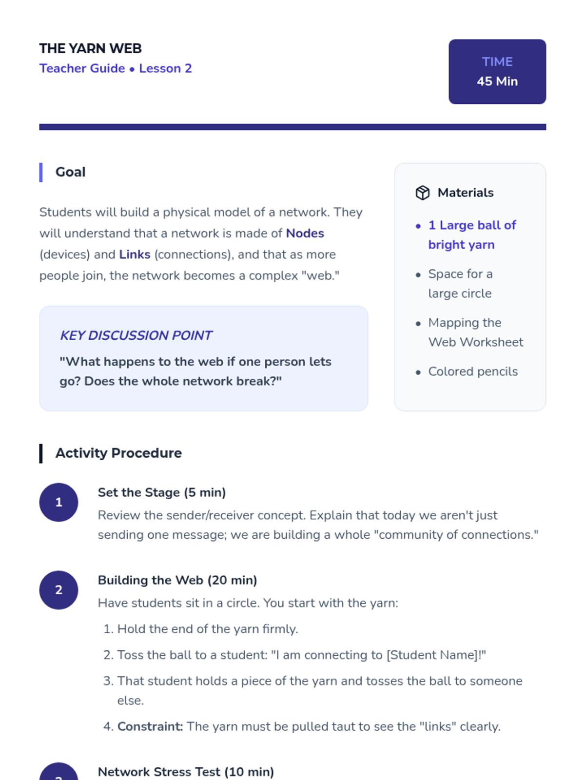 Using a ball of yarn, students create a physical 'web' to visualize how a network connects multiple nodes and the complexity of these connections.