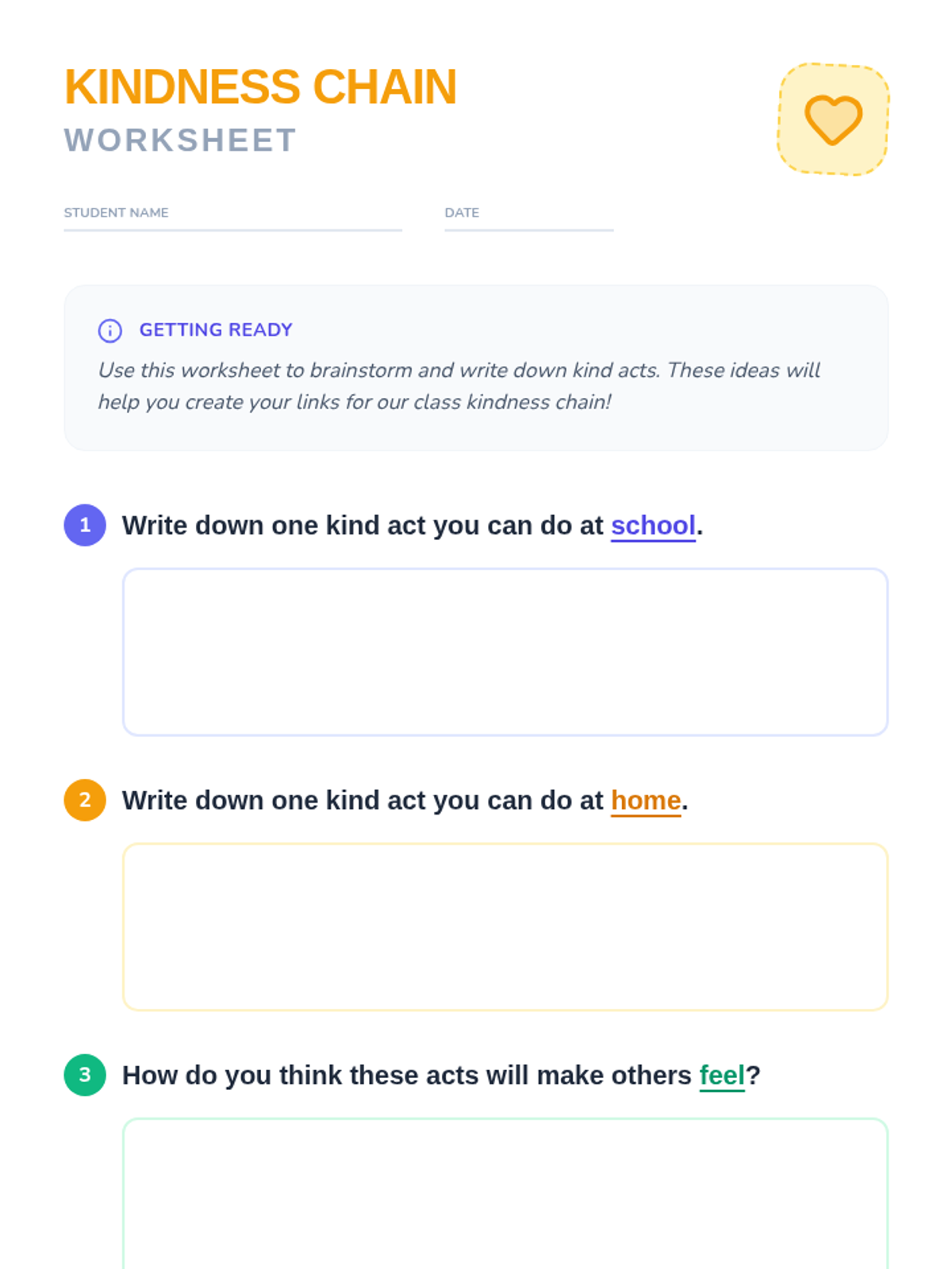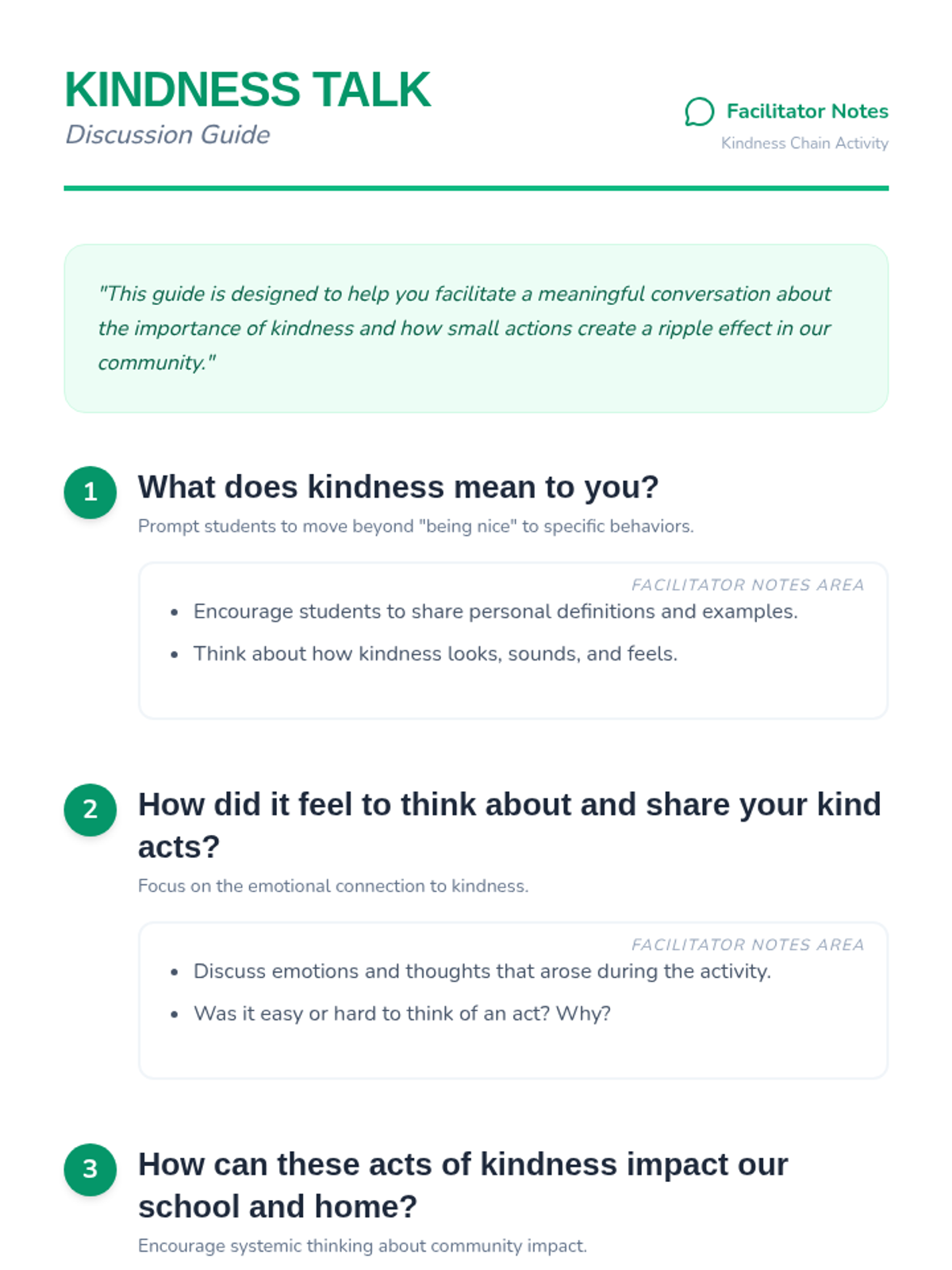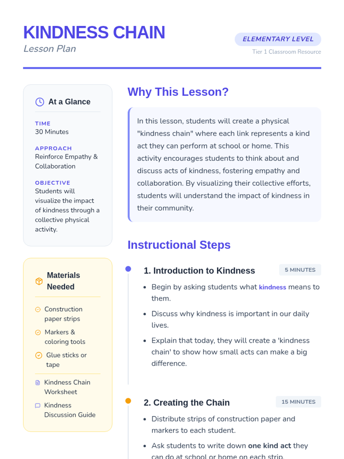 A lesson where students explore empathy and collaboration by creating a physical chain of kind acts, visualizing the collective impact of kindness in their community.