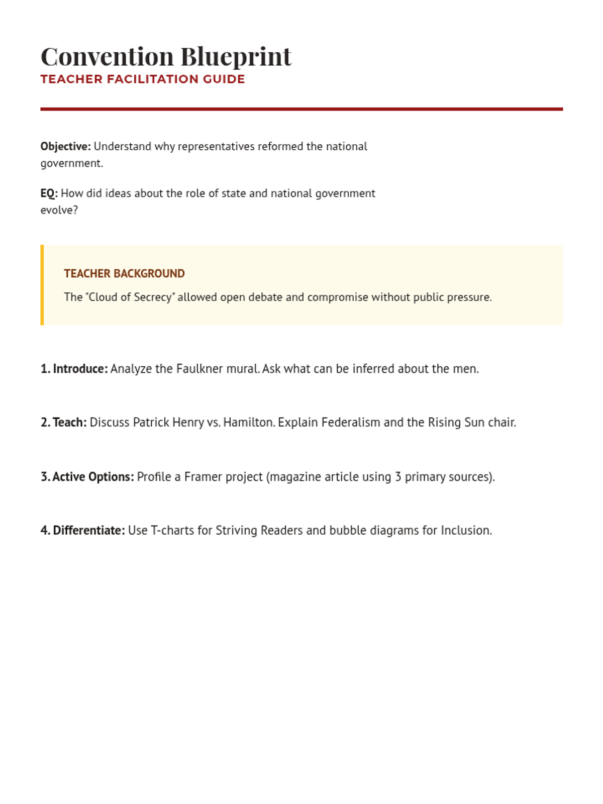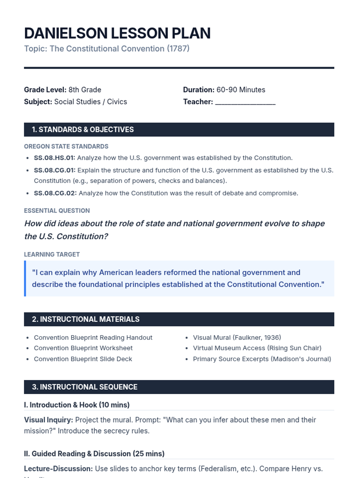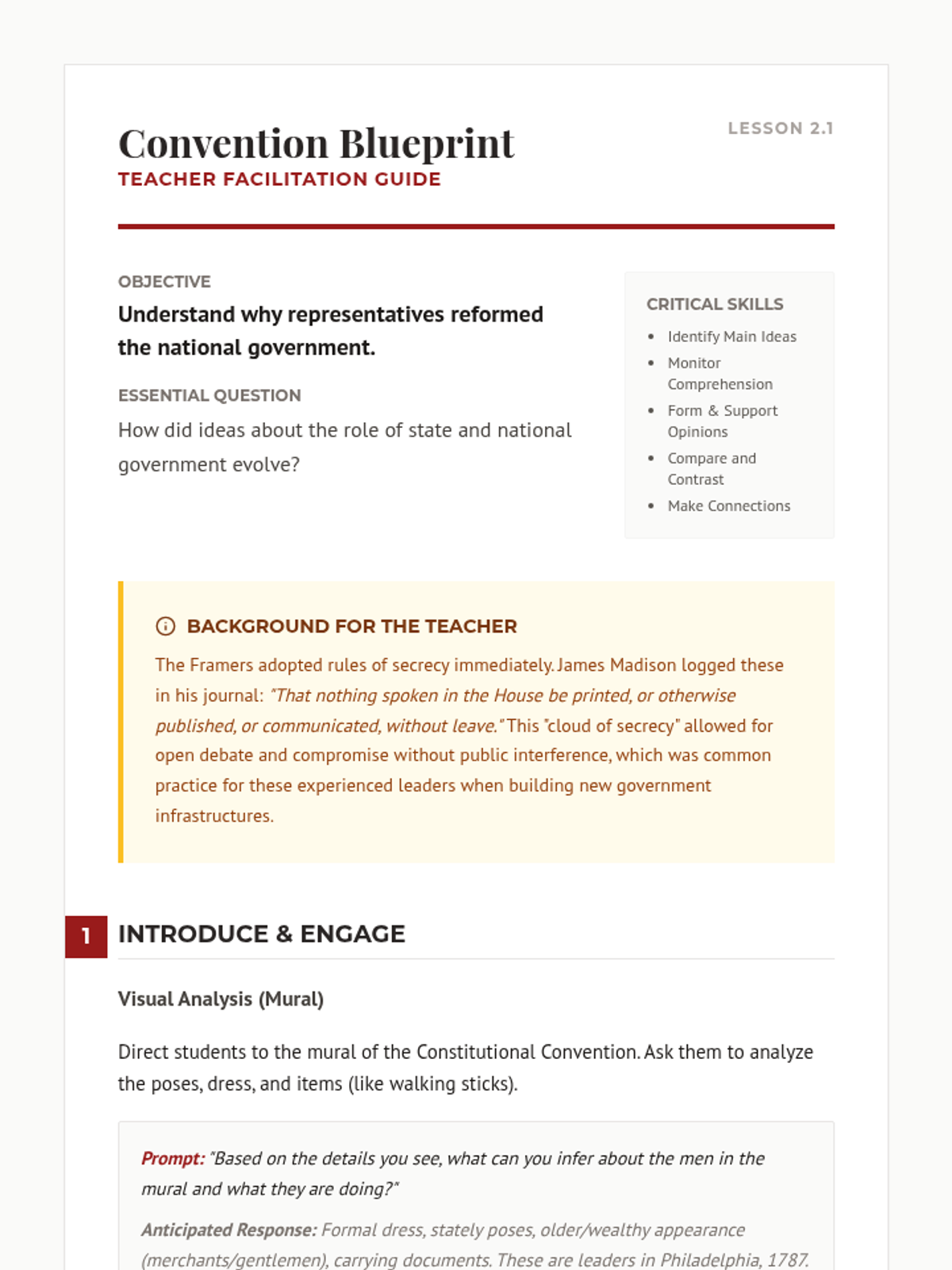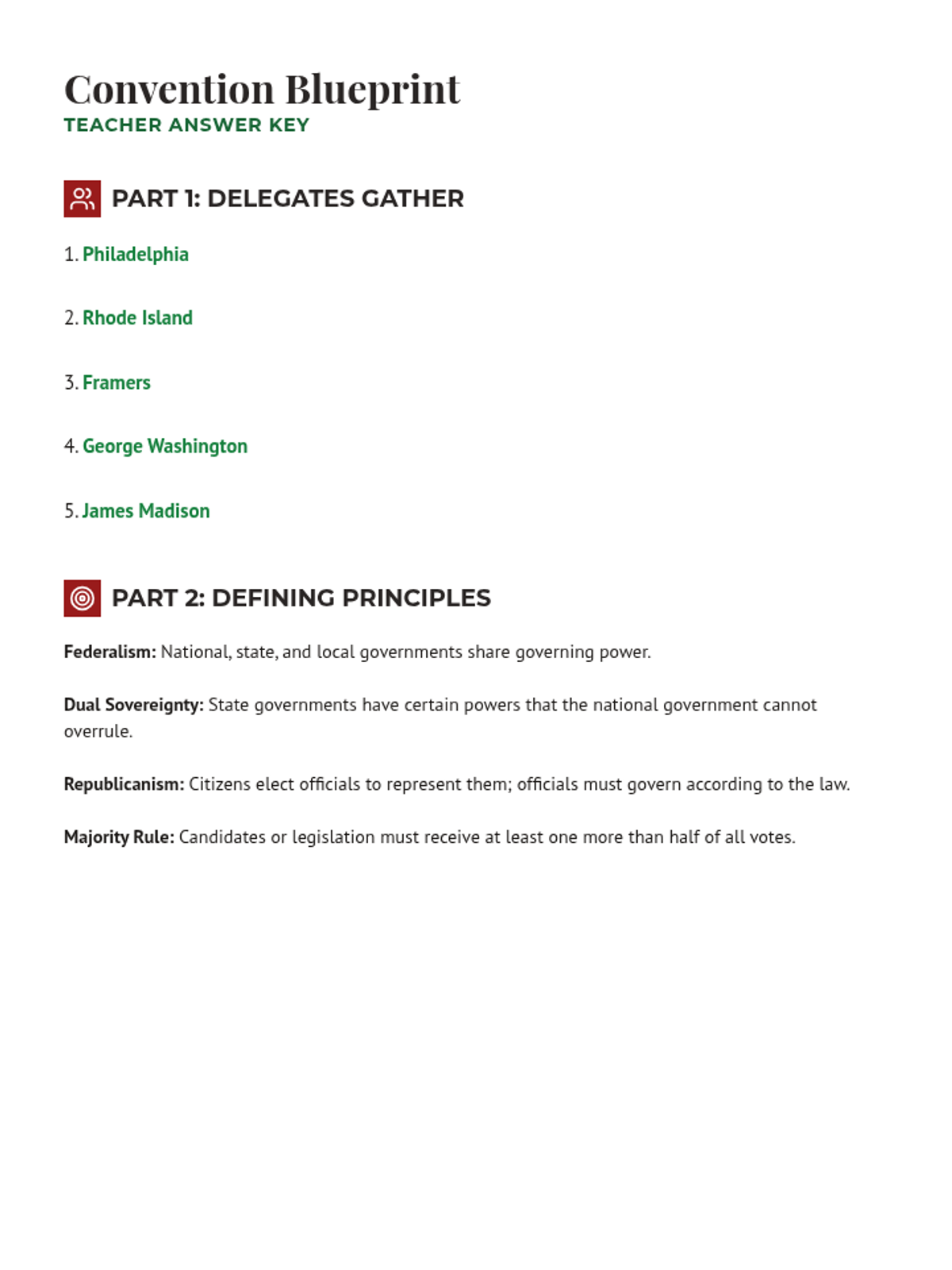 A lesson exploring the 1787 Constitutional Convention, the roles of key Framers like James Madison, and the fundamental principles of American government including federalism, republicanism, and separation of powers.