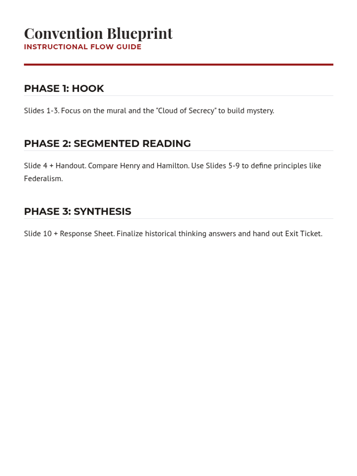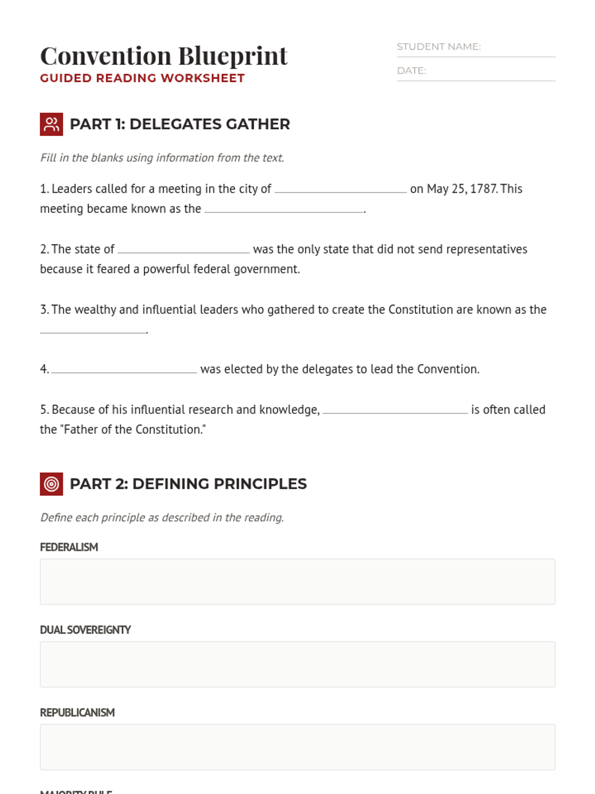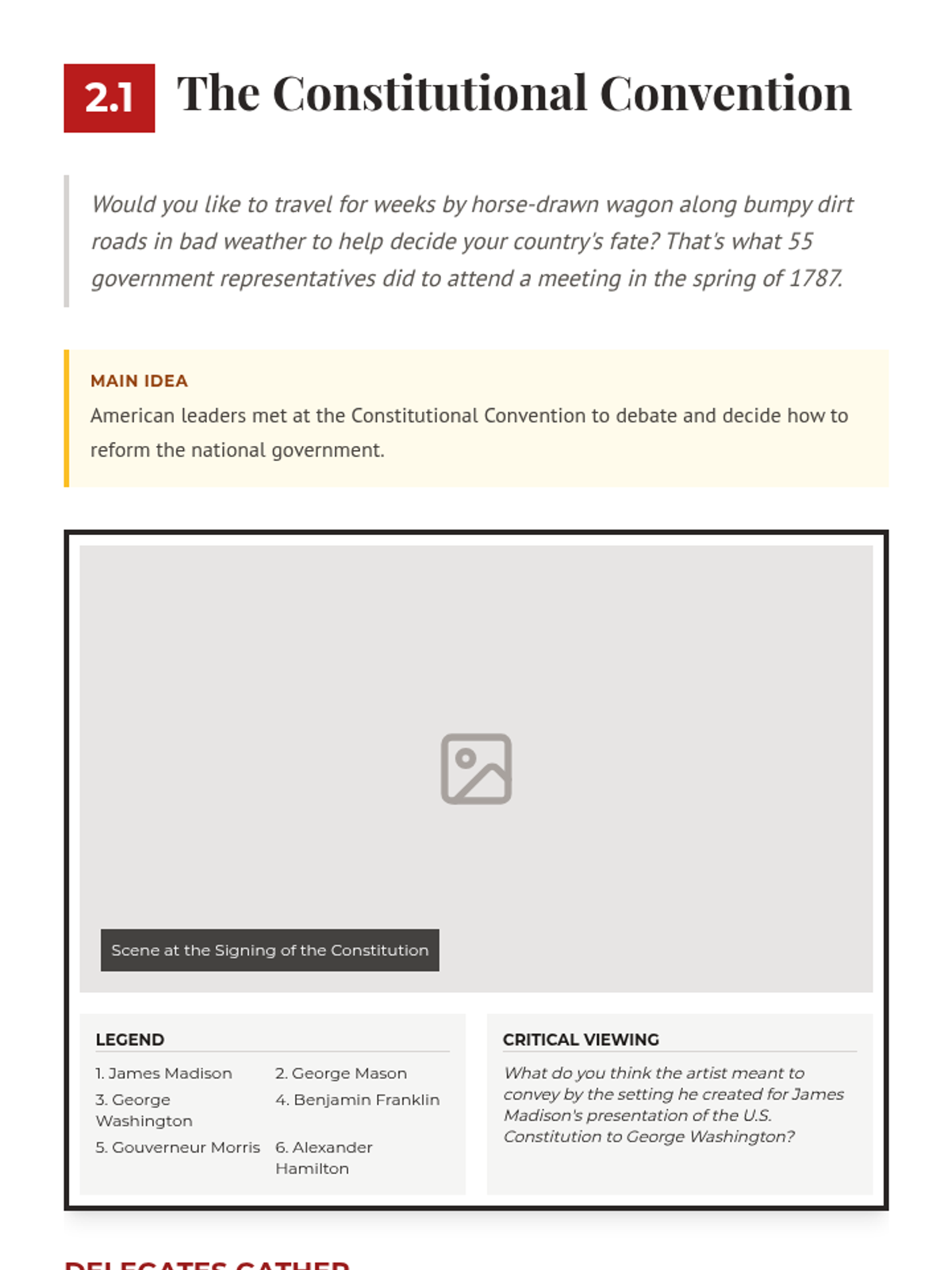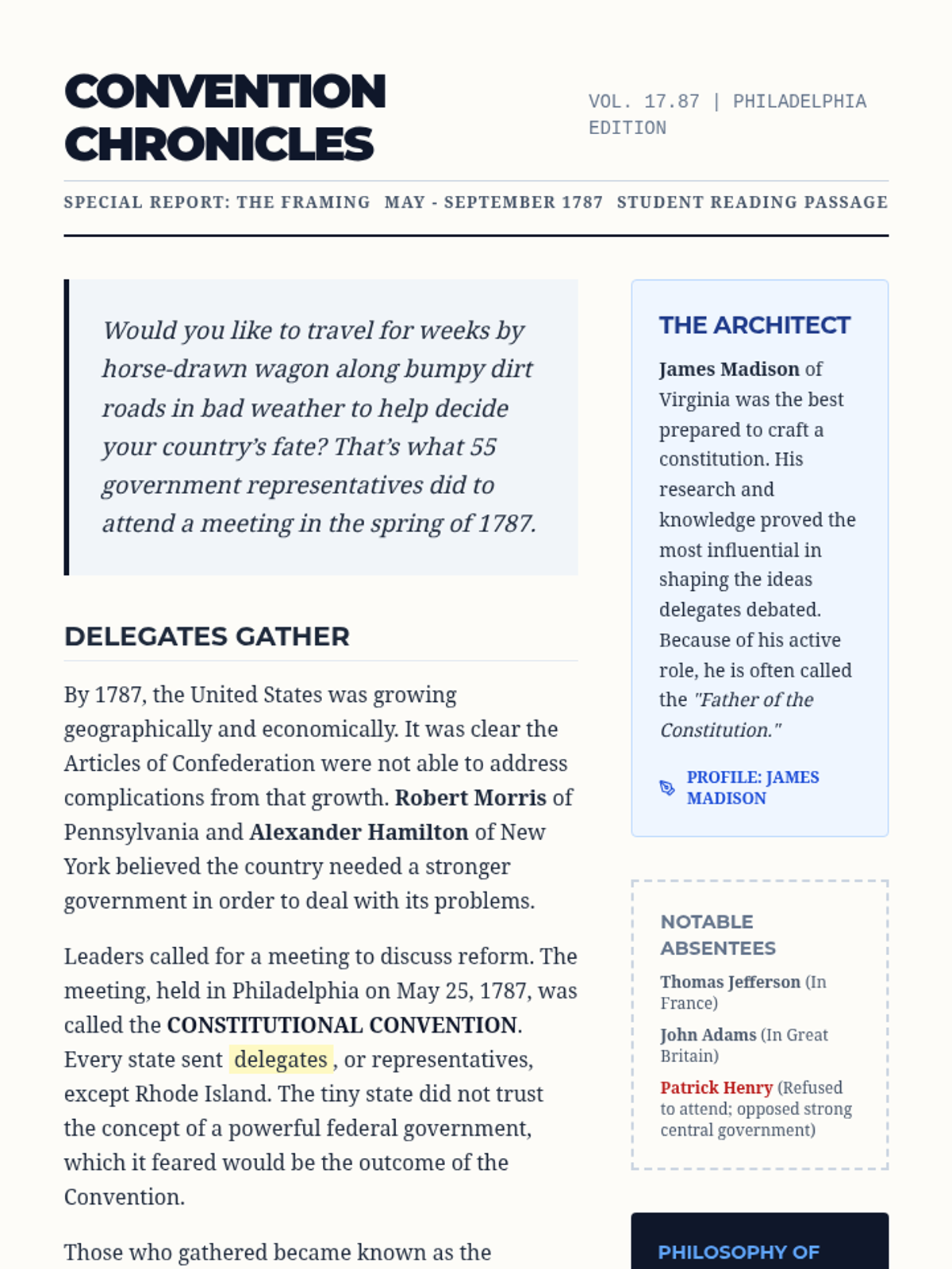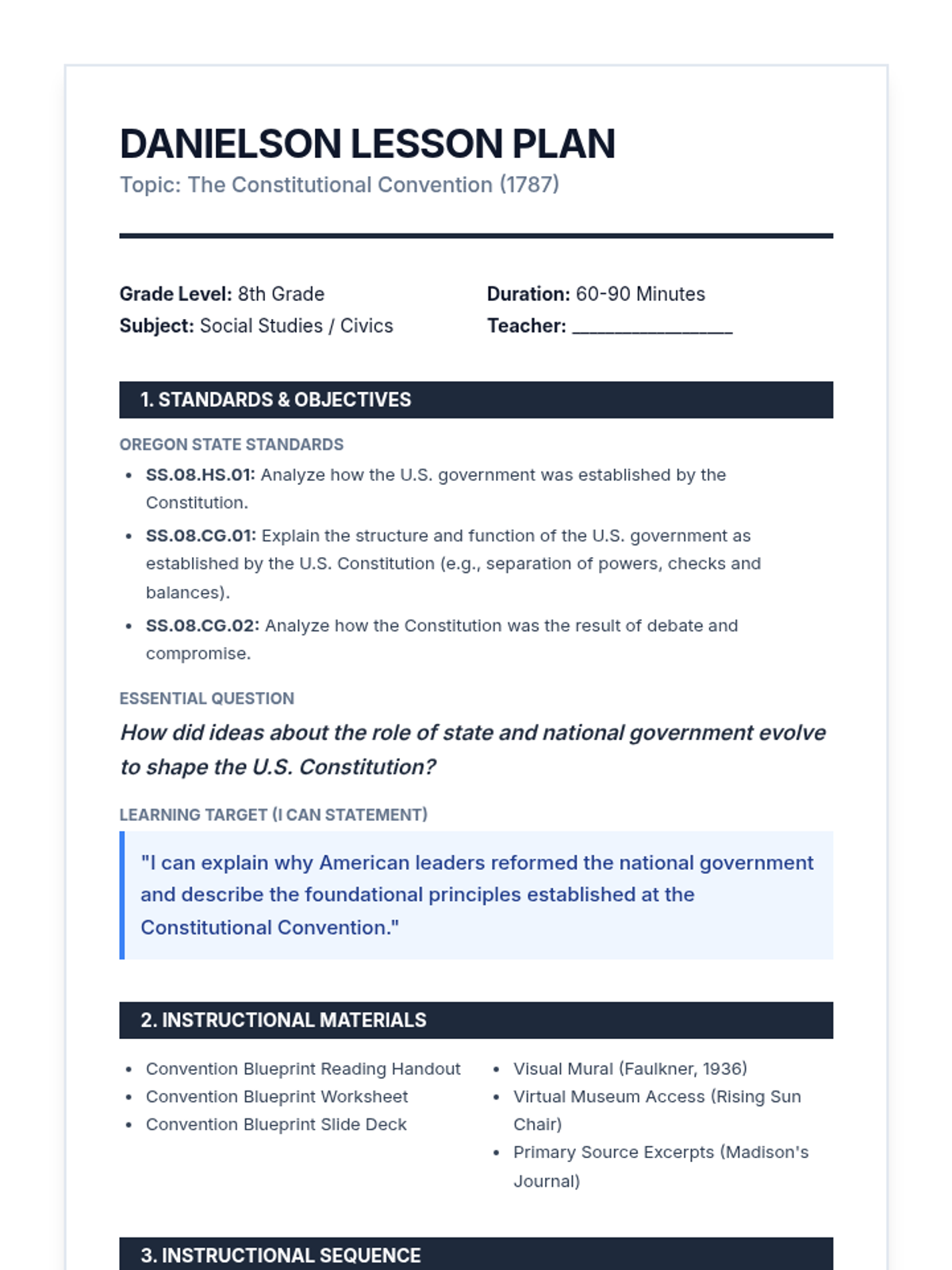 A lesson exploring the 1787 Constitutional Convention, the roles of key Framers like James Madison, and the fundamental principles of American government including federalism, republicanism, and separation of powers.