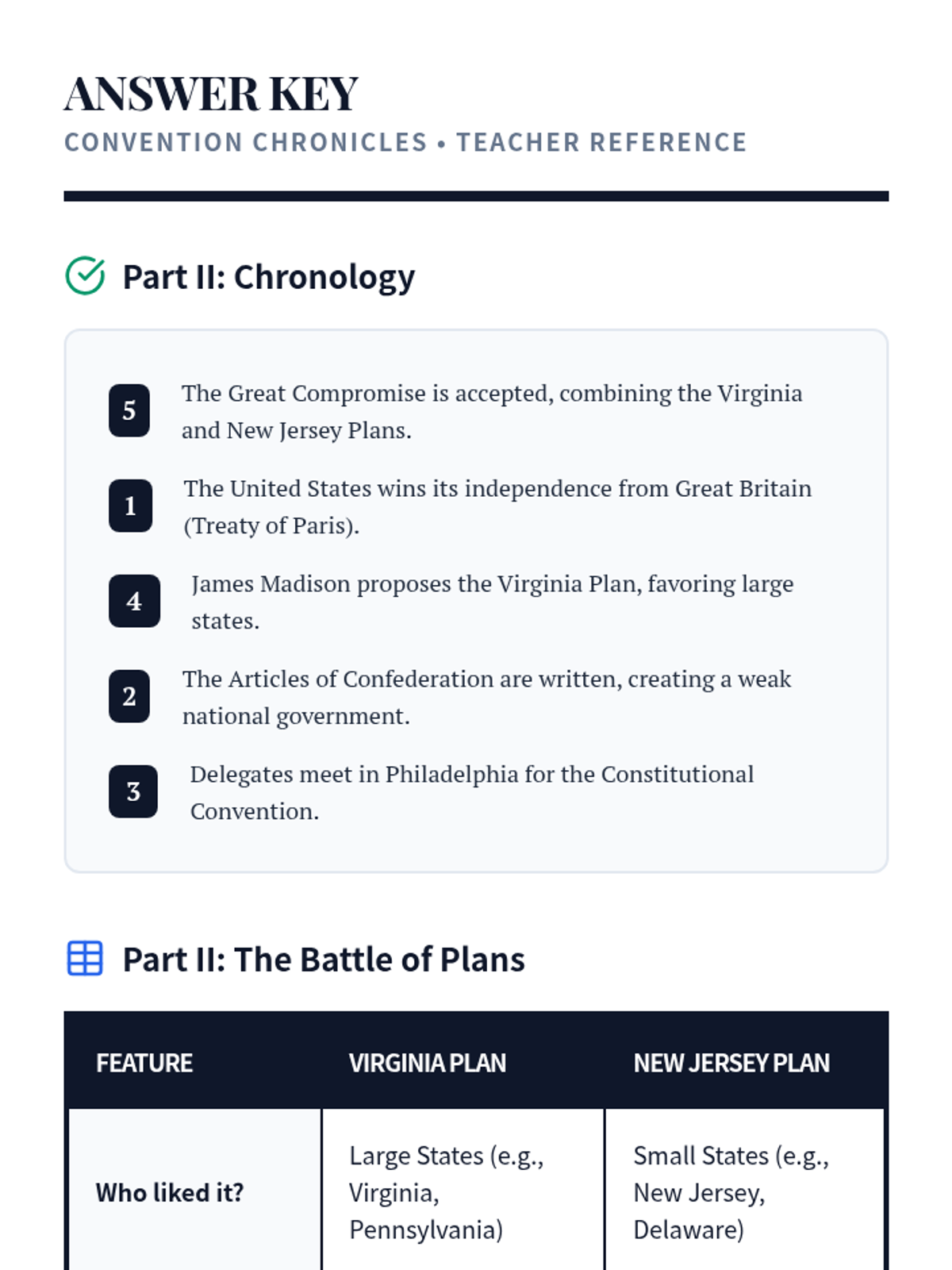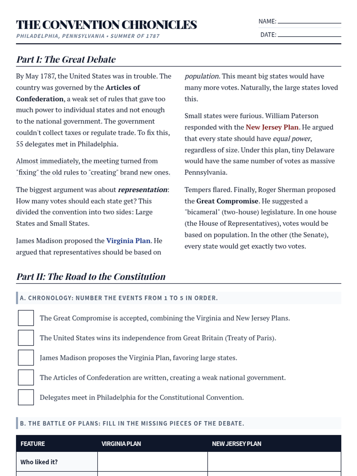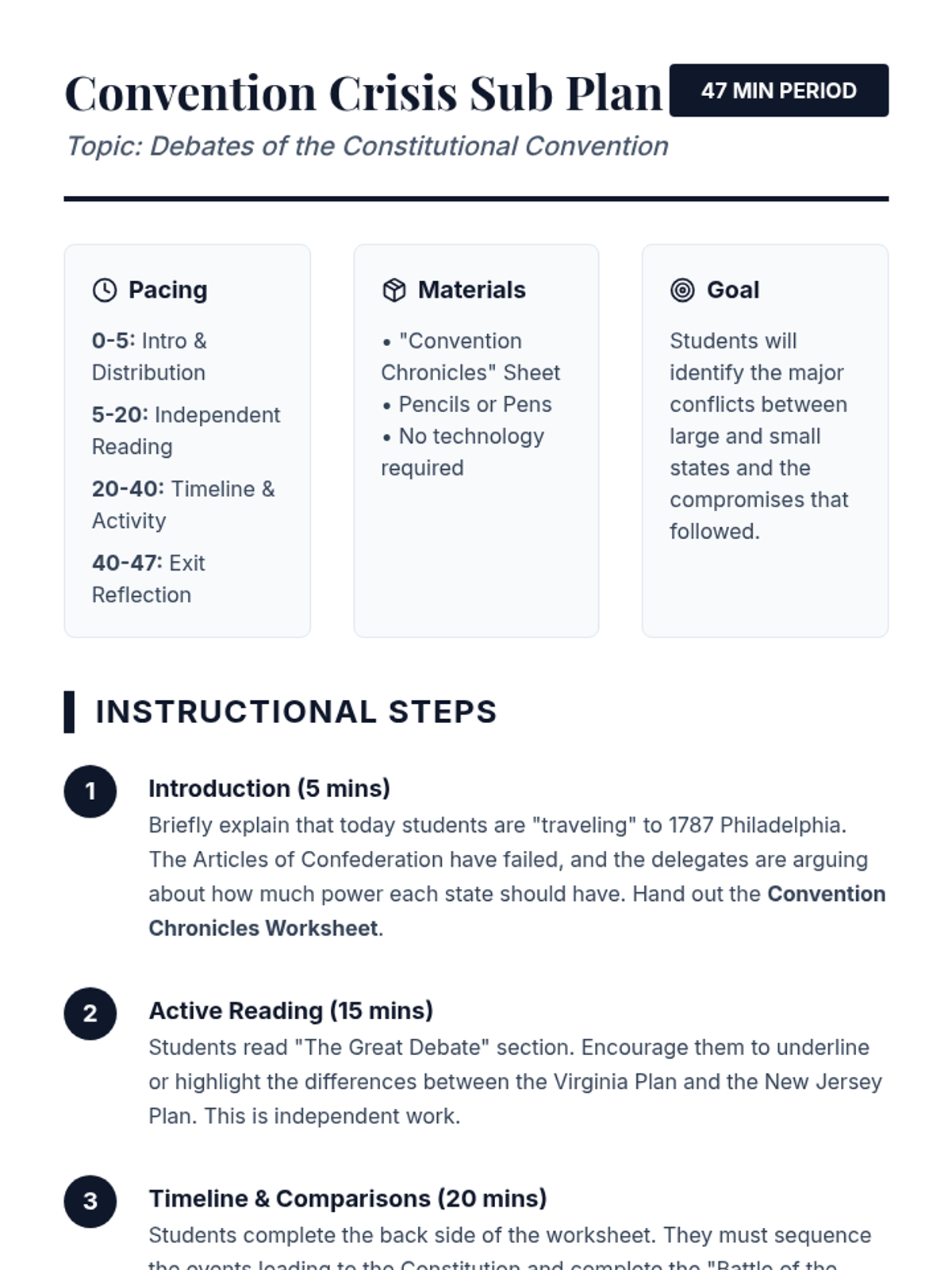 A comprehensive 47-minute emergency sub plan focusing on the major debates of the 1787 Constitutional Convention, including the Virginia and New Jersey Plans and the Great Compromise.