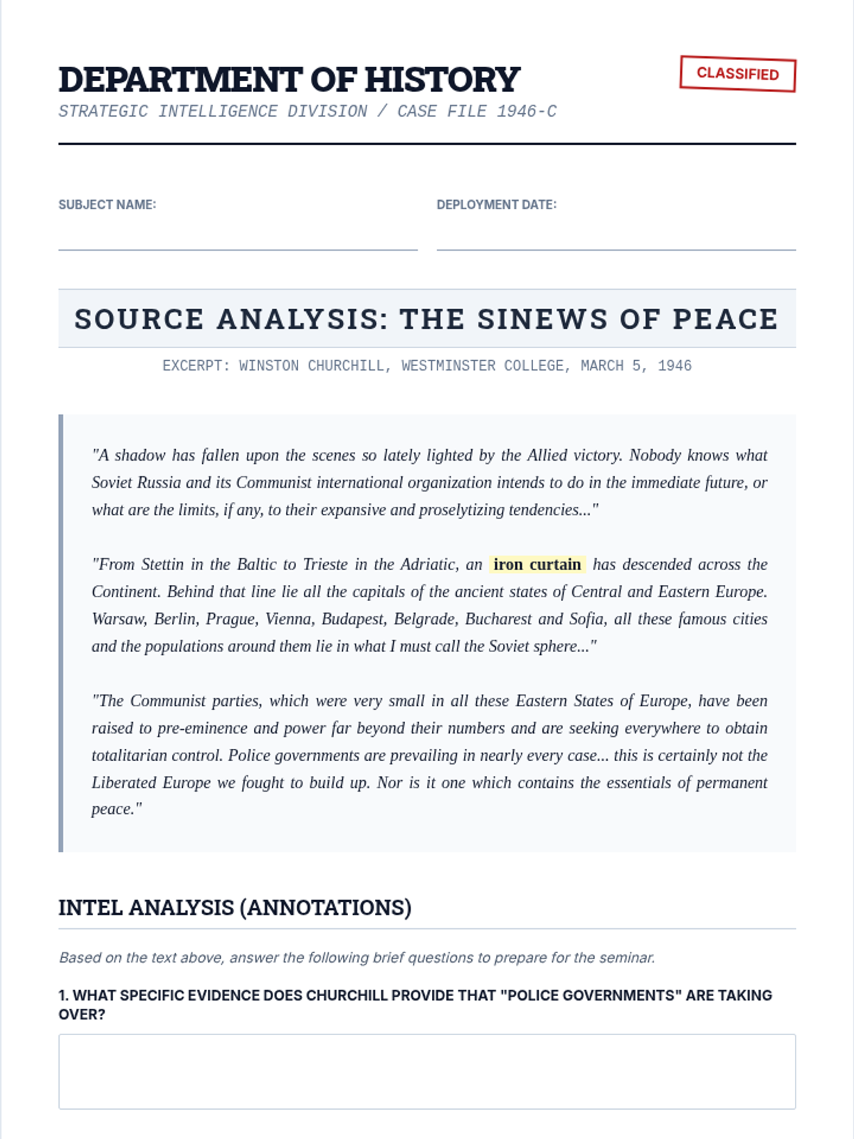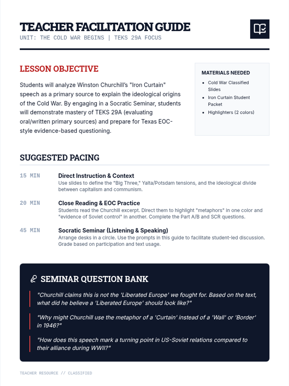 This lesson explores the origins and escalation of the Cold War through the analysis of primary sources, featuring EOC-style assessments and a Socratic seminar focused on Winston Churchill's 'Iron Curtain' speech. Students will develop critical thinking skills aligned with TEKS 29A while mastering historical context and evidence-based argumentation.