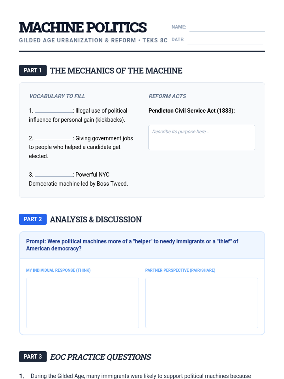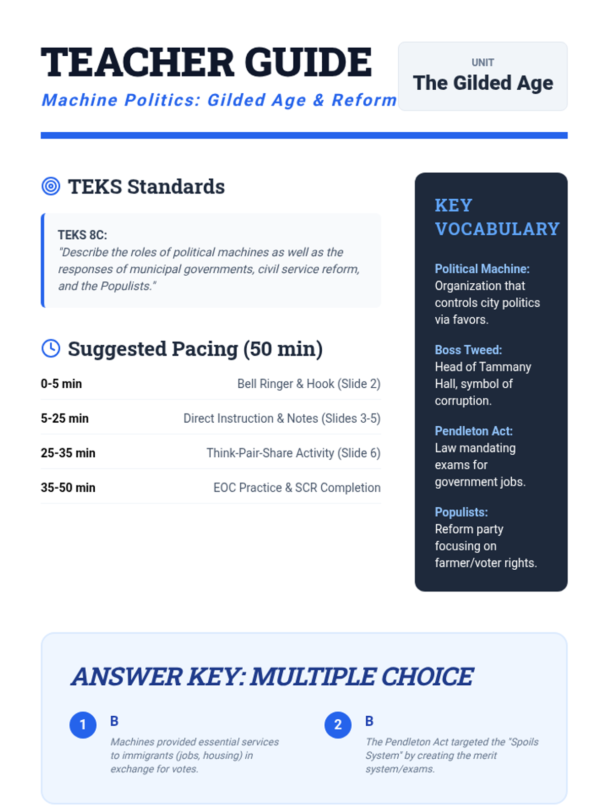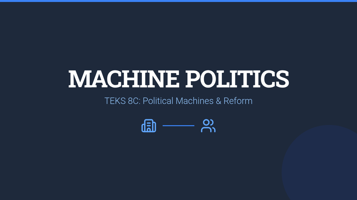 This lesson explores the rise of political machines during the Gilded Age, focusing on TEKS 8C. Students examine the mechanics of urban corruption, civil service reform (Pendleton Act), and the Populist response through collaborative activities and EOC-style assessments.