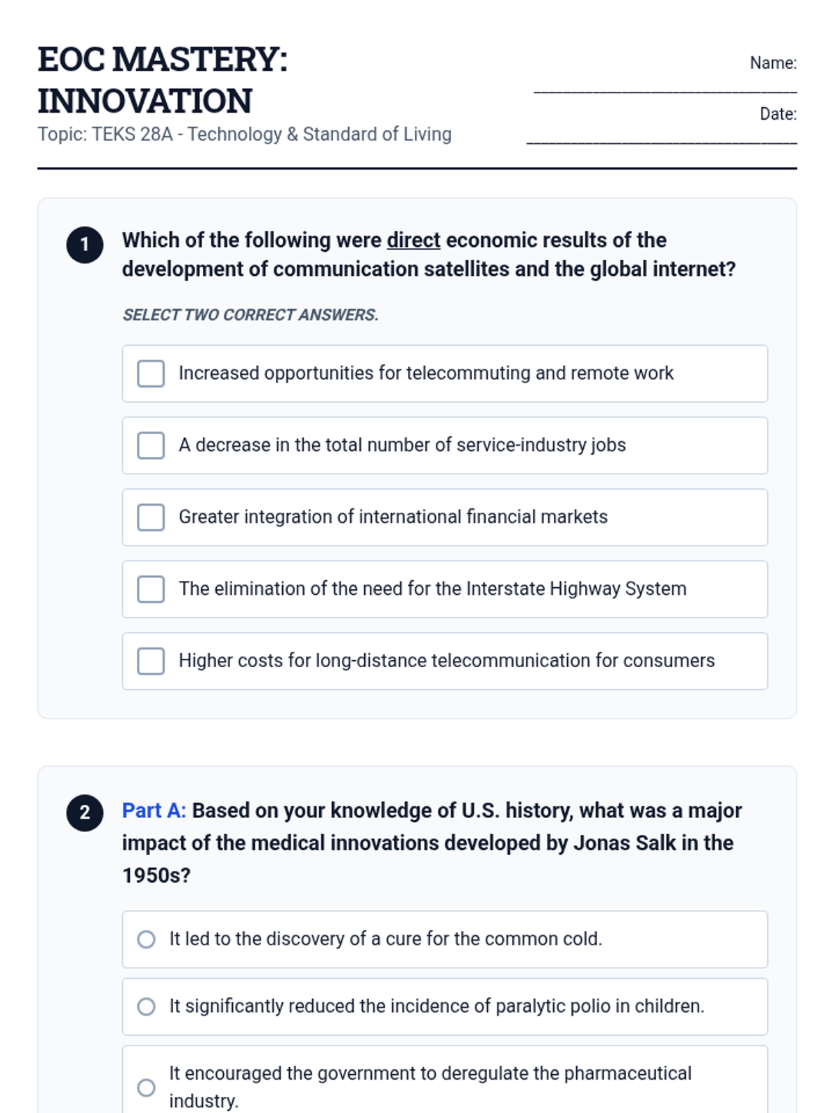 A comprehensive lesson exploring how scientific discoveries and technological innovations in medicine, communication, and transportation revolutionized the American standard of living, aligned with TEKS 28A.