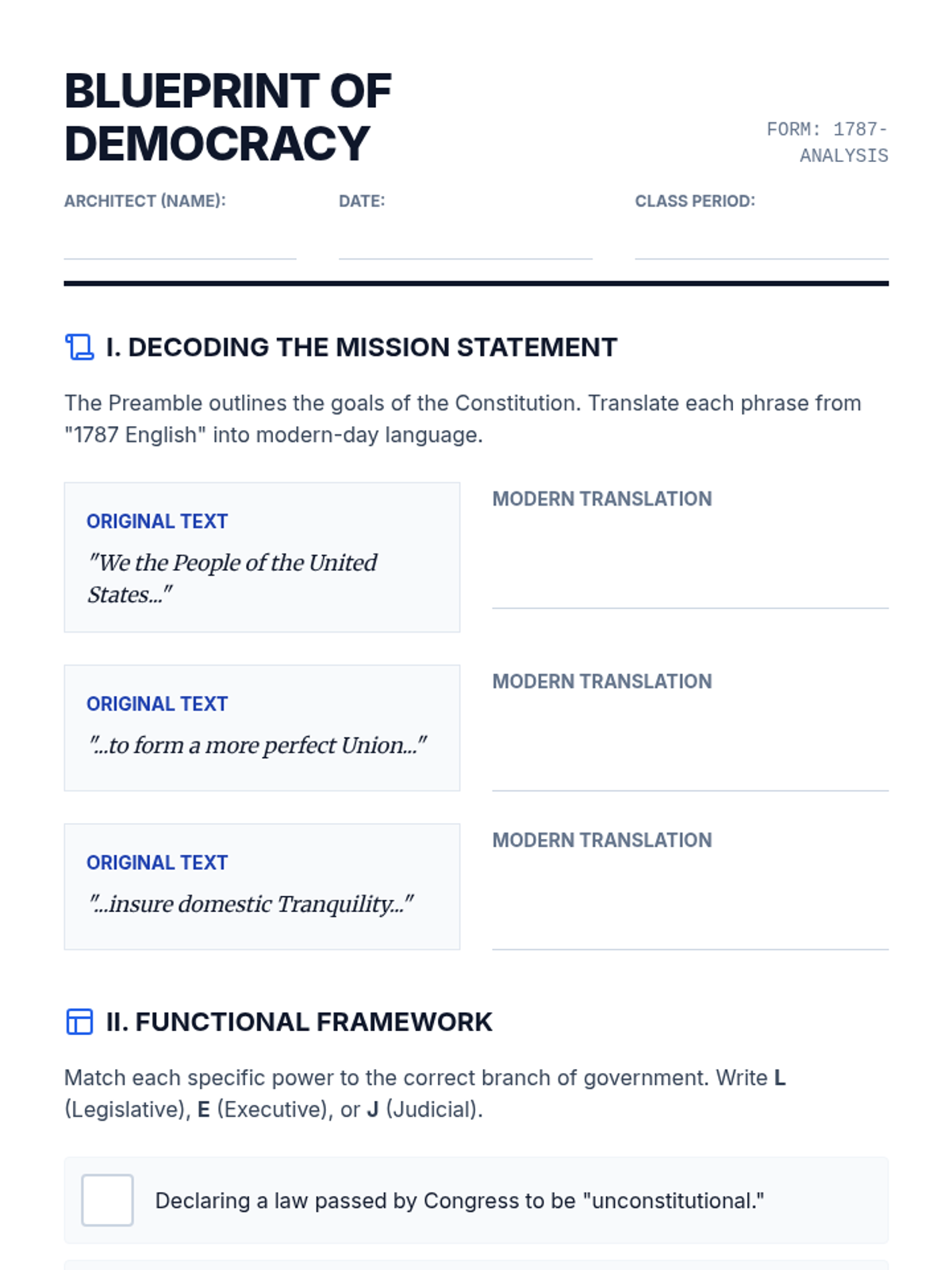 A comprehensive introduction to the U.S. Constitution for 8th graders, exploring the Preamble, the three branches of government, and the system of checks and balances through a 'Blueprint of Democracy' lens.