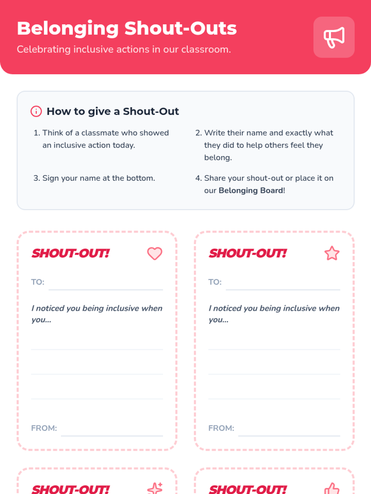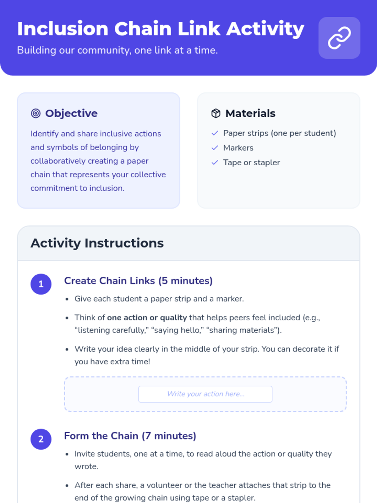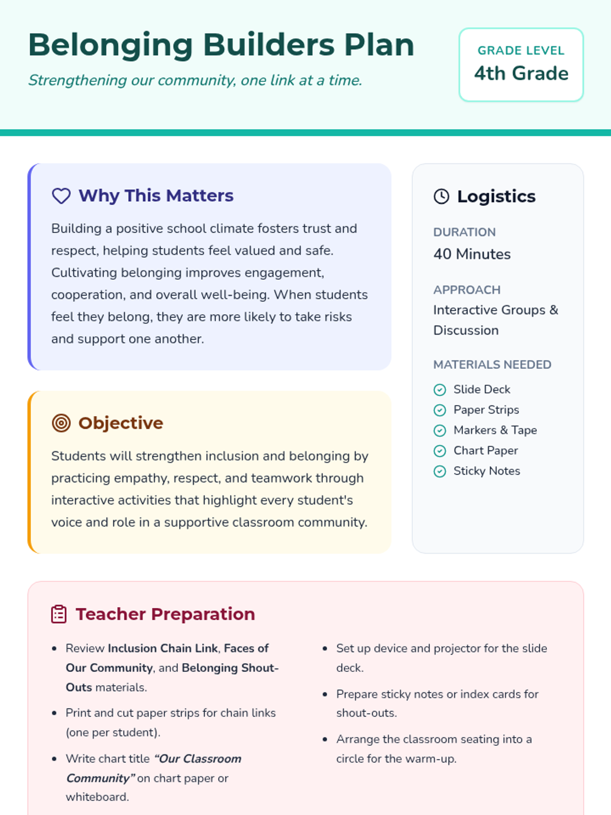 A 40-minute Tier 1 lesson for 4th graders focused on strengthening school climate through inclusion and belonging. Students will learn about empathy, respect, and community through collaborative activities that ensure every voice is heard and valued.