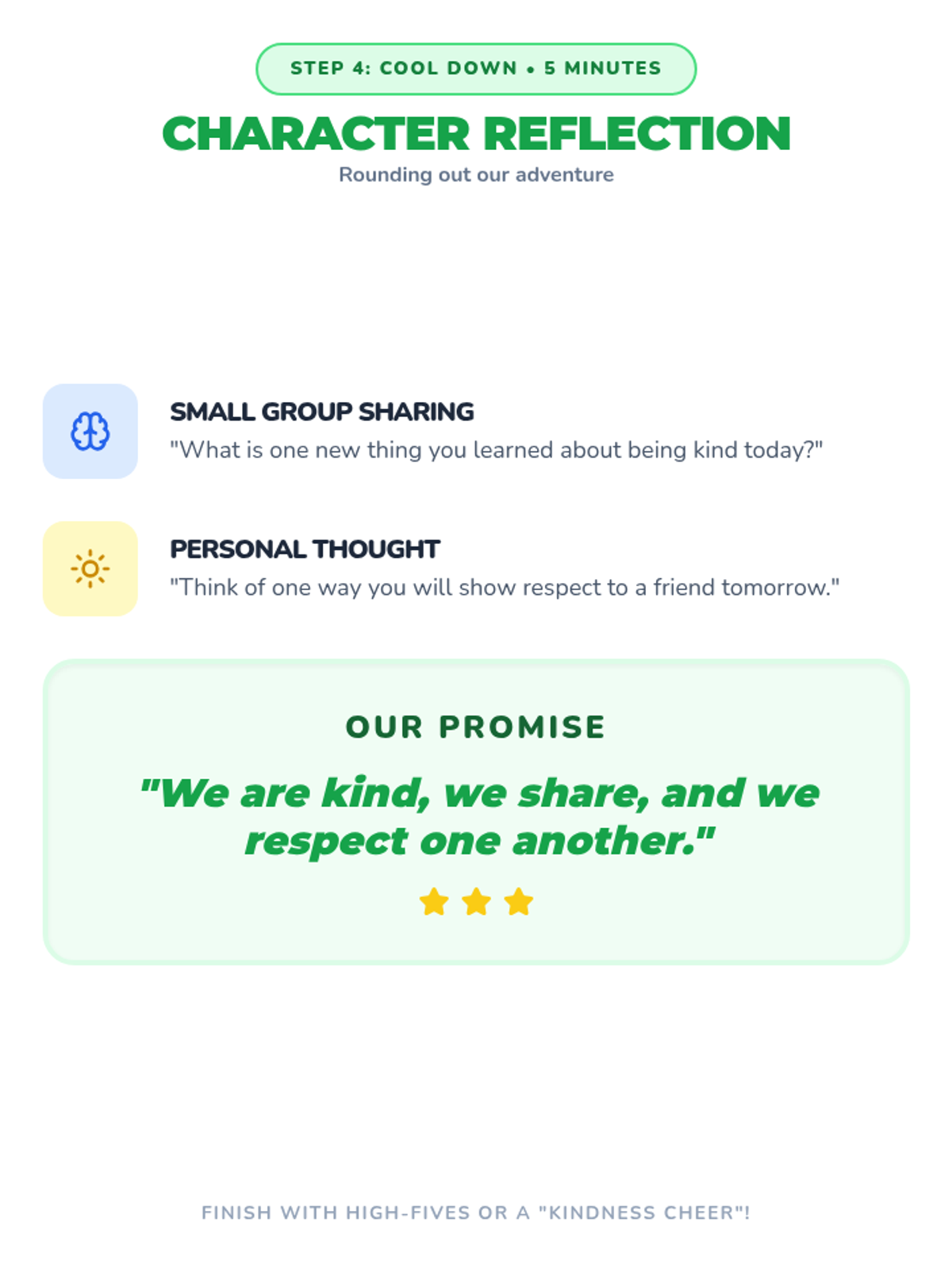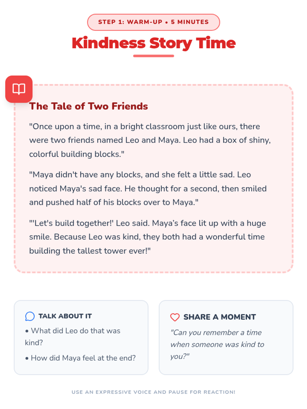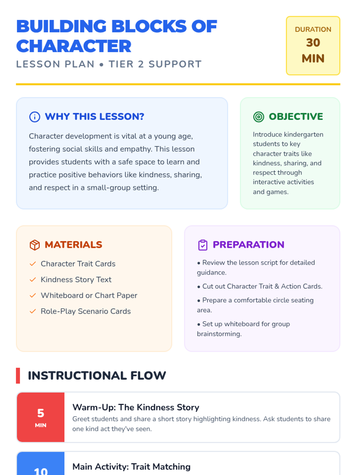 A 30-minute Tier 2 small group lesson for kindergarten students focusing on kindness, sharing, and respect through interactive play and discussion.