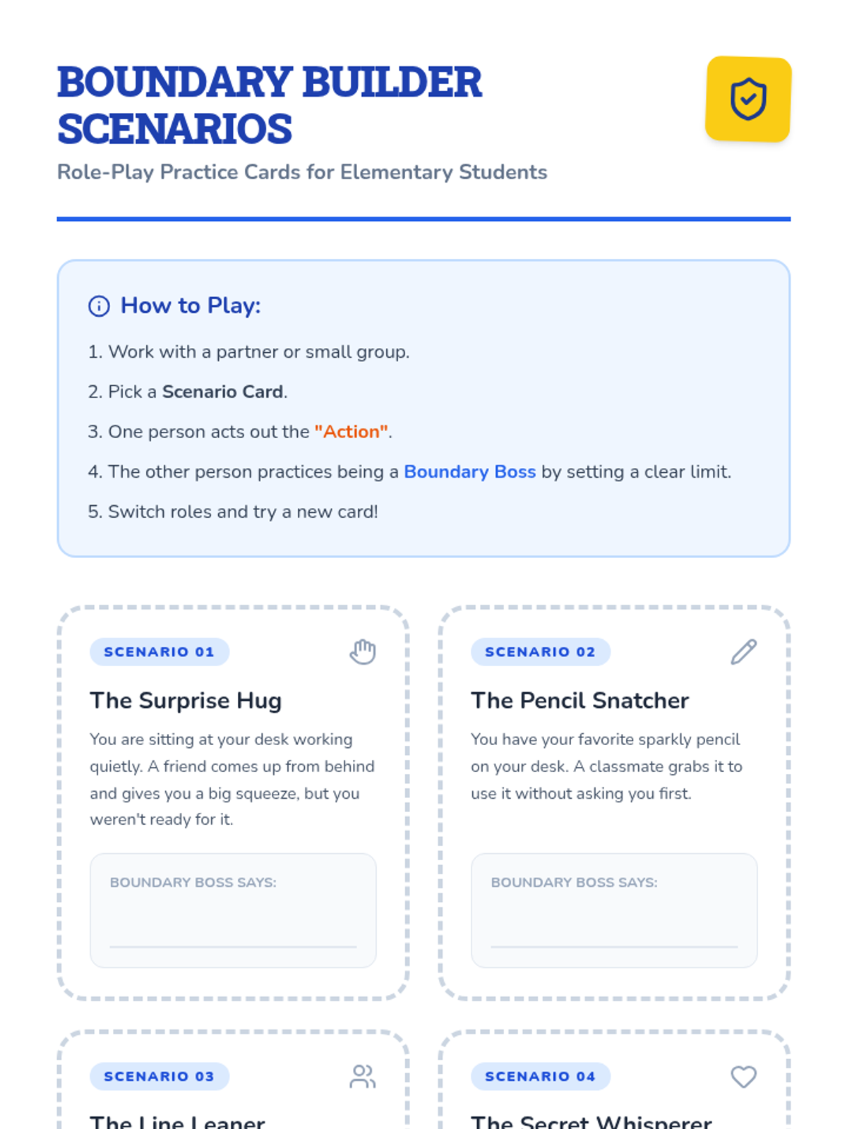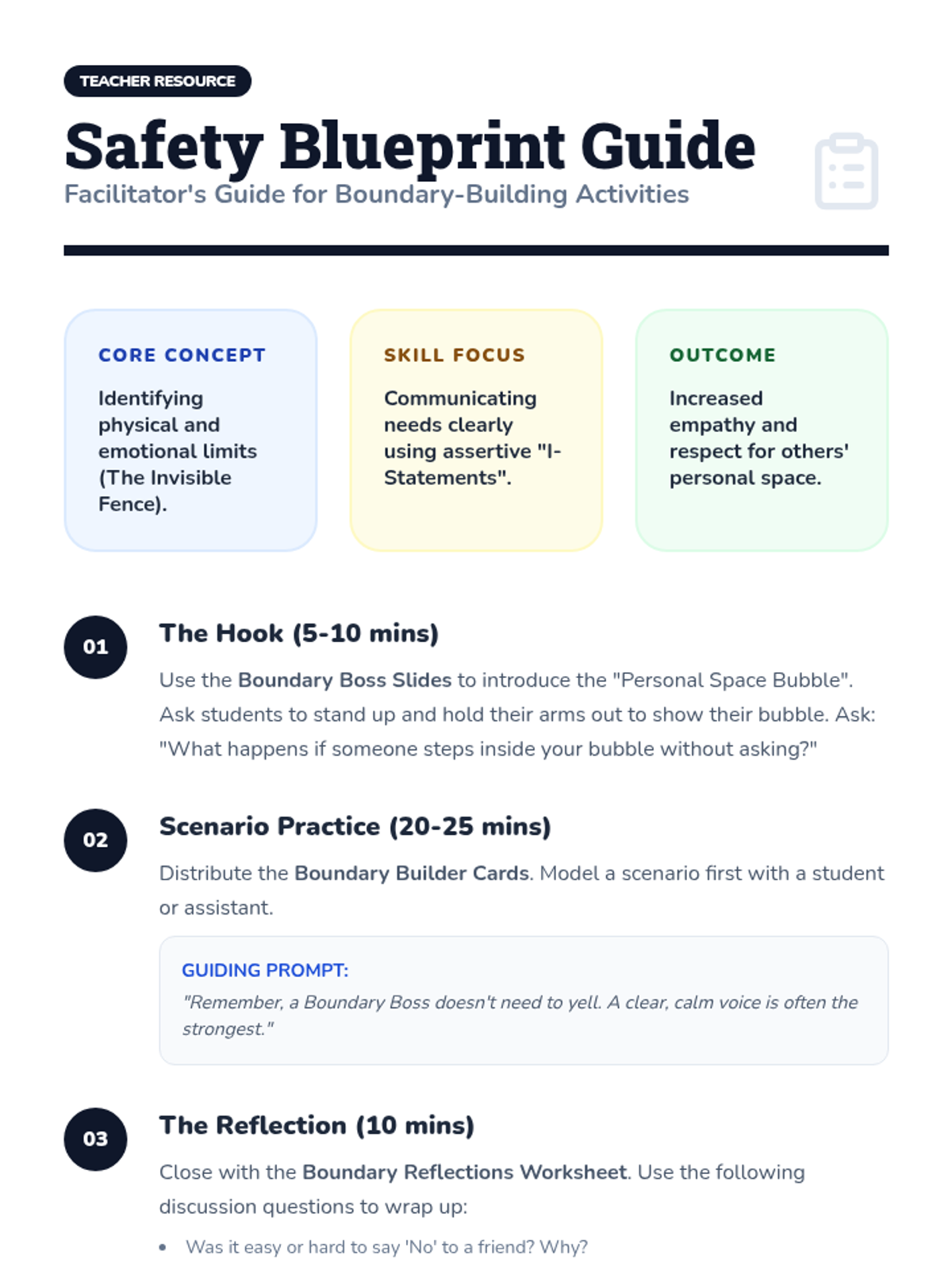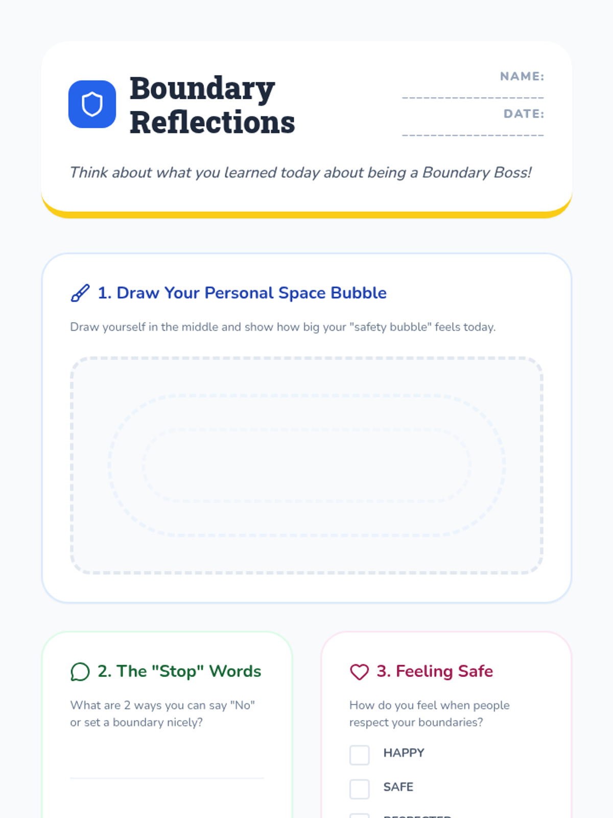 A lesson helping elementary students understand and practice personal boundaries through role-playing and hands-on activities. Students will learn to identify their comfort zones and communicate their needs effectively.
