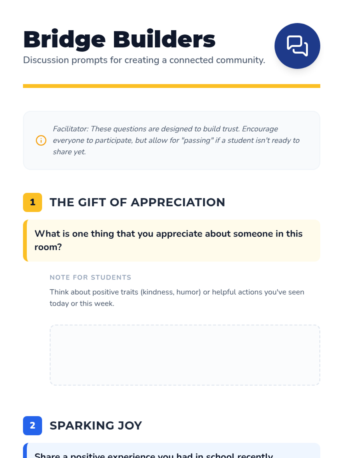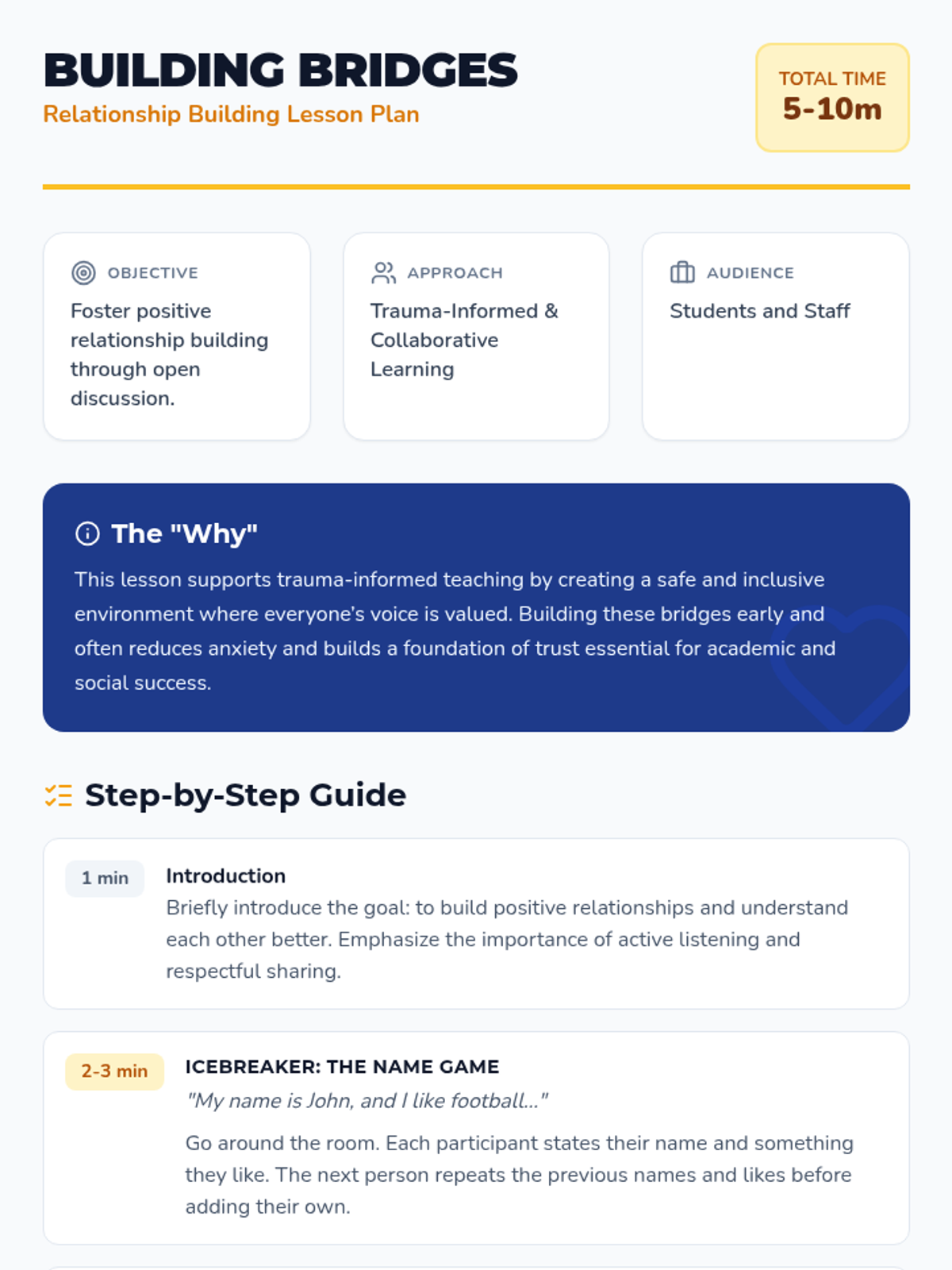 A short, impactful lesson designed to foster positive relationships between staff and students through open dialogue and trauma-informed practices.