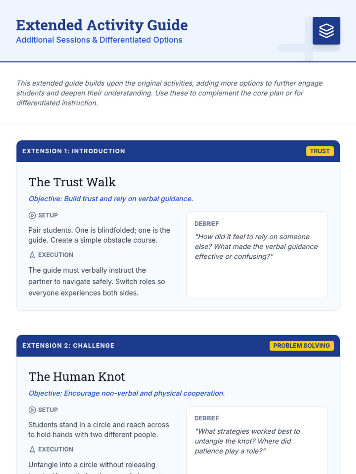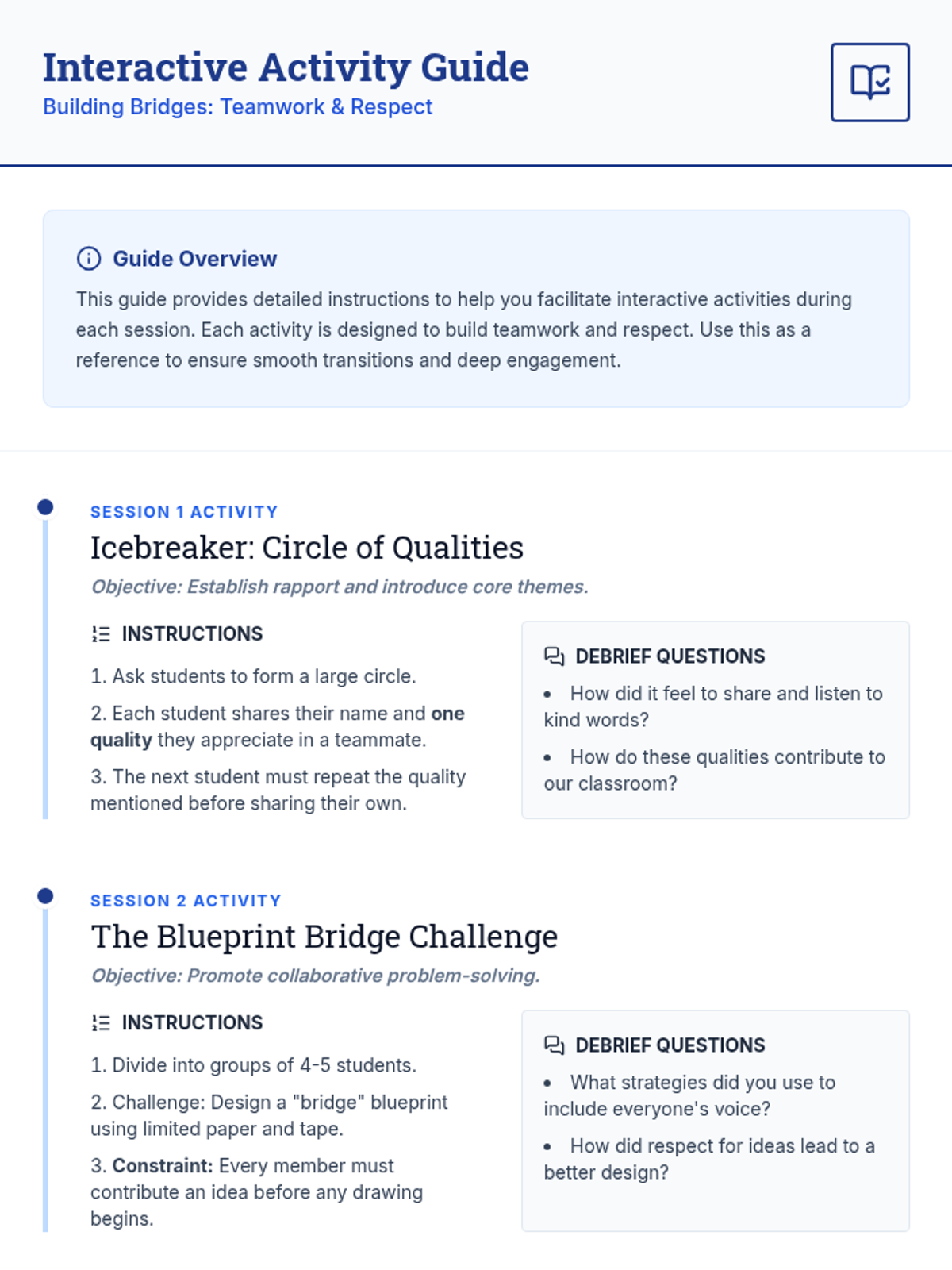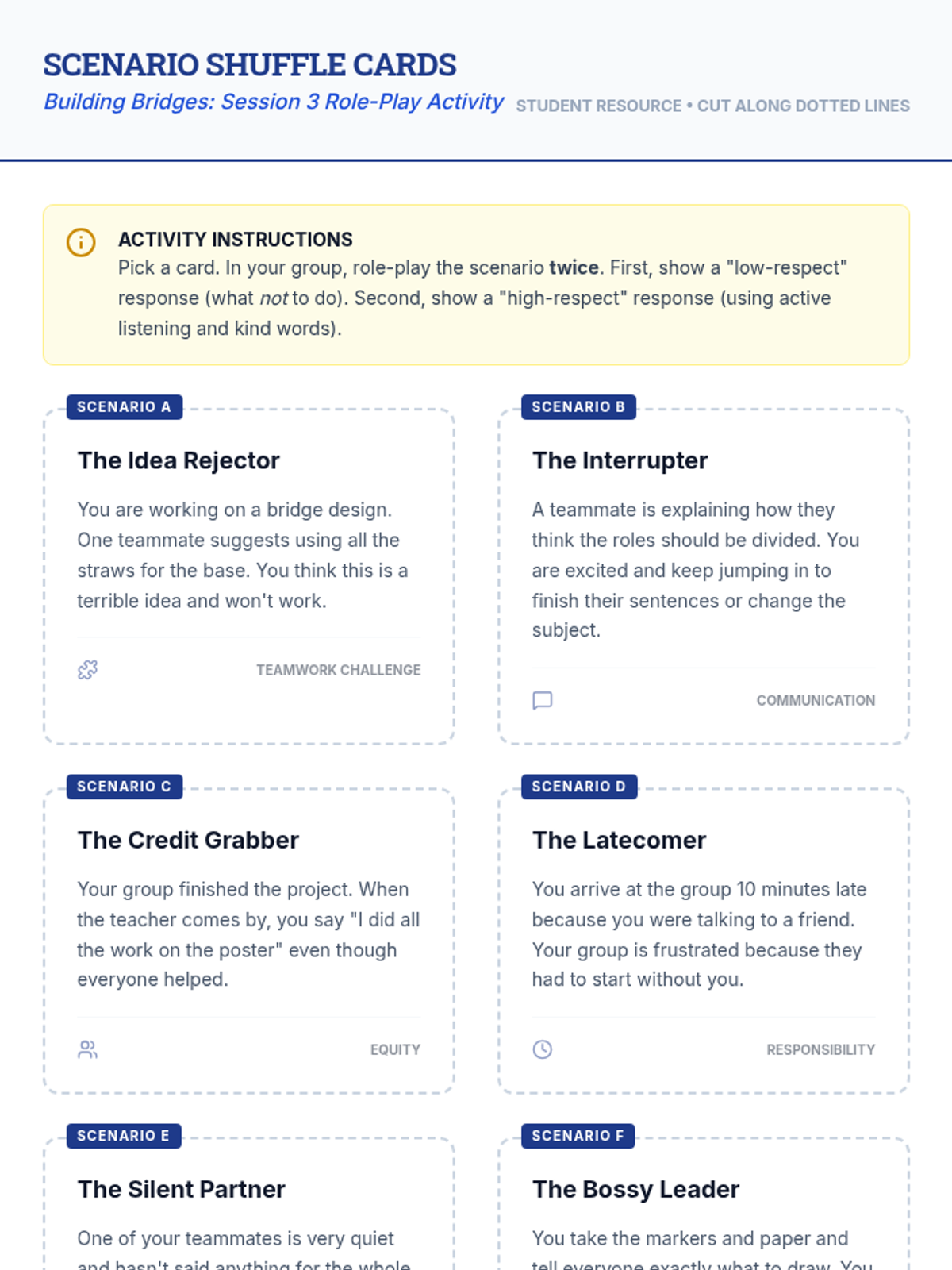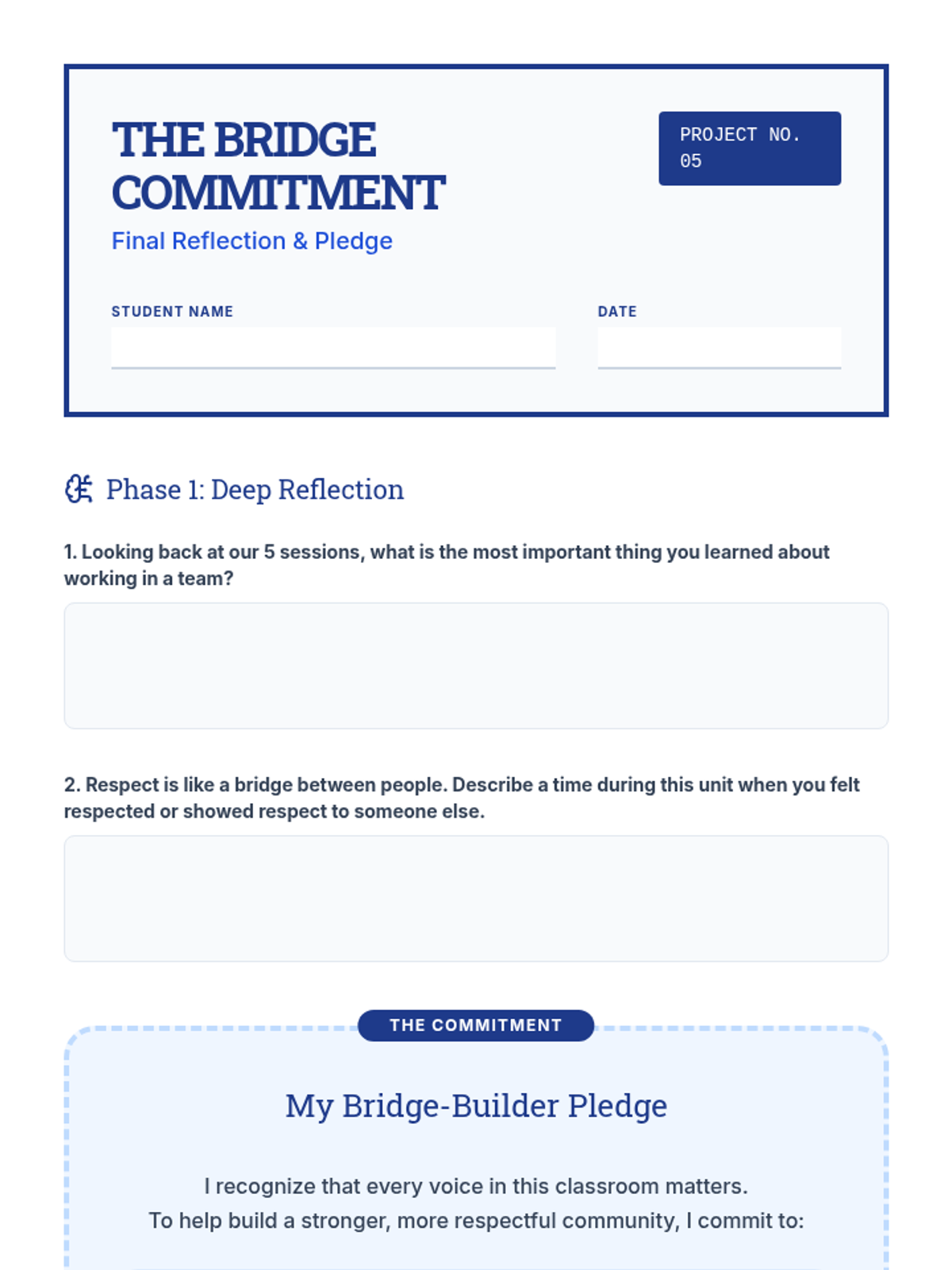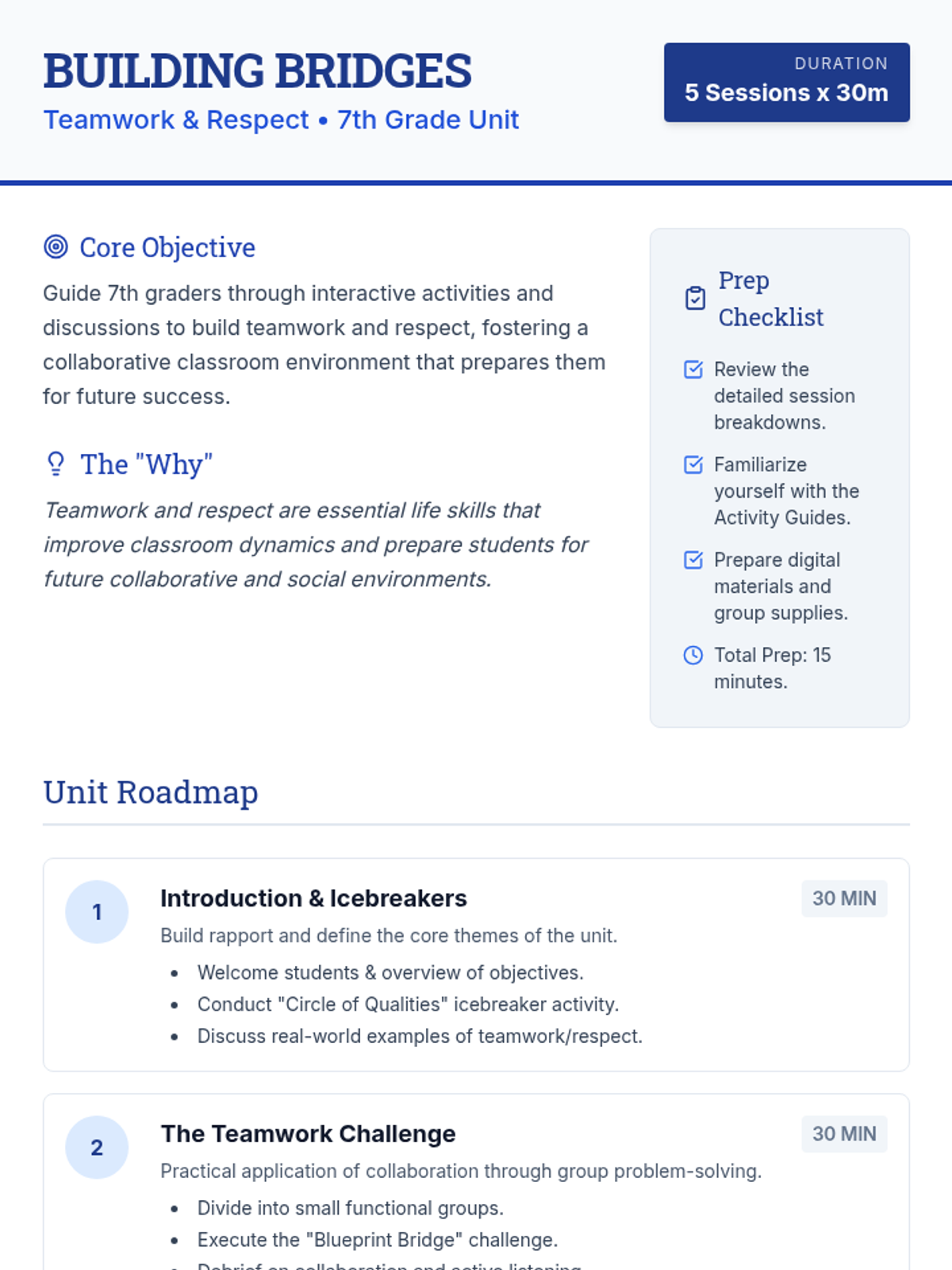 A comprehensive 5-session unit that guides students through icebreakers, problem-solving challenges, and reflection to develop strong teamwork and respectful communication habits.