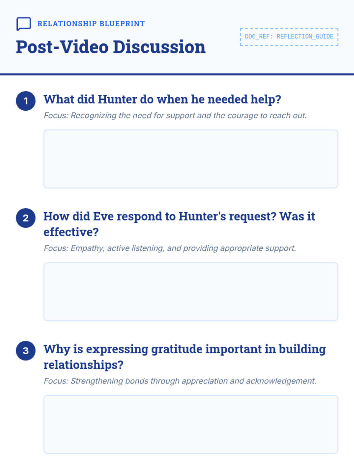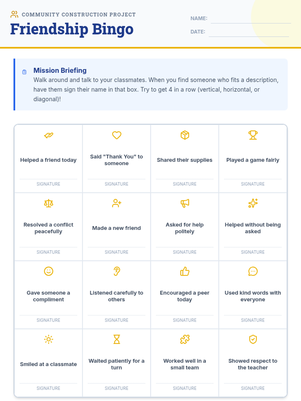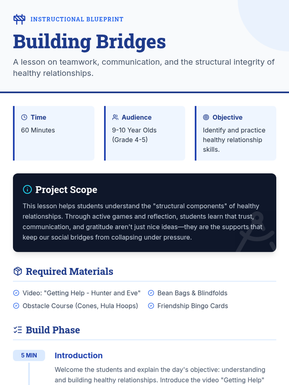 A social-emotional learning lesson for 4th-5th graders focused on teamwork, communication, and gratitude to build healthy relationships. Students engage with a video, a trust-based obstacle course, and a peer interaction bingo game.