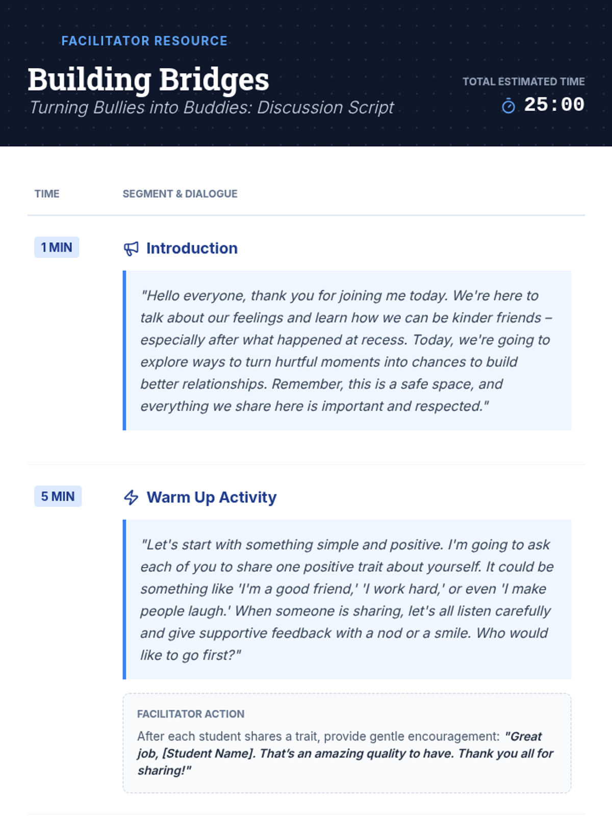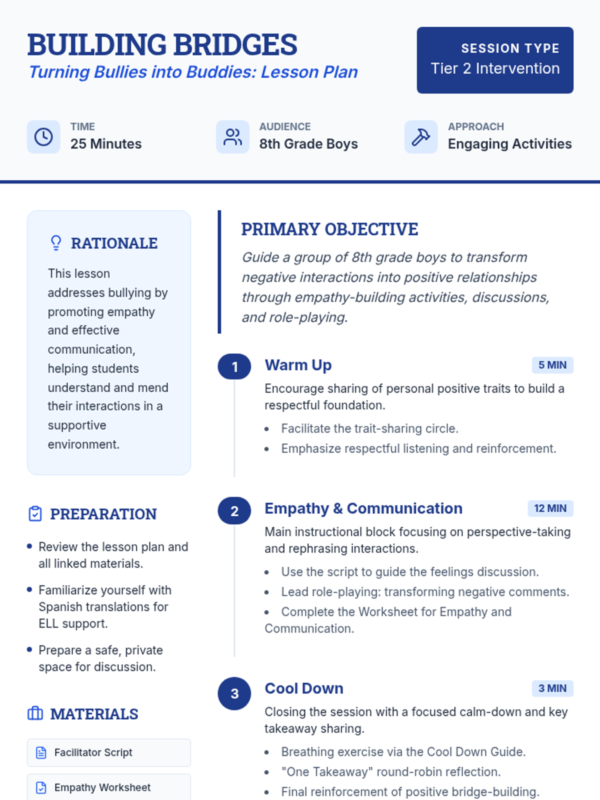 A Tier 2 intervention lesson for 8th grade boys focused on transforming bullying behaviors into positive relationships through empathy and communication skills.