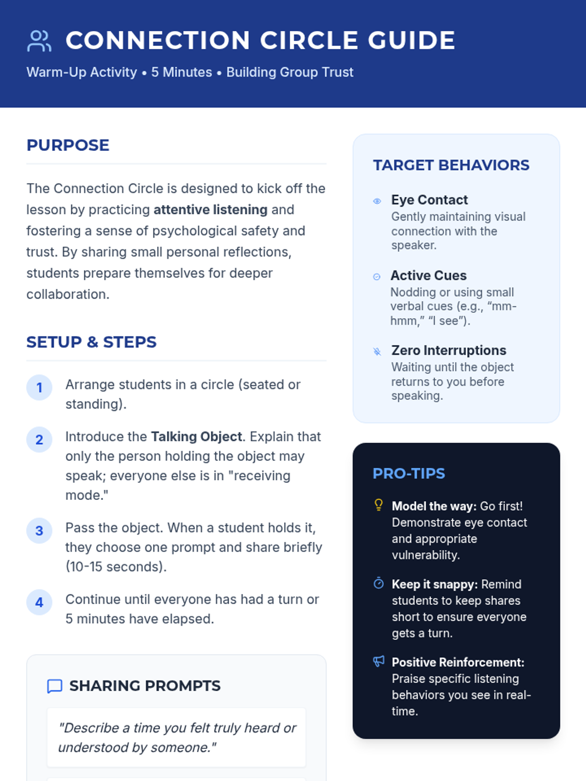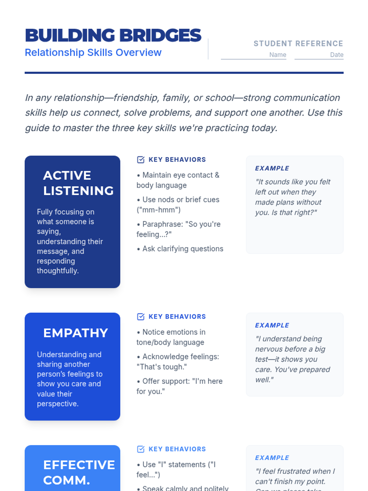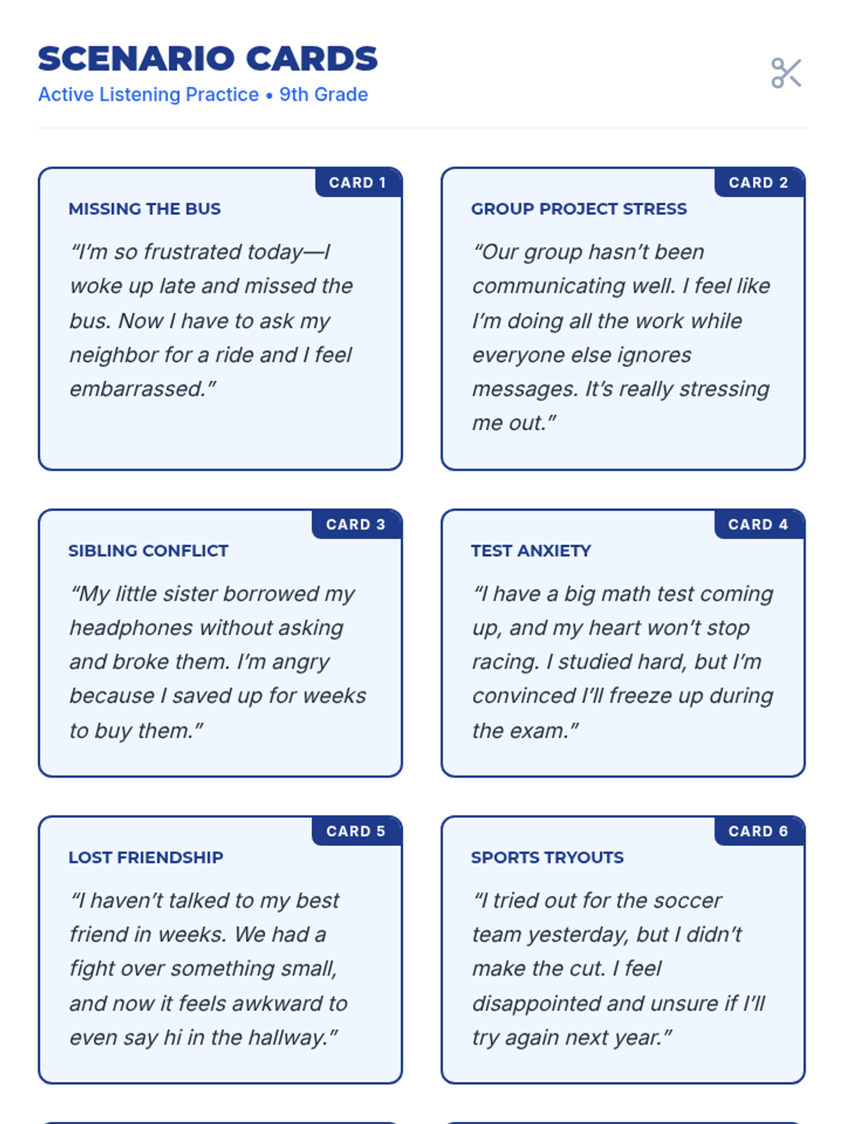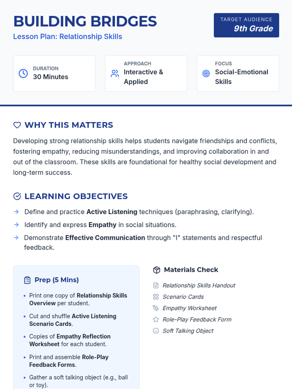 A 30-minute SEL lesson for 9th graders focusing on active listening, empathy, and effective communication through interactive activities and role-plays.