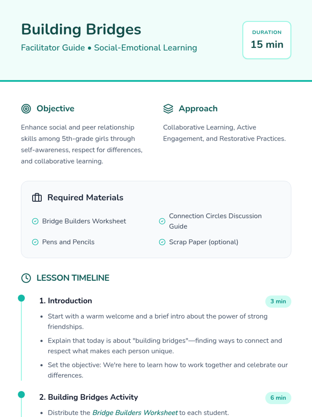 A lesson designed for 5th-grade girls to enhance social skills and peer relationships through collaborative activities, focusing on self-awareness and respecting differences.