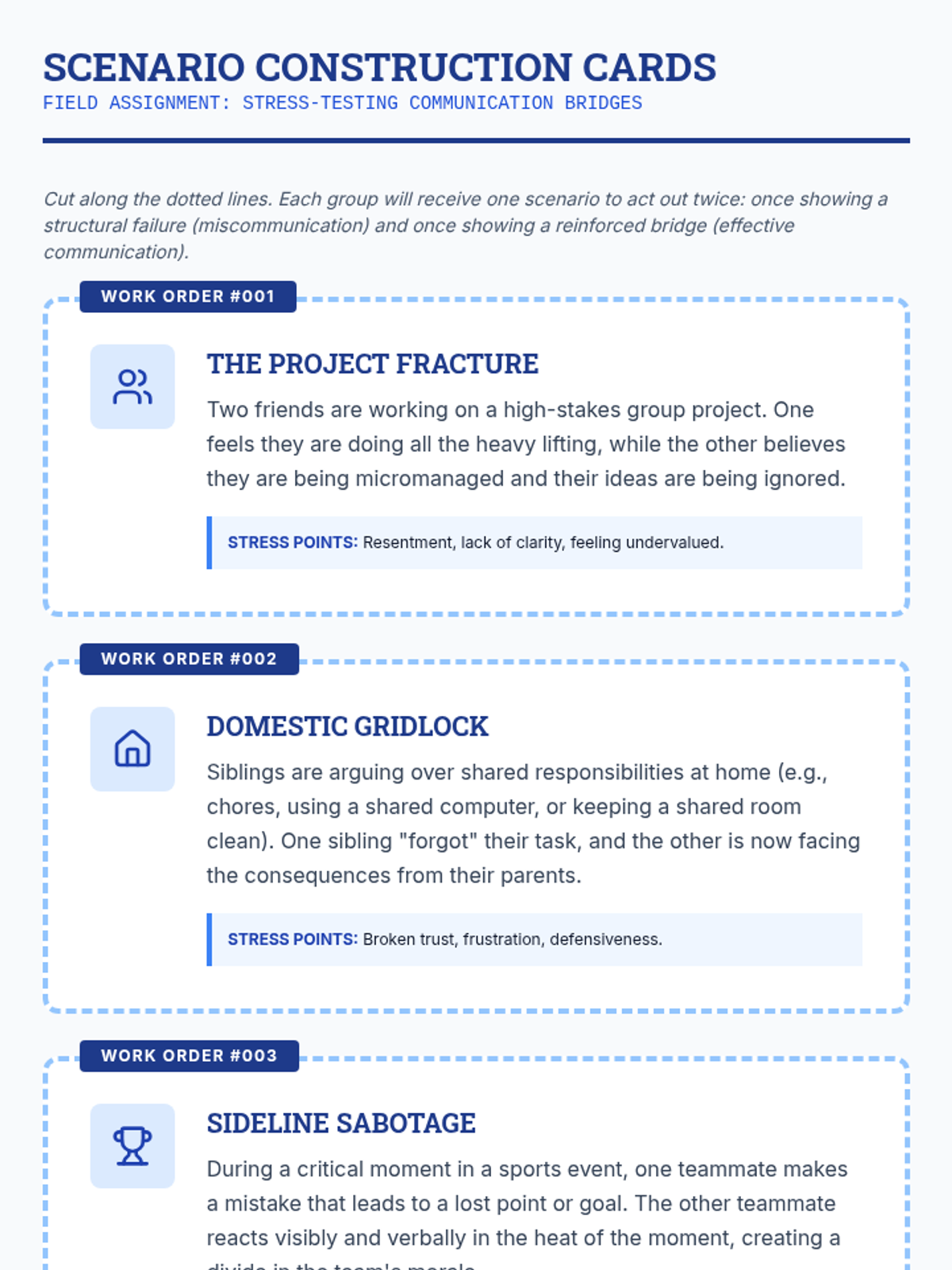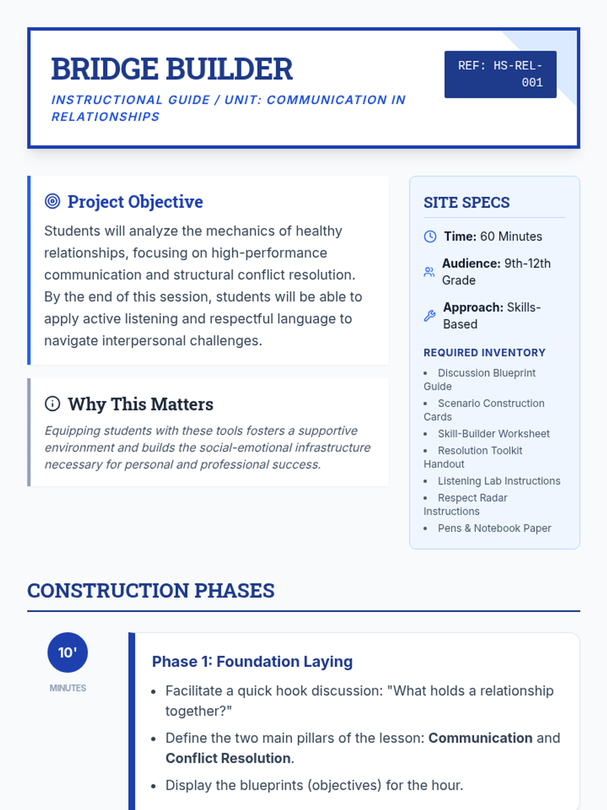 A comprehensive lesson for high school students on healthy relationship communication and conflict resolution using an architectural 'bridge building' theme.