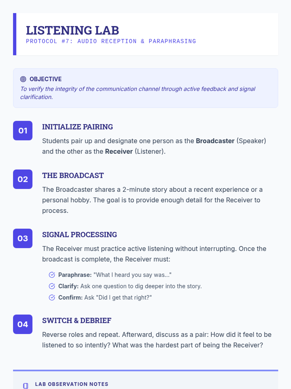Developing advanced listening skills, including paraphrasing and validating others' perspectives in English.