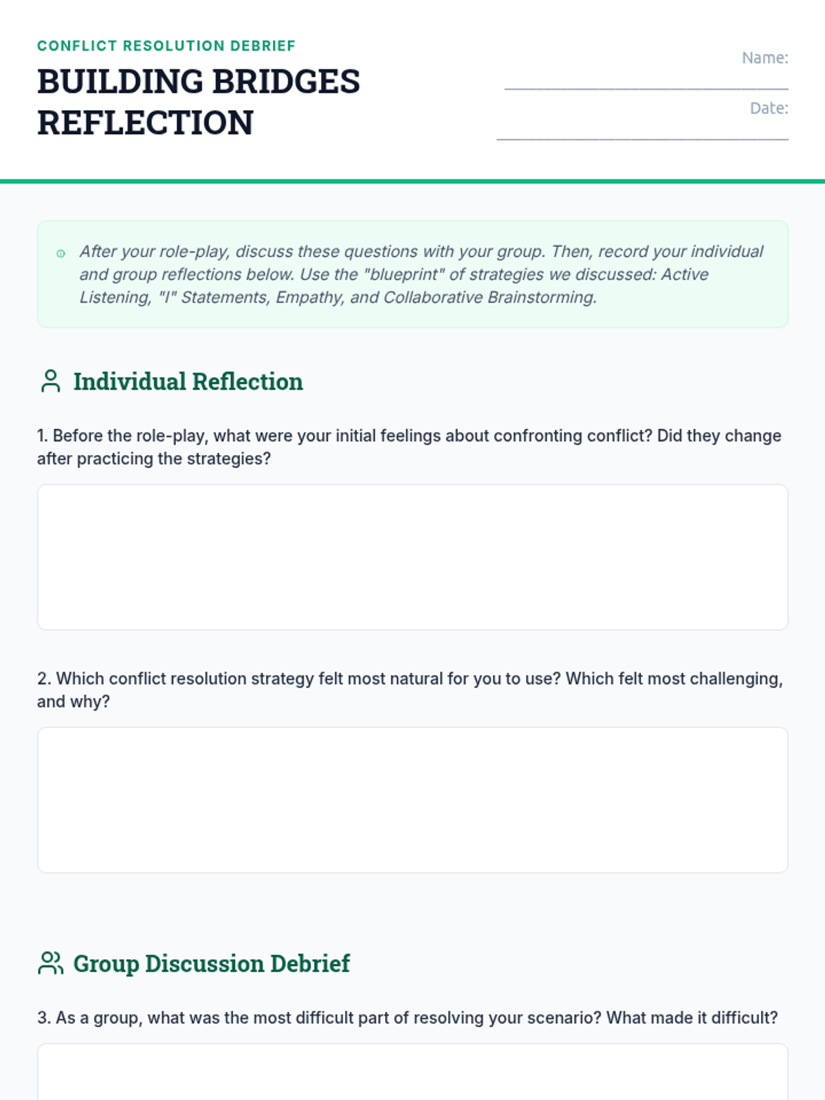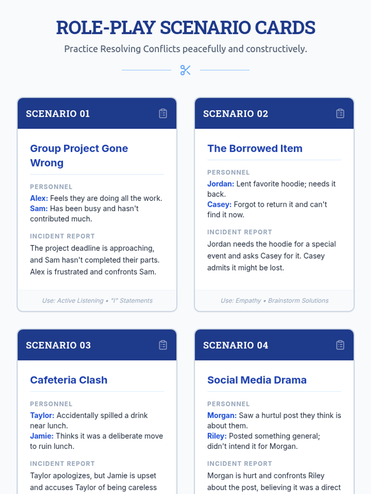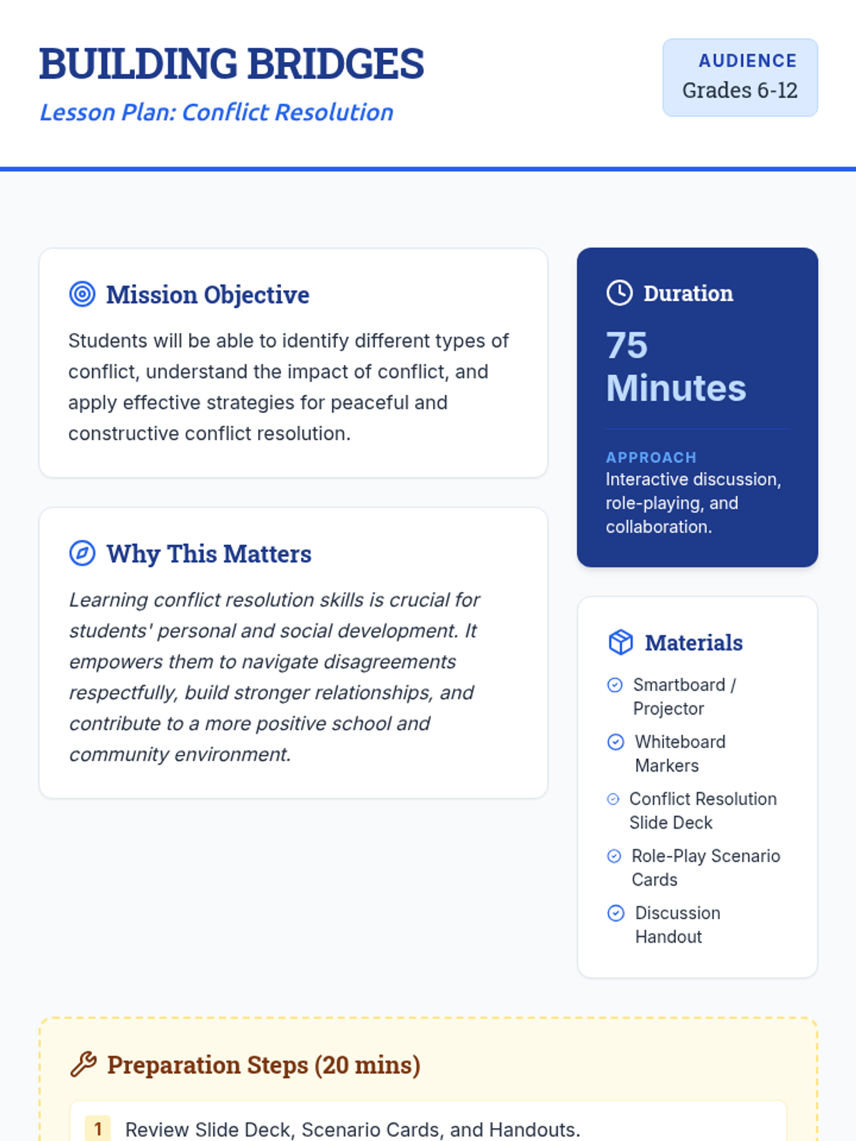 A comprehensive lesson designed for grades 6-12 to teach students how to navigate interpersonal conflicts using empathy, active listening, and collaborative problem-solving strategies.
