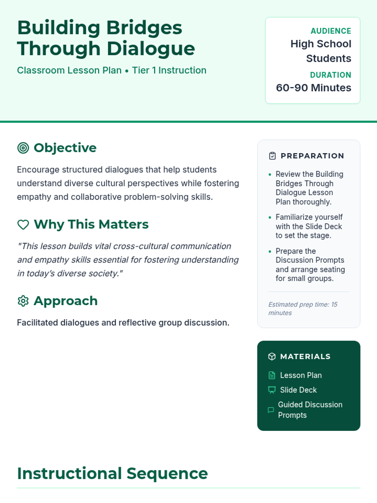 A high school lesson focused on fostering cross-cultural understanding through structured dialogue and empathy-building communication strategies.