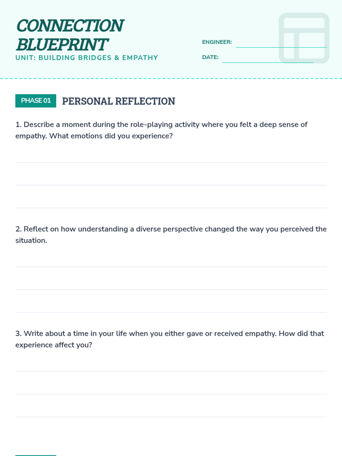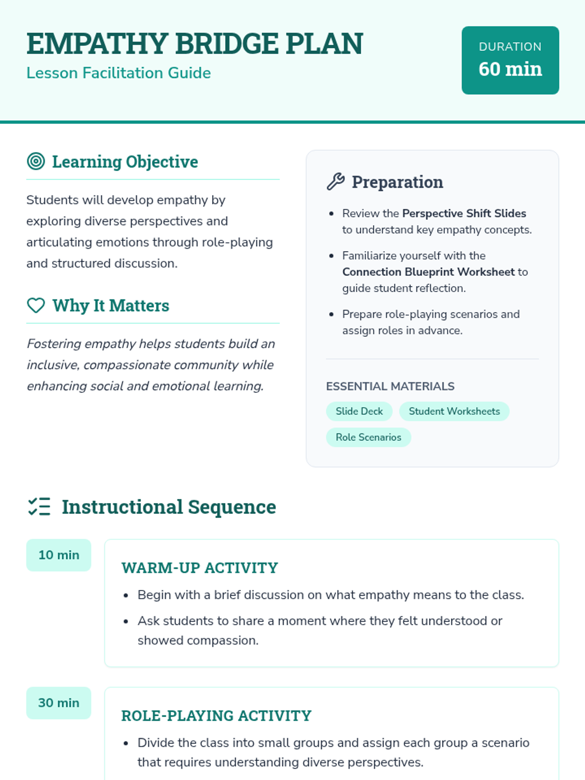 A lesson for middle school students to develop empathy through role-playing and discussion, focusing on understanding diverse perspectives and articulating emotions.