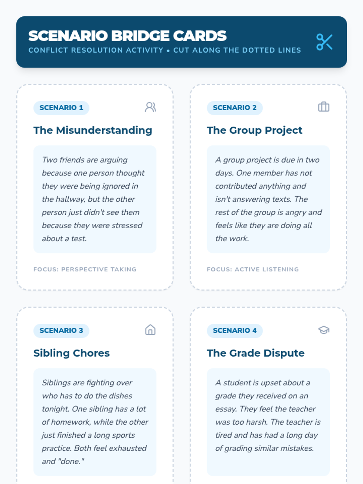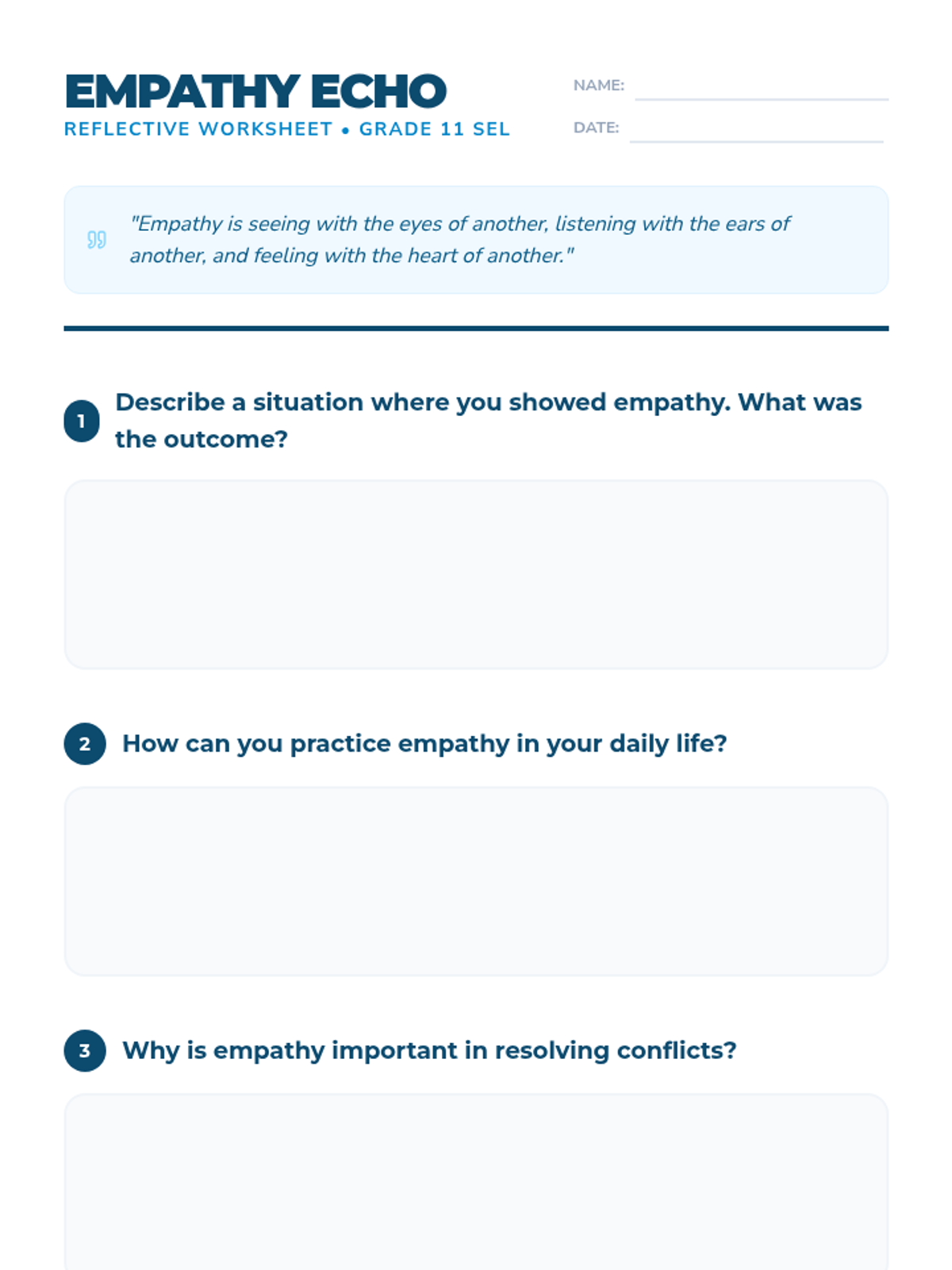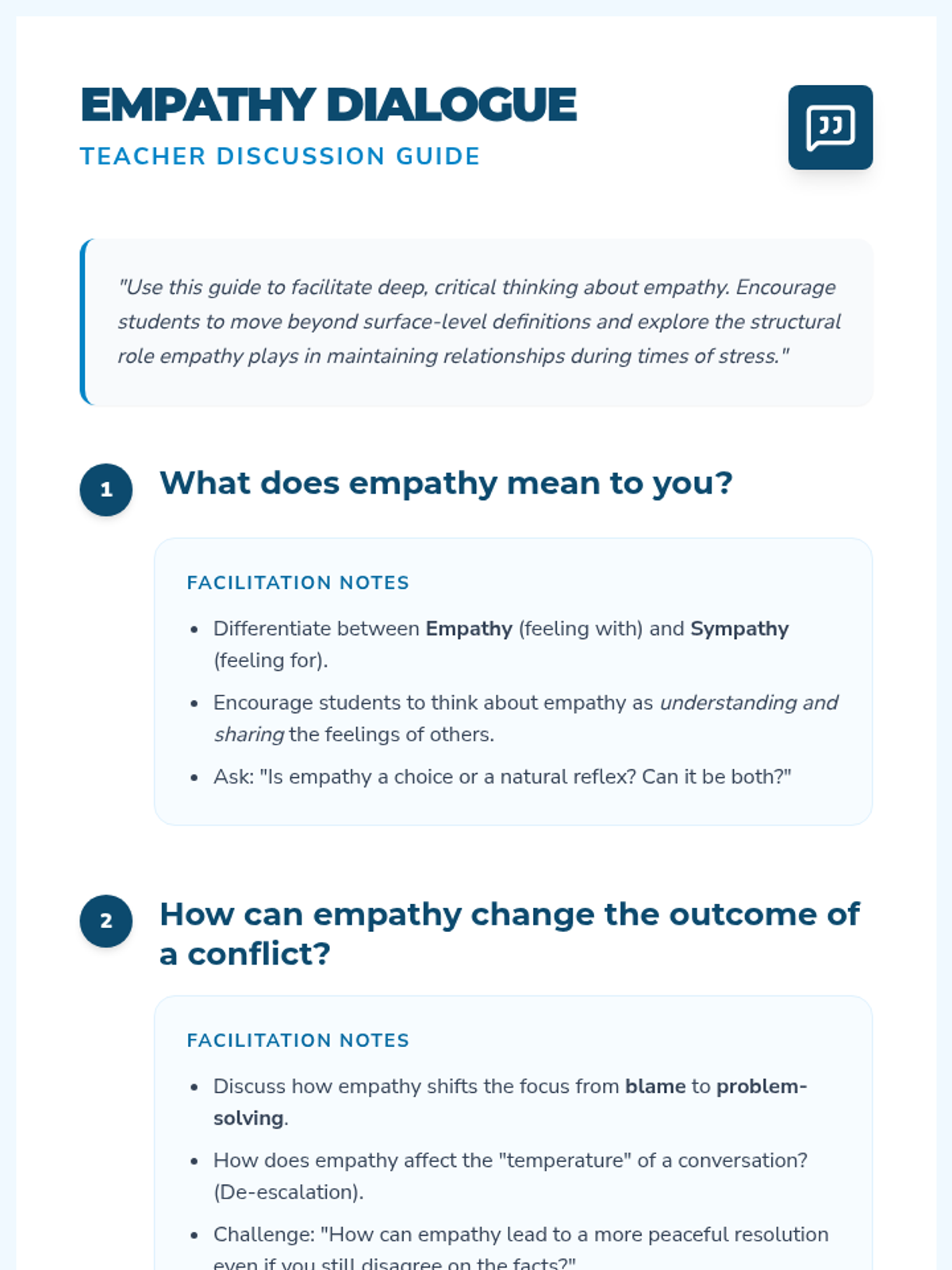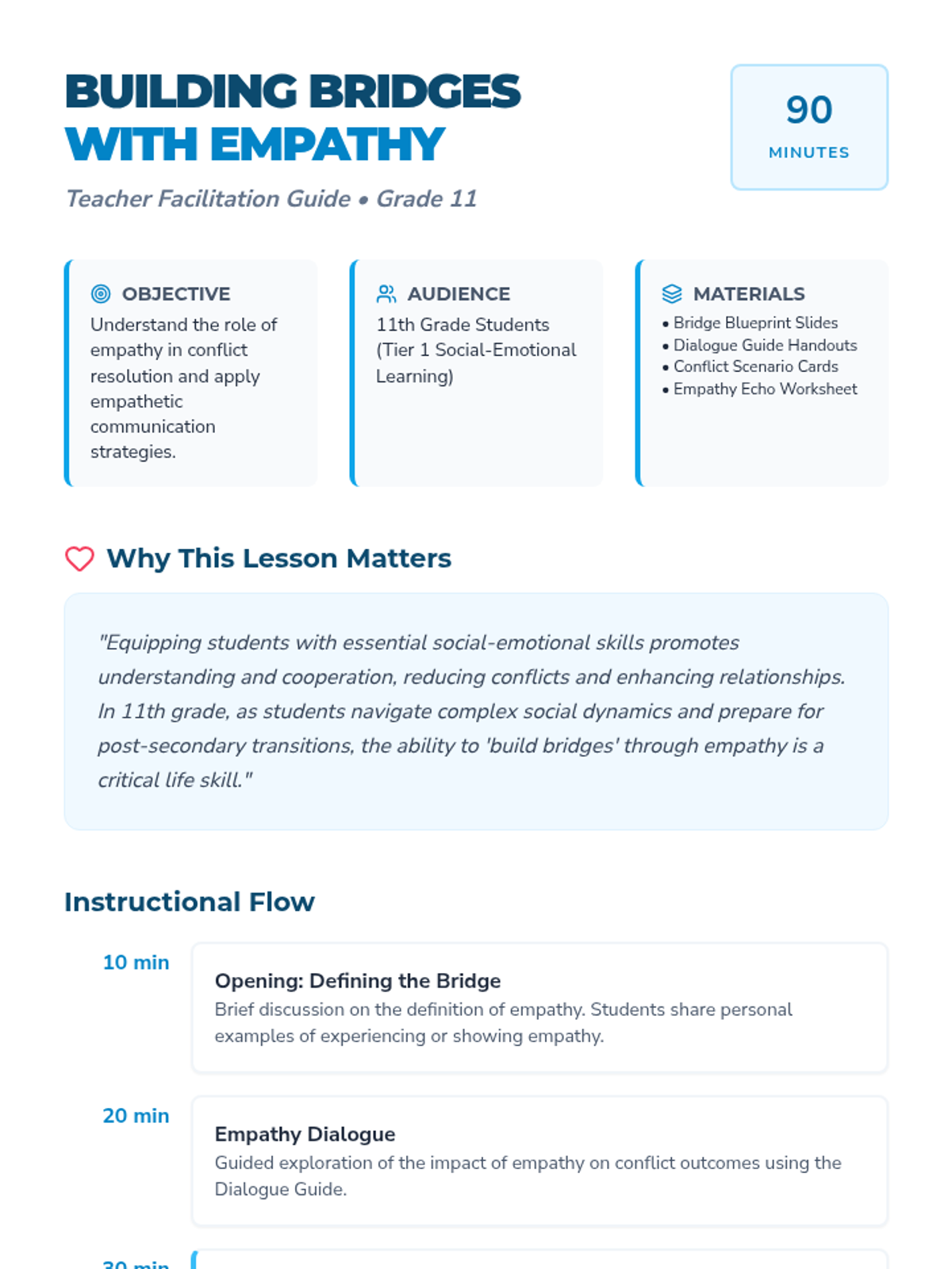 An 11th-grade lesson exploring how empathy serves as a tool for resolving conflicts and strengthening relationships. Students engage in discussions, role-plays, and self-reflection to build practical social-emotional skills.