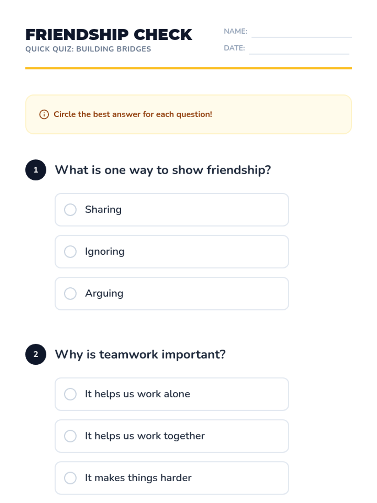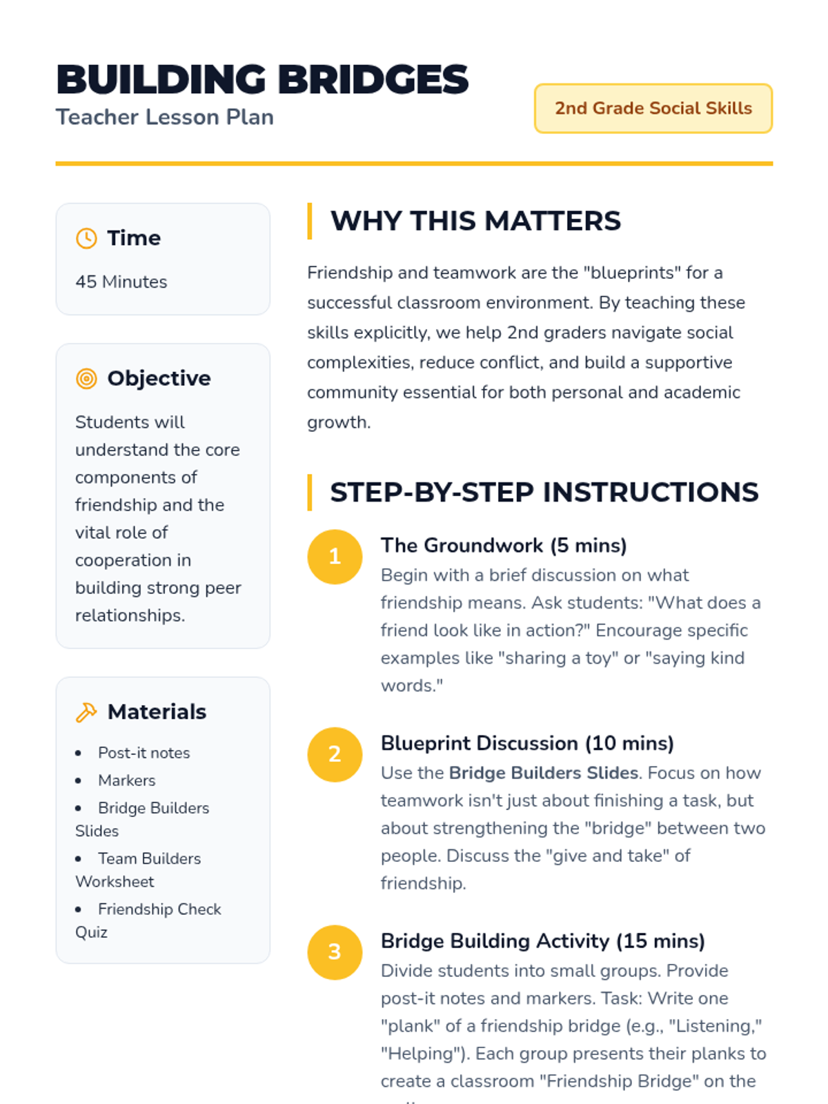 A lesson for 2nd-grade students on the essentials of friendship and cooperation, using a 'Bridge Builders' theme to teach social skills and teamwork.