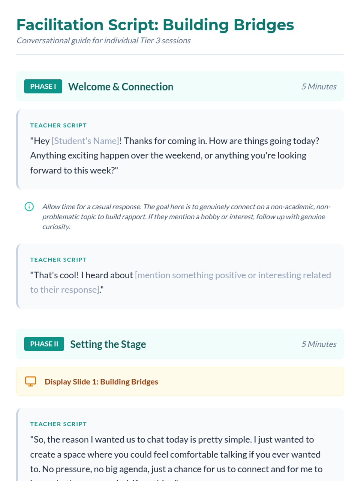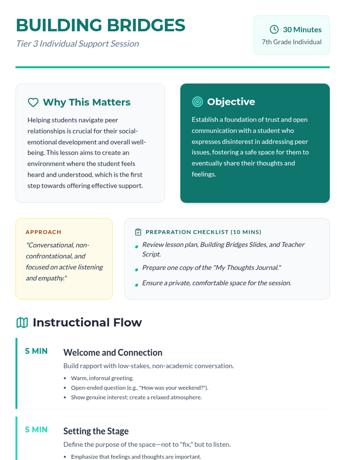 A Tier 3 individual session designed to build rapport and trust with a resistant 7th-grade student, focusing on gentle exploration of peer issues and establishing a safe space for communication.