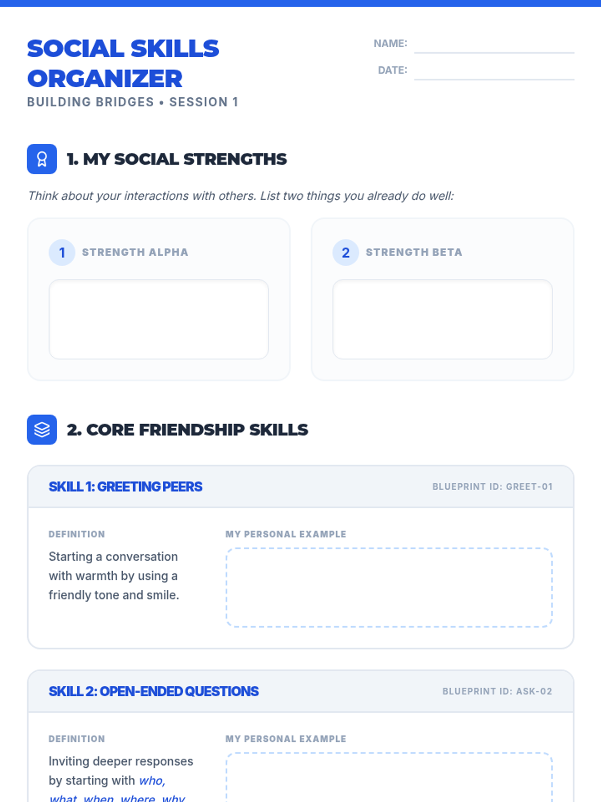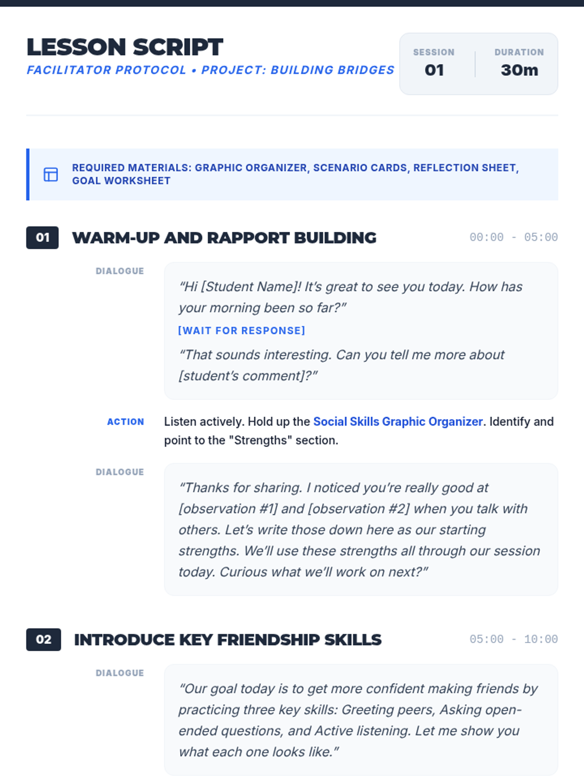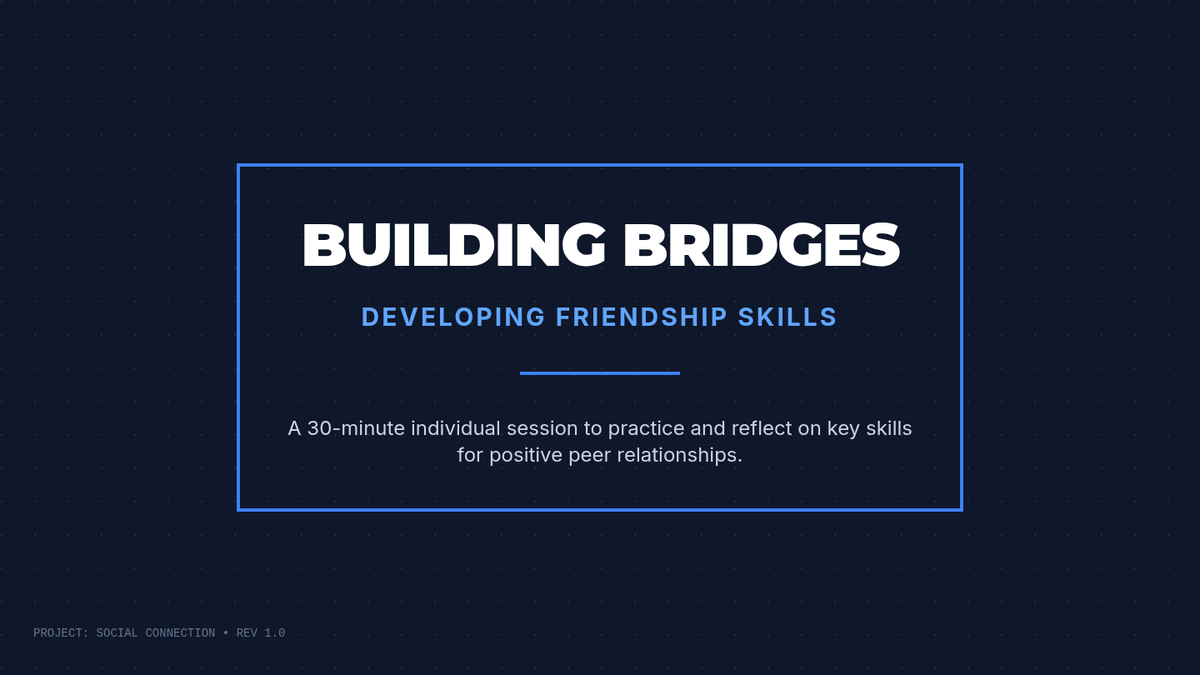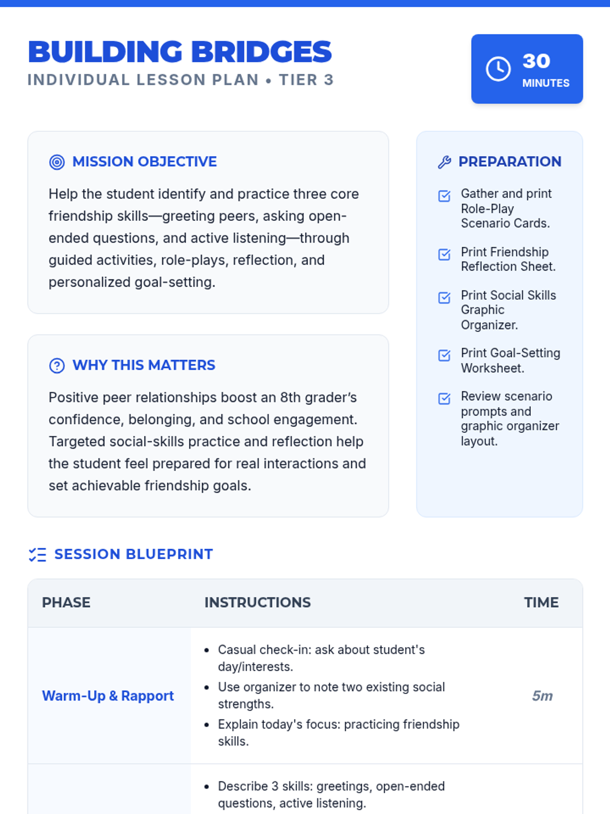 A 30-minute Tier 3 individual session for 8th-grade students focused on developing three core friendship skills: greeting peers, asking open-ended questions, and active listening. The lesson includes role-play, reflection, and SMART goal-setting.