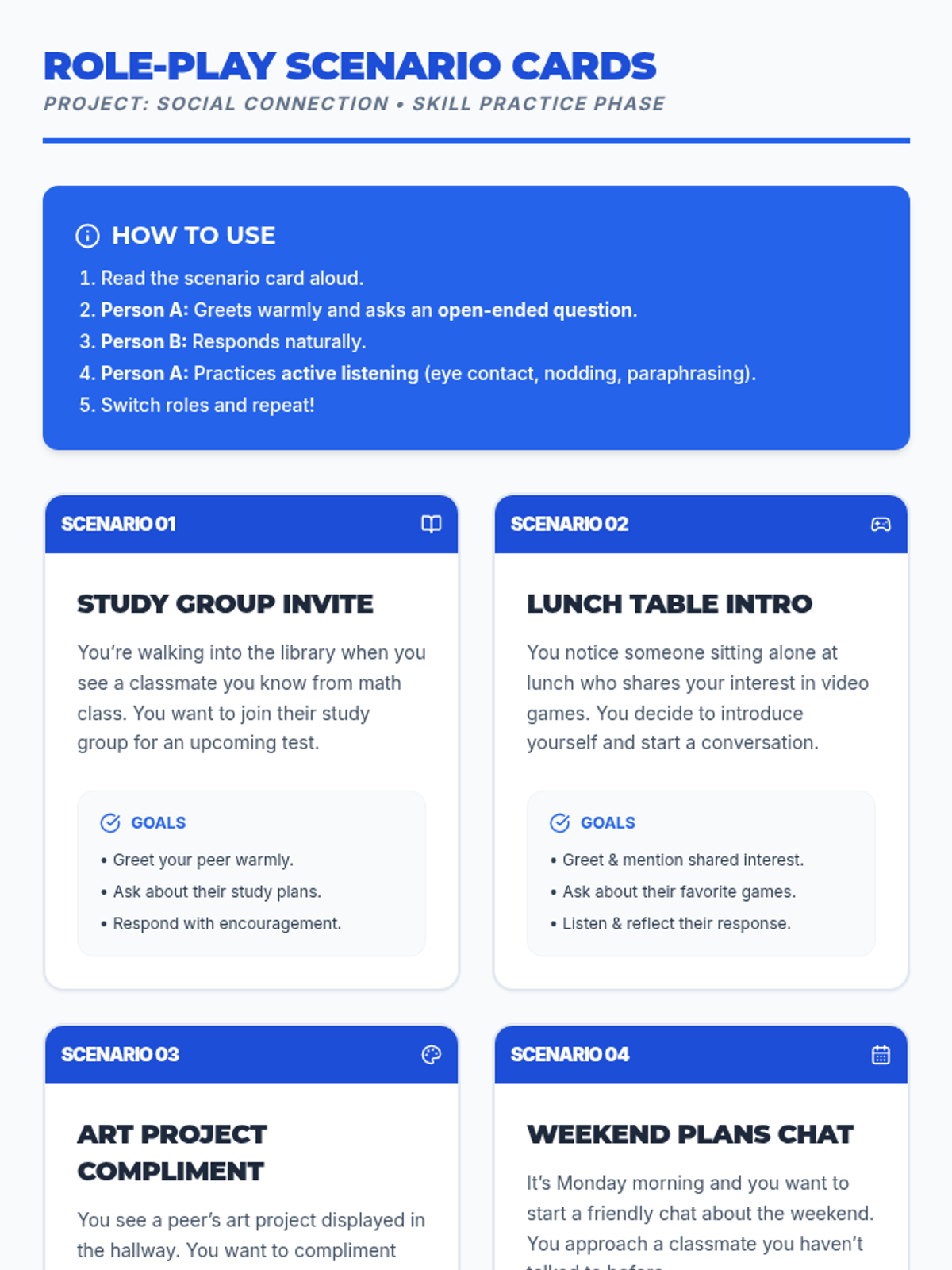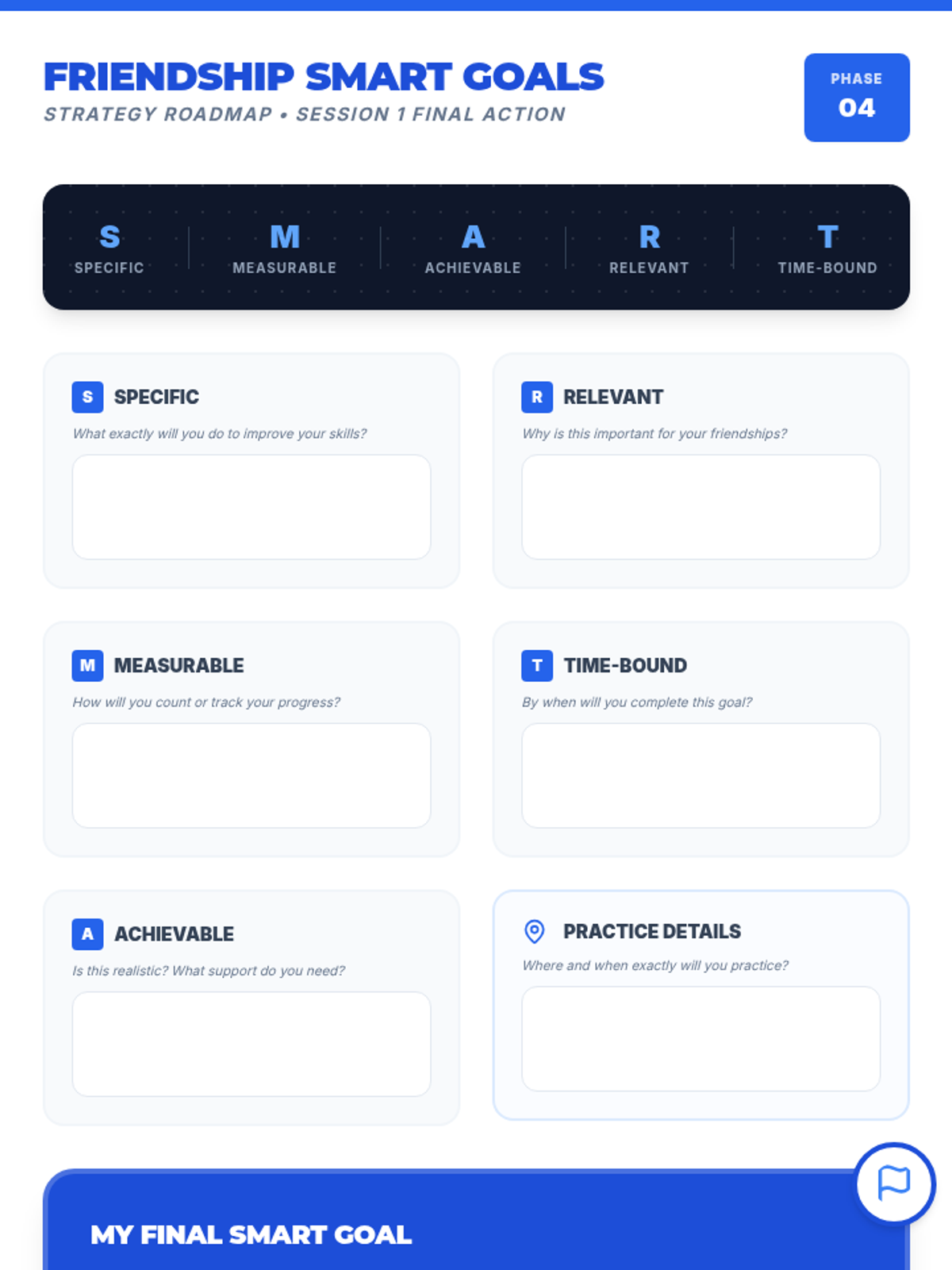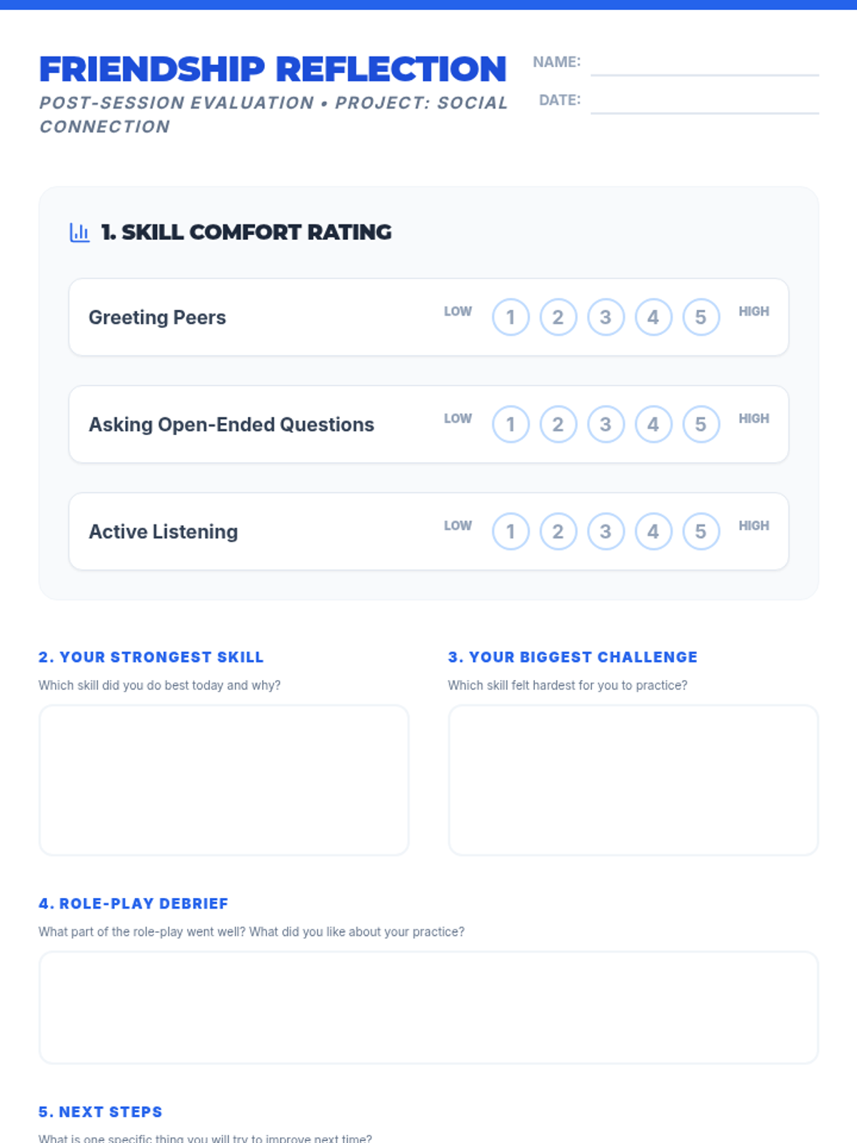 A 30-minute Tier 3 individual session for 8th-grade students focused on developing three core friendship skills: greeting peers, asking open-ended questions, and active listening. The lesson includes role-play, reflection, and SMART goal-setting.